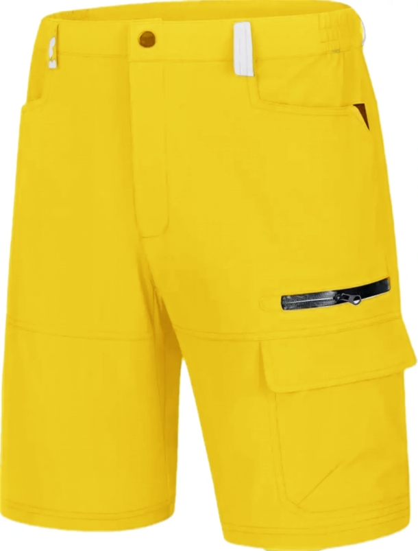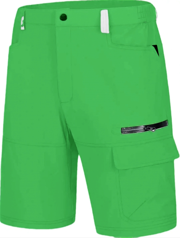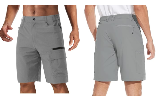 waterproofWaterproof: The Hiking Shorts are made ofwaterproof material, effectively repels stains and liquids5 Pockets: This men's quick dry short features 2 handpockets, 1 waterproof zipper pocket, 1 large cargo pocketat left thigh, 1 rear zipper pockets for the ultimateconvenience and efficiencyDesign: Men's cargo shorts features a partial elasticwaist, button closure with zip fly. Elastic waist with beltloop offer more flexible for a personalized fit.lts innerlength is 9 inches