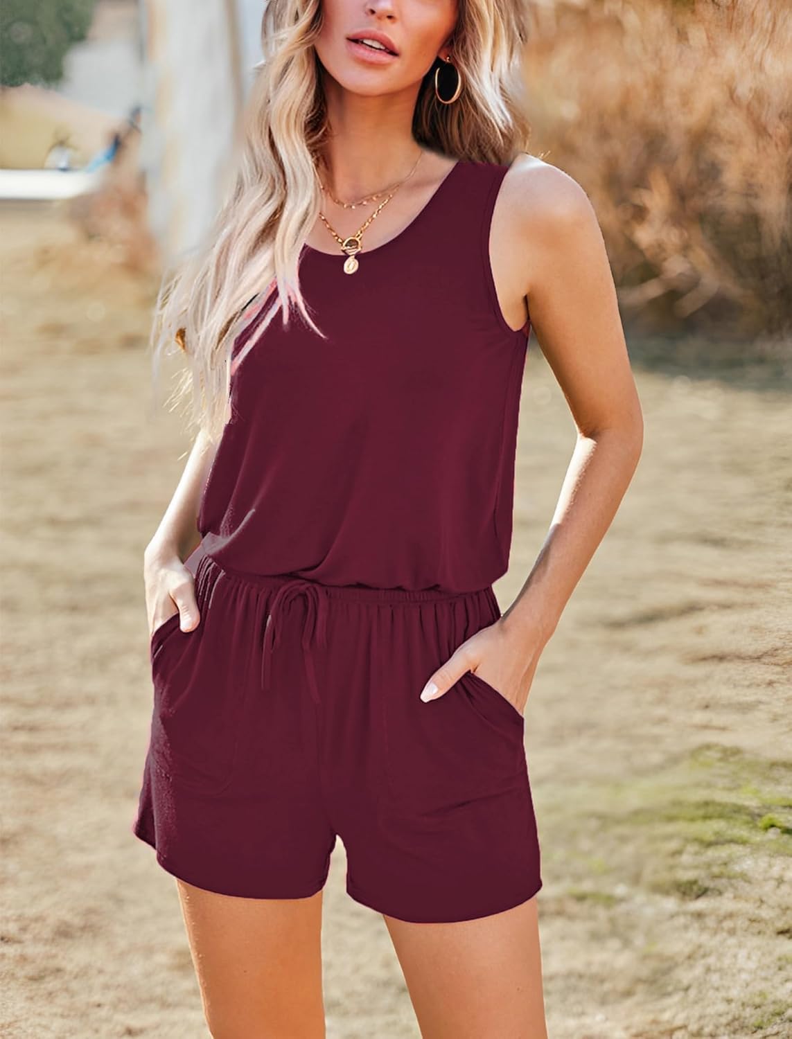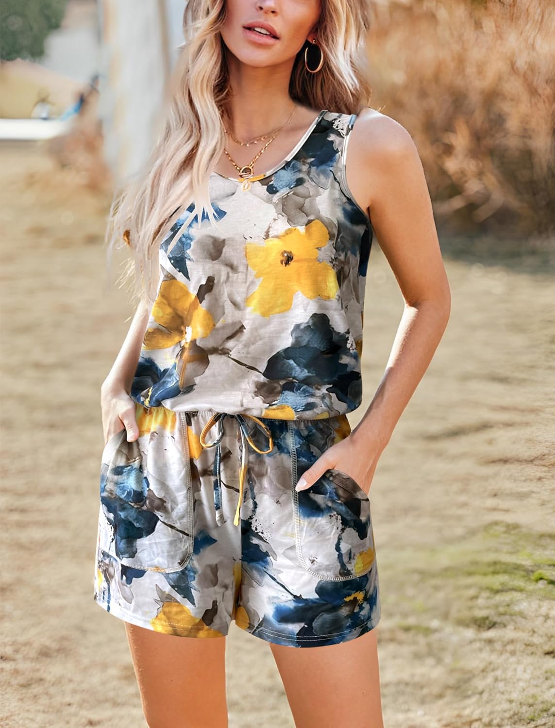 Loose Casual One Piece Short Jumpsuits feature with scoop neck, sleeveless, adjustable waist drawstring, two side pockets, wide legs design. Easy to match Shoes. The tank romper is Perfect for summer and spring weather.