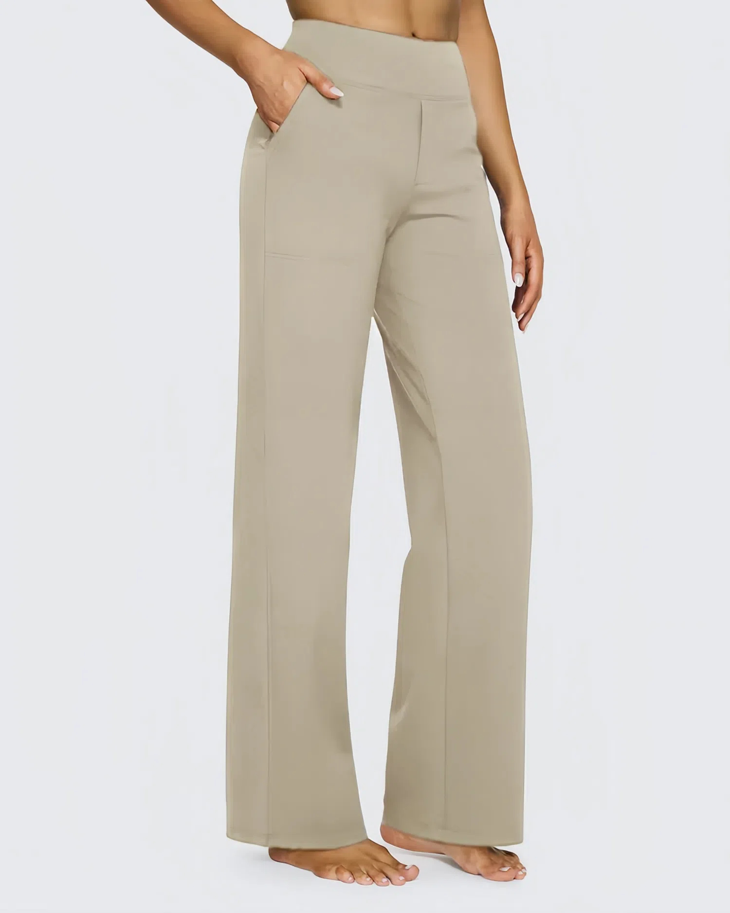 Elevate your wardrobe with these stylish and comfortable yoga pants, designed for both yoga and daily wear.Crafted from skin-friendly, soft, and moisture-wicking fabric at a thickness of 0.61-0.64mm, these pants provide luxurious comfort and flexibility, making them perfect for yoga and casual outings.Ultra Stretchy Fabric: Made from 81% Polyester and 19% Spandex, these pants offer a comfortable fit that moves with you.High Waist Design: The high waist and streamlined hips beautifully contour your curves, providing a flattering fit for all body types.2 Front Functional Pockets: Equipped with 2 front functional pockets for convenient storage, allowing you to carry small items like keys or a phone.2 Decorative Back Pockets: Equipped with 2 decorative back pockets for added convenience.Faux Fly Design: The faux fly design gives you a business dressy and classic look.Versatile Style: These pants can be styled with your favorite tops and footwear for a comfortable and stylish look.Full-Length Design: The wide leg design offers versatility for various occasions, from casual outings to more formal events.Additional Information:Material: 81% Polyester,19% SpandexCare Instructions: lo keep clean, use a lint roller for aquick refresh.Size Chart: Available in sizes 29/31/33" for a better fit.Elevate your wardrobe with these versatile and comfortable yoga pants, perfect for any occasion.