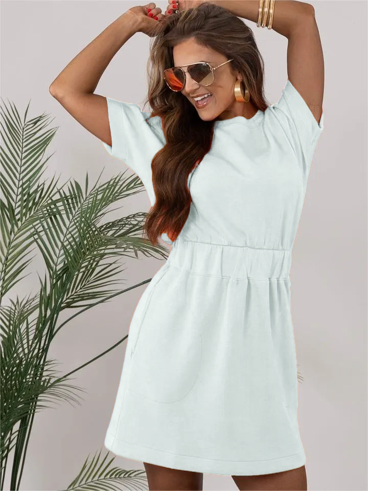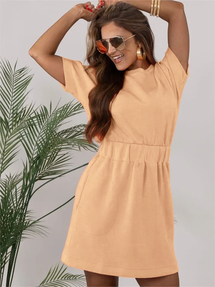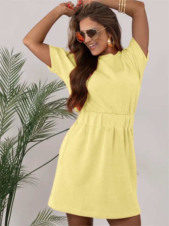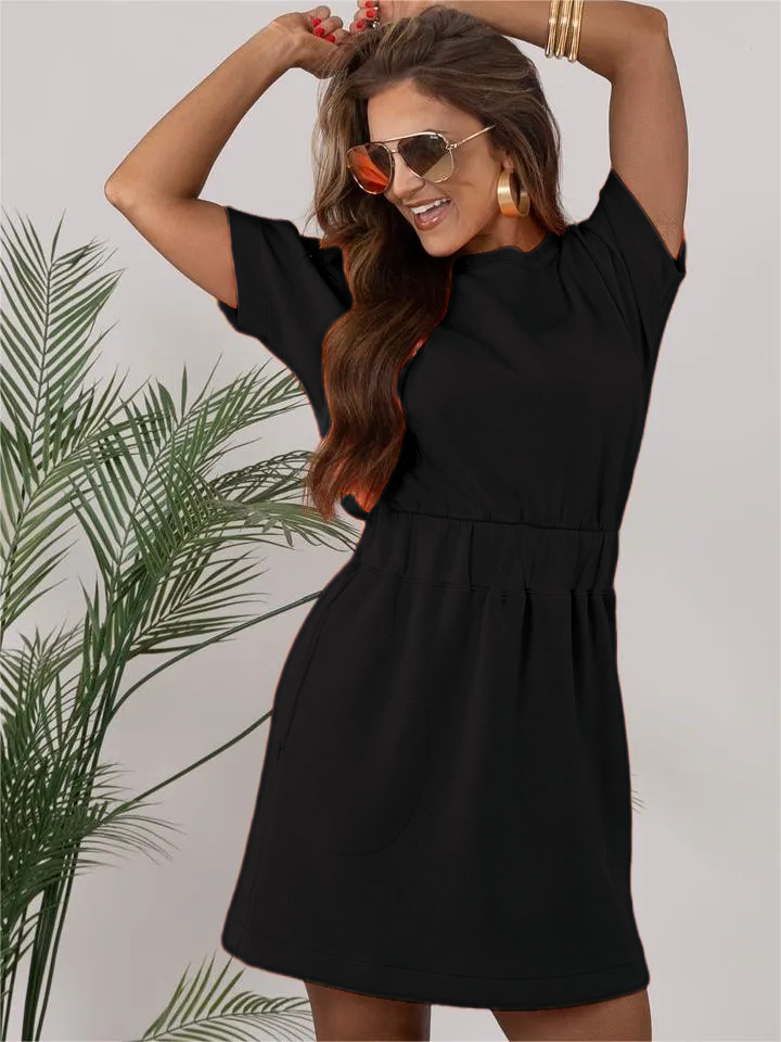 Luxurious comfort that goes anywhere. This short sleeve dress features a hidden elastic waistband that defines your silhouette and low-profile front pockets