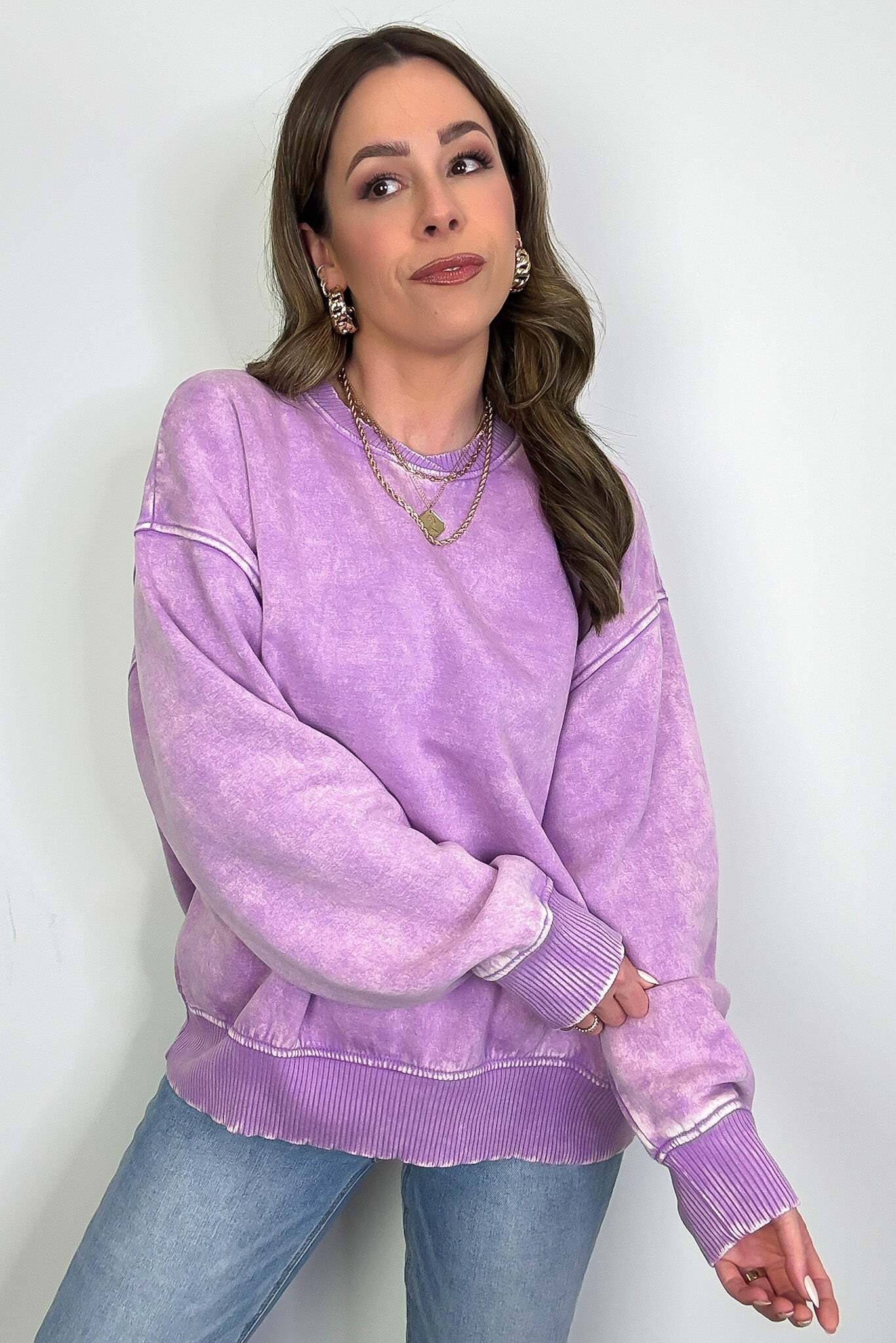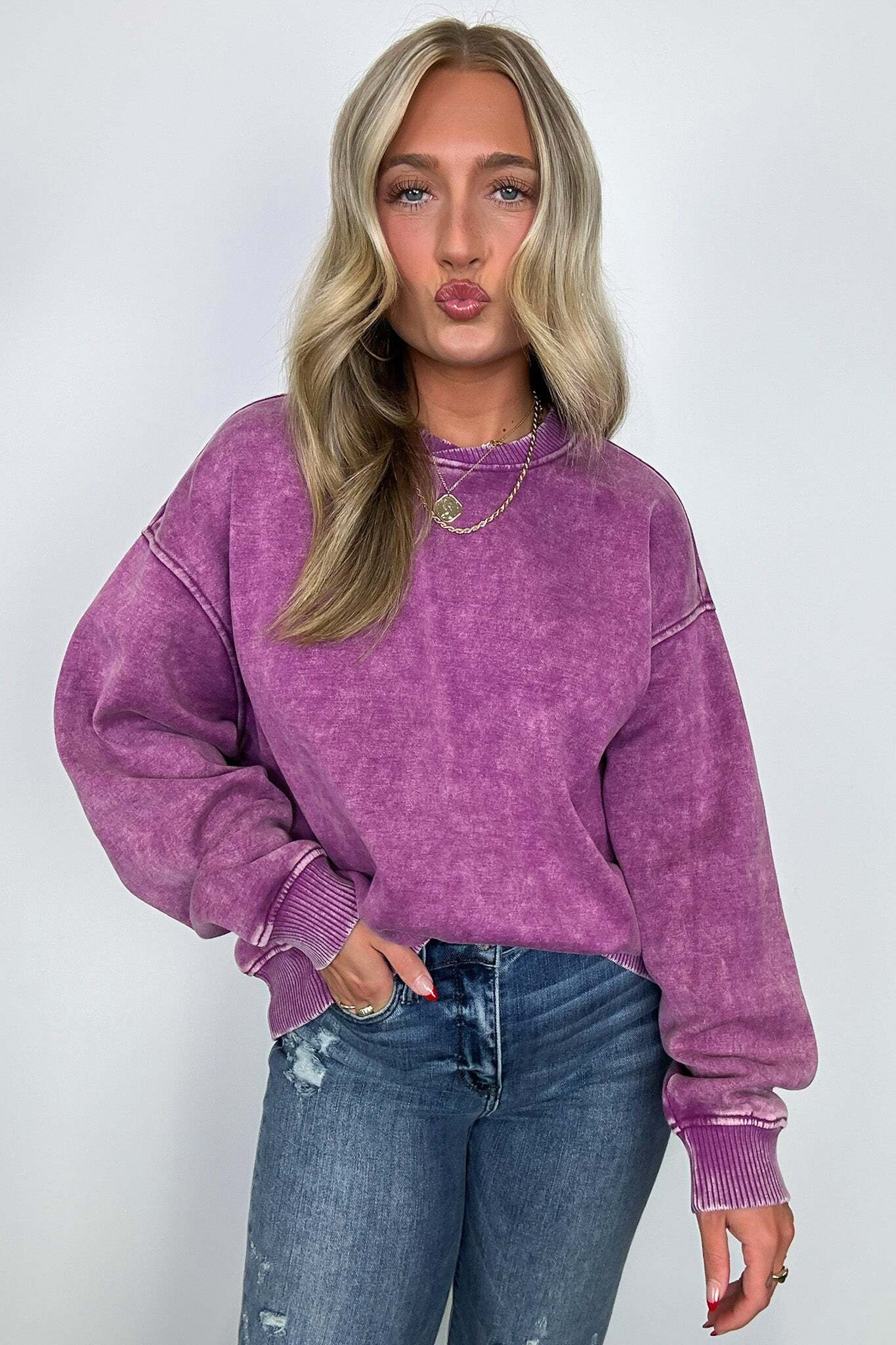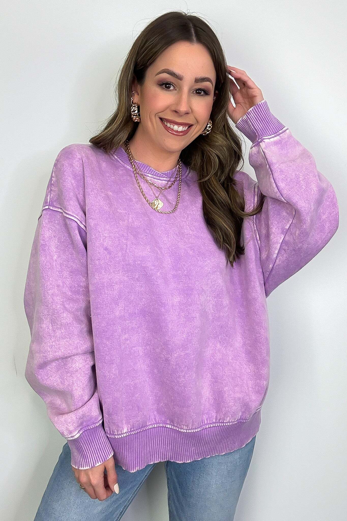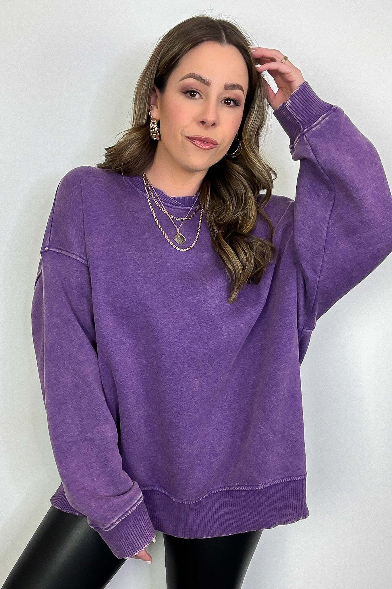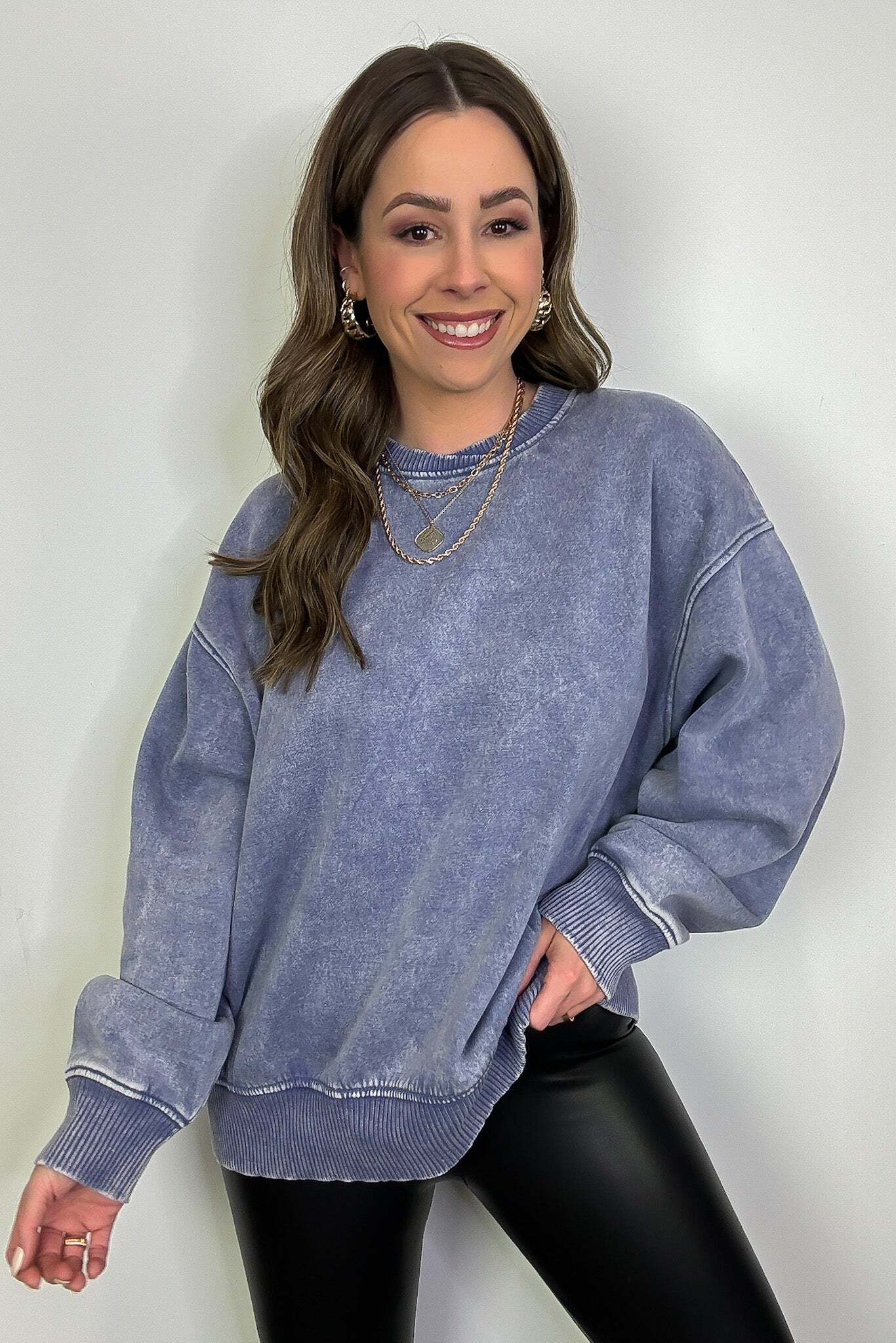 Details: Get cozy in our Acid Wash Oversized Pullover! Made from acid wash fleece, this pullover is perfect for lounging or running errands. The balloon sleeves add a touch of whimsy to this oversized piece. A fun and playful addition to any wardrobe!