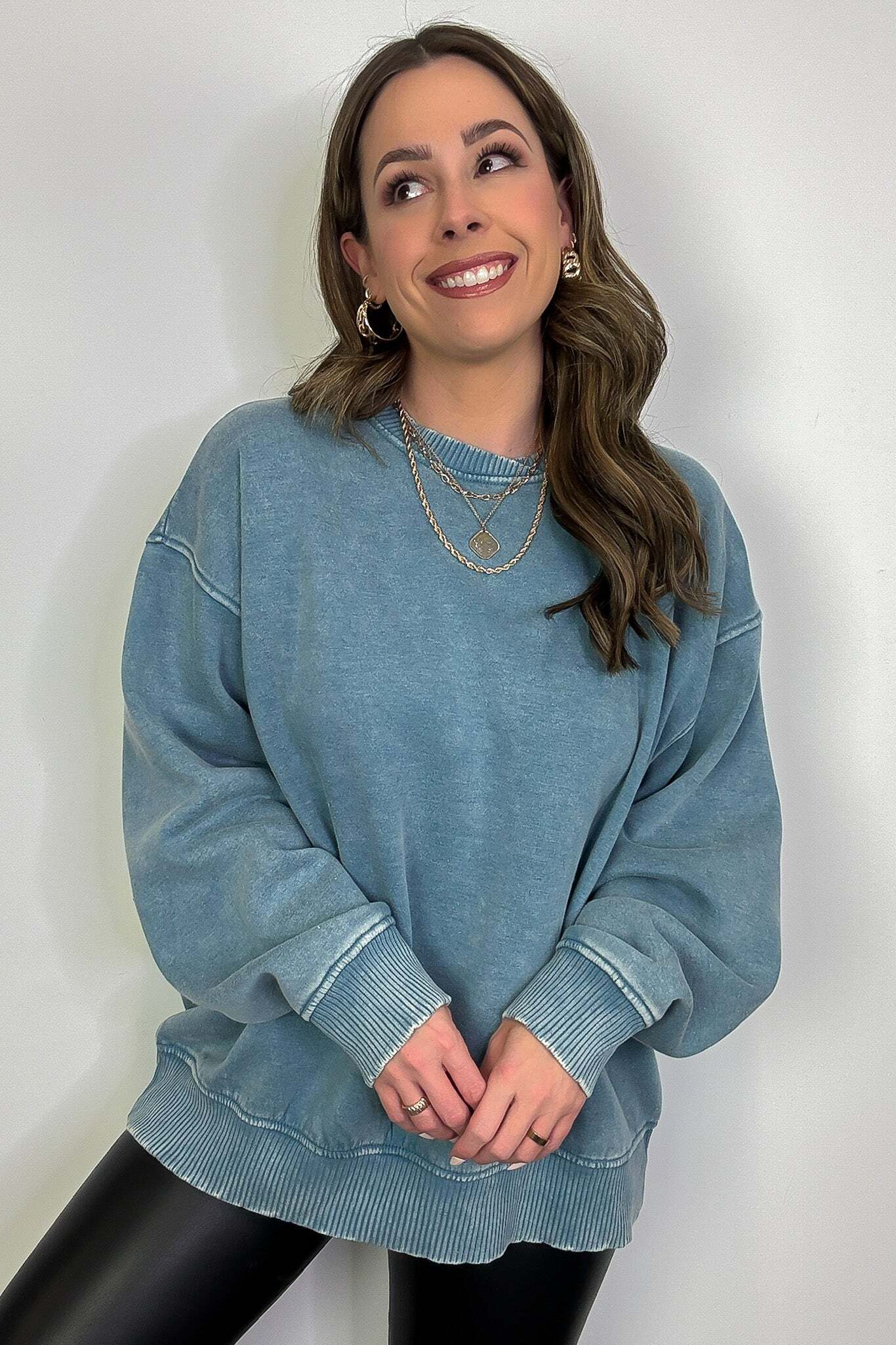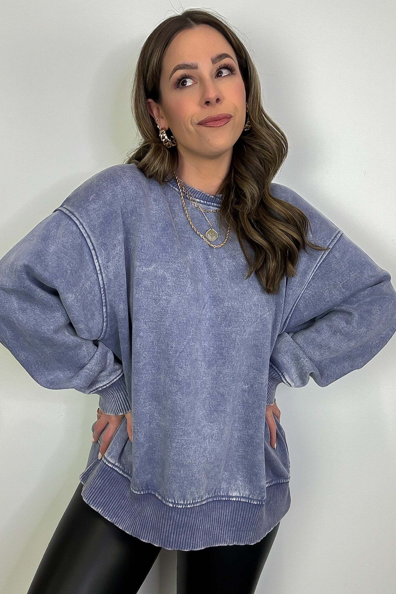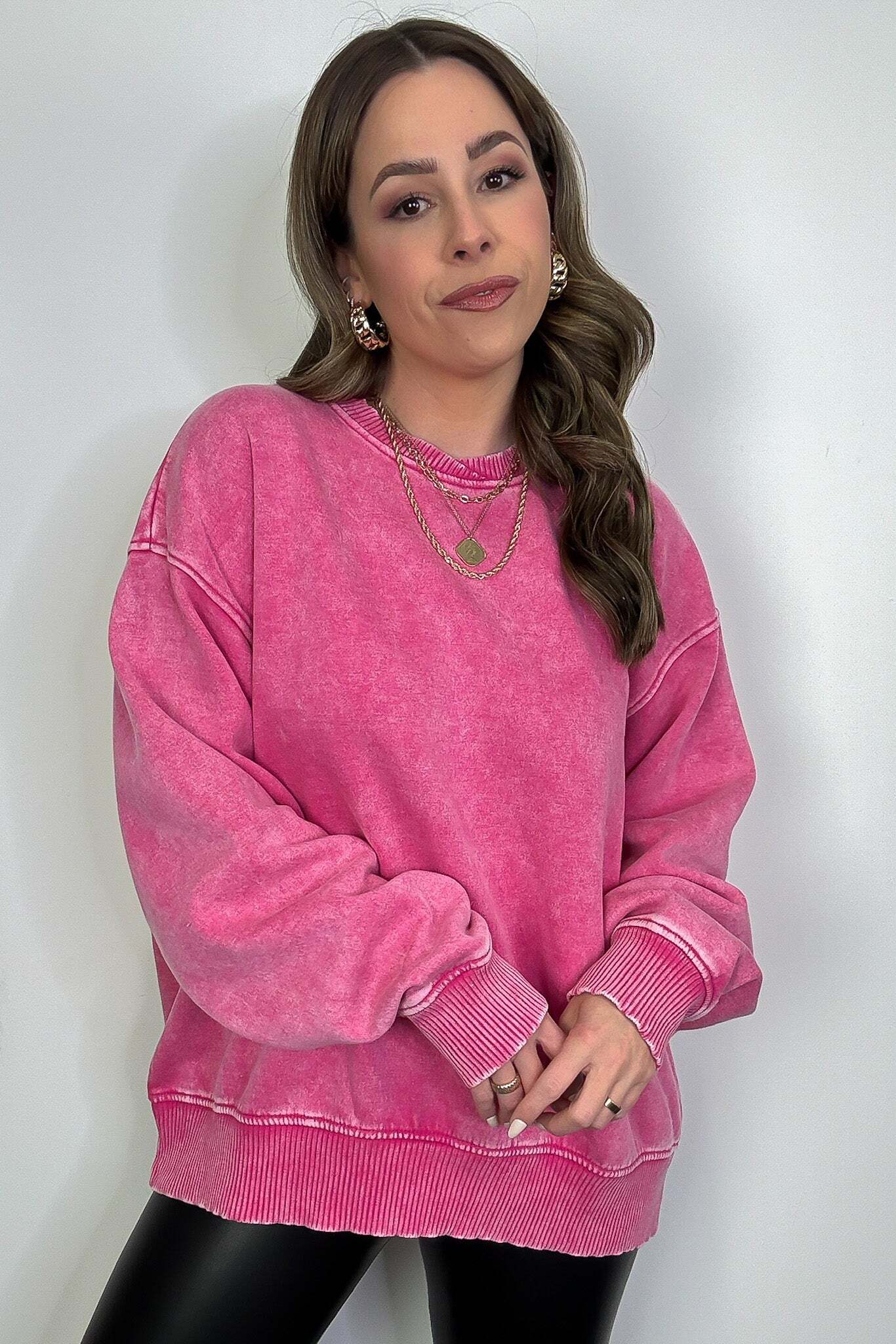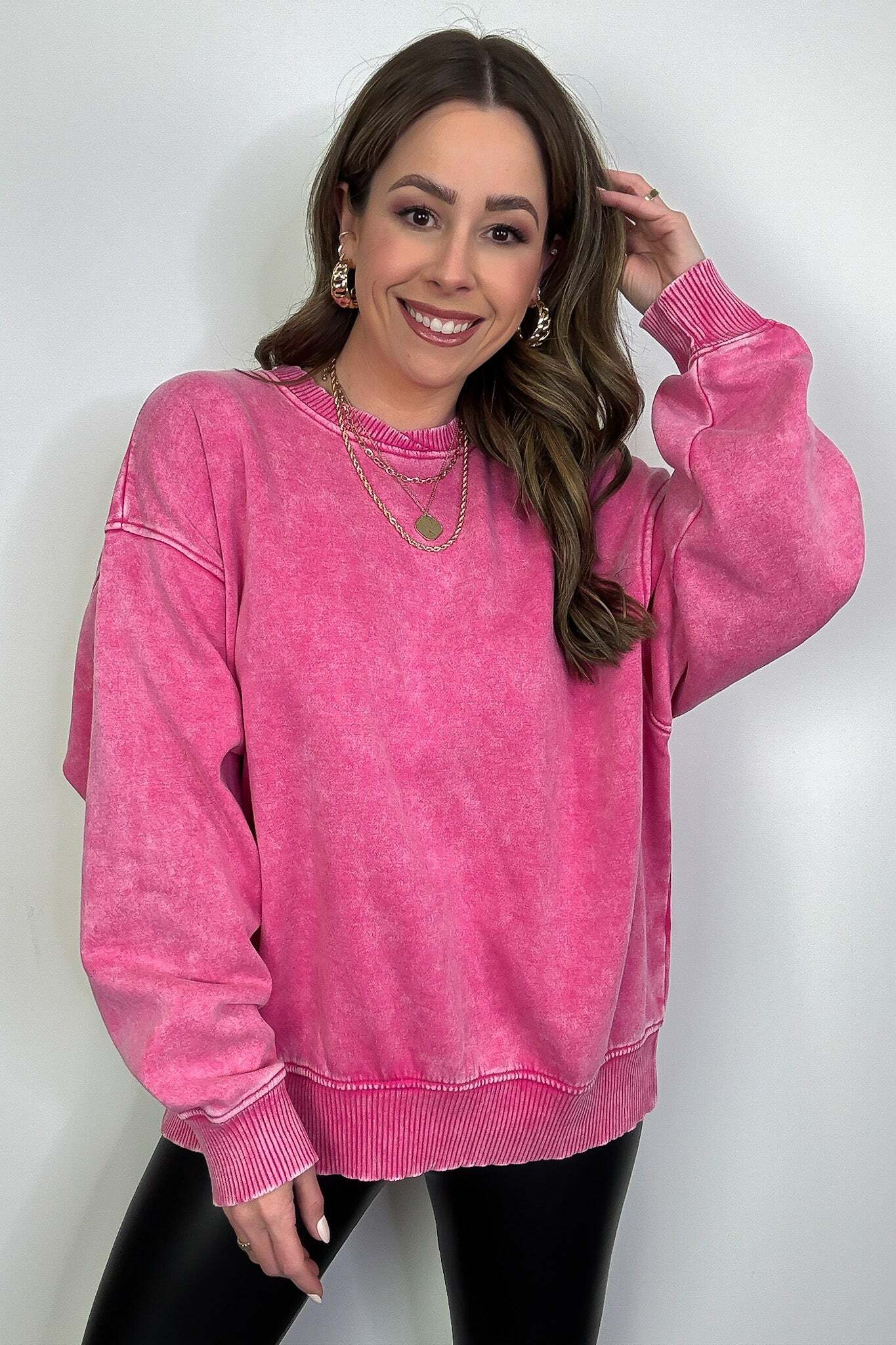 Details: Get cozy in our Acid Wash Oversized Pullover! Made from acid wash fleece, this pullover is perfect for lounging or running errands. The balloon sleeves add a touch of whimsy to this oversized piece. A fun and playful addition to any wardrobe!