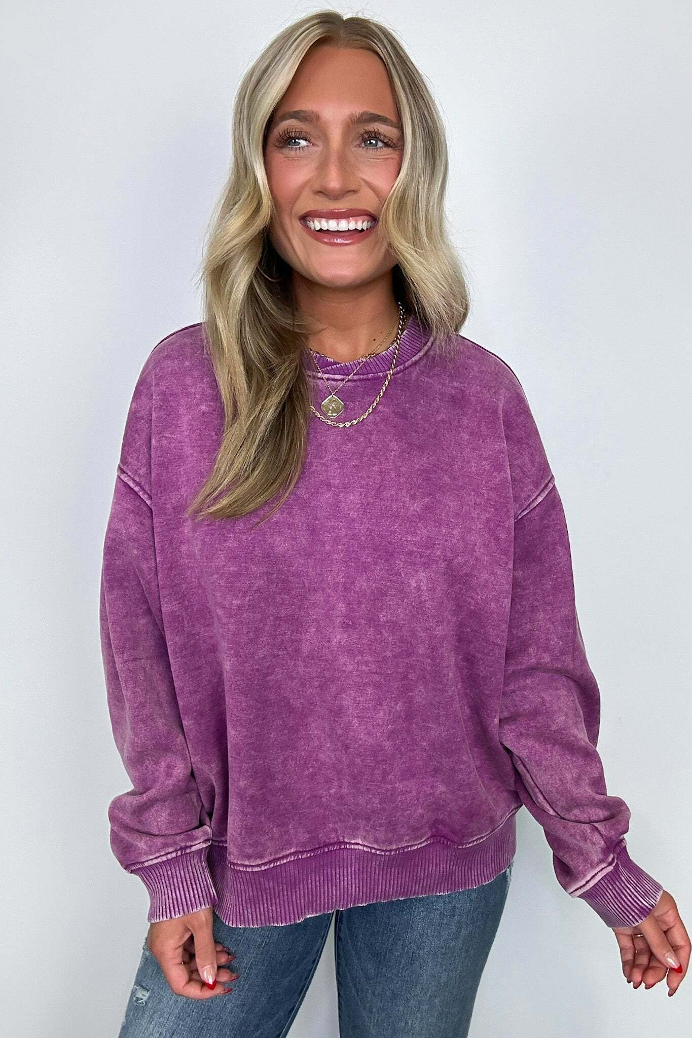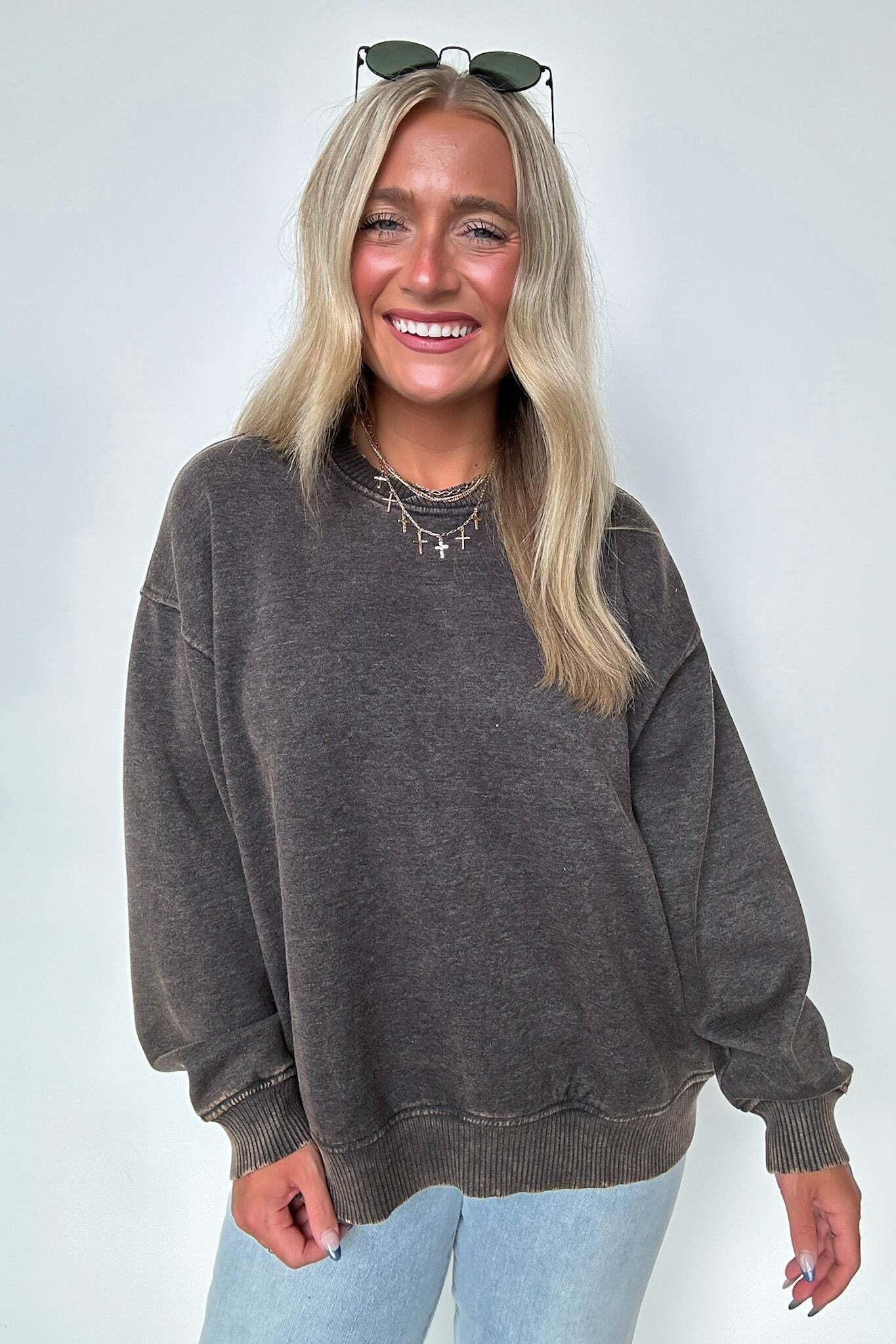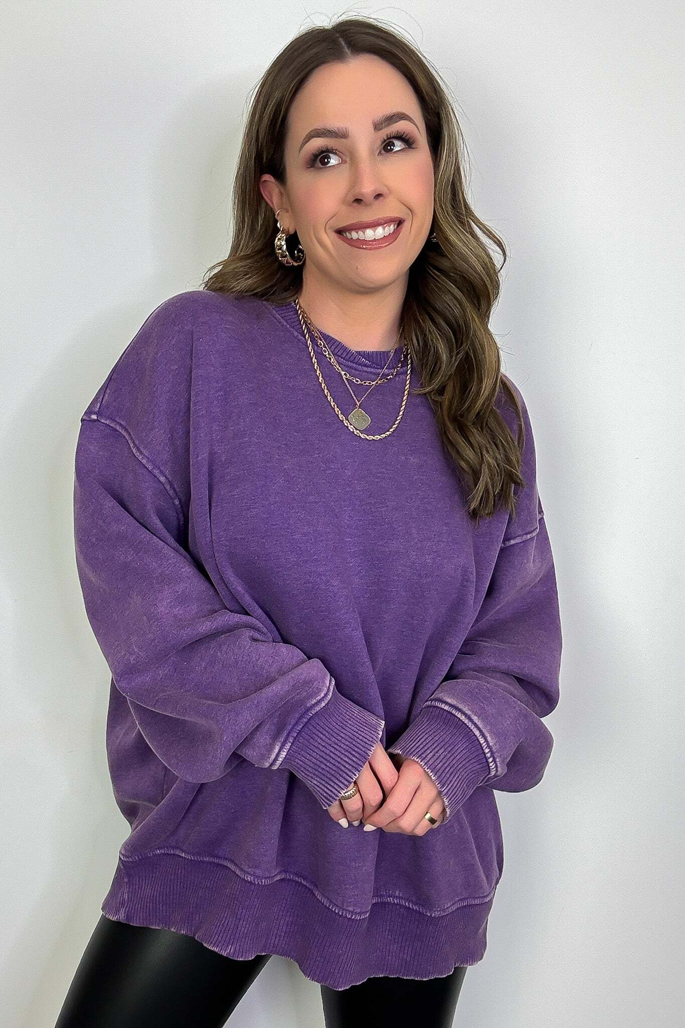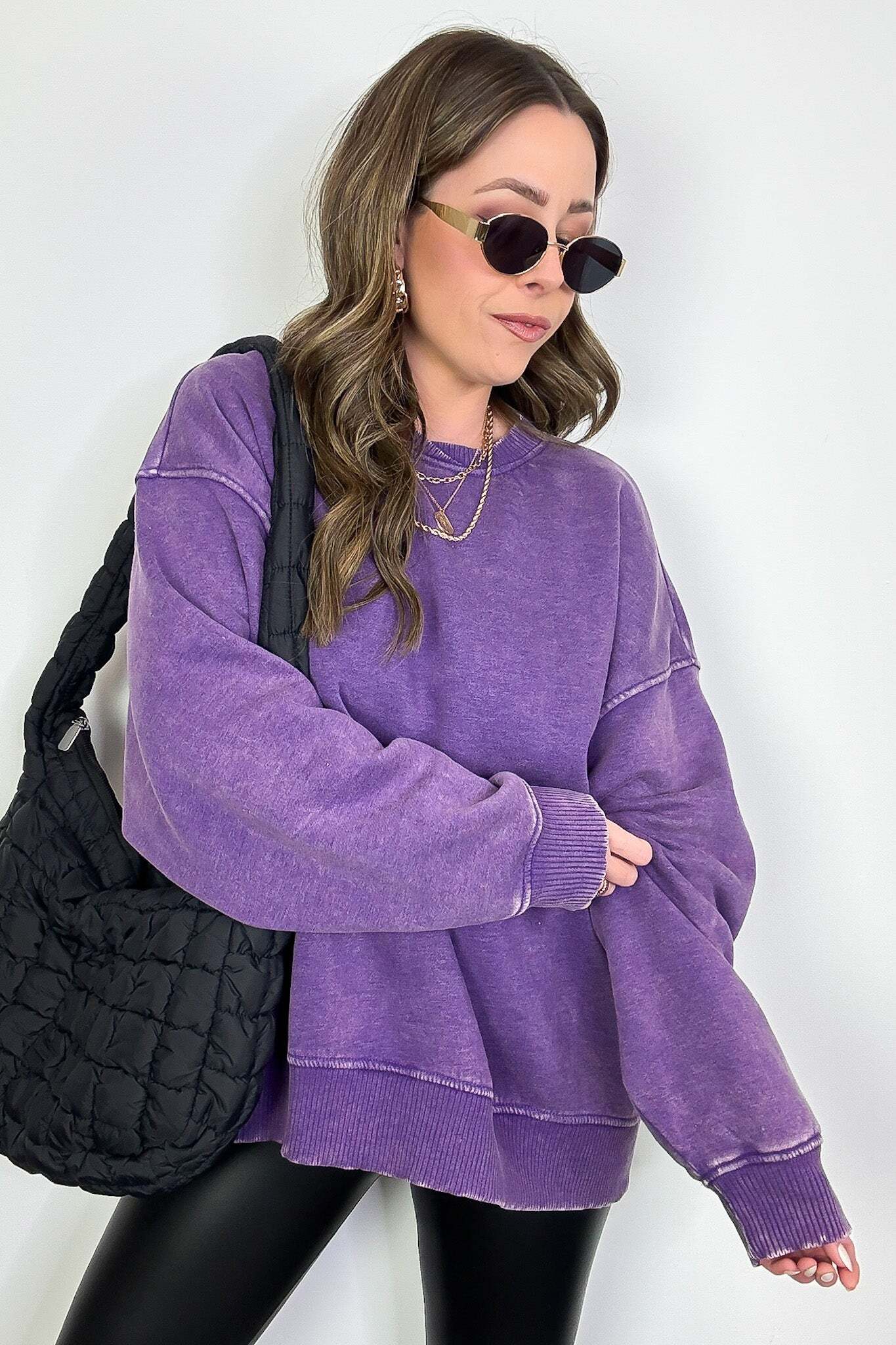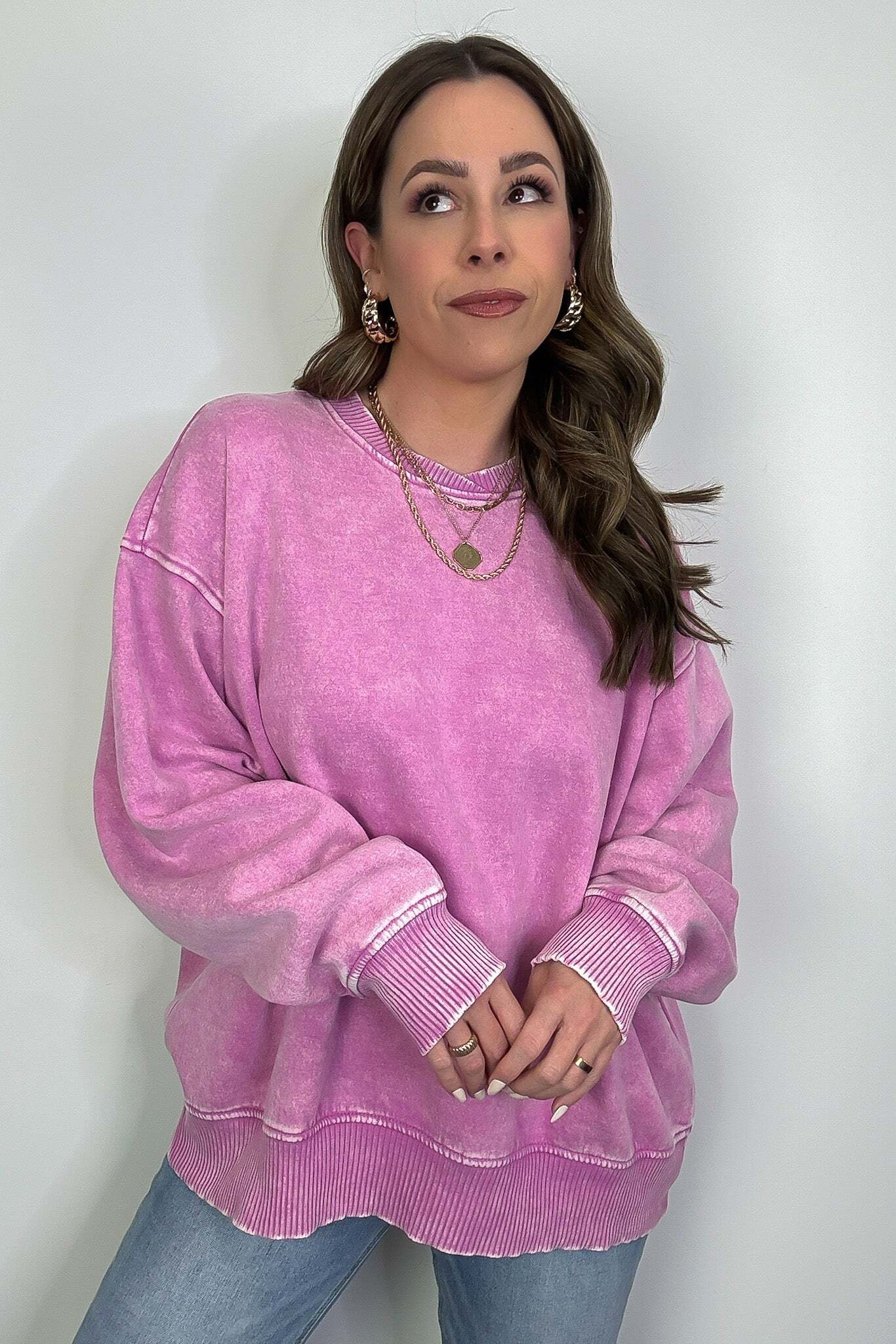 Details: Get cozy in our Acid Wash Oversized Pullover! Made from acid wash fleece, this pullover is perfect for lounging or running errands. The balloon sleeves add a touch of whimsy to this oversized piece. A fun and playful addition to any wardrobe!