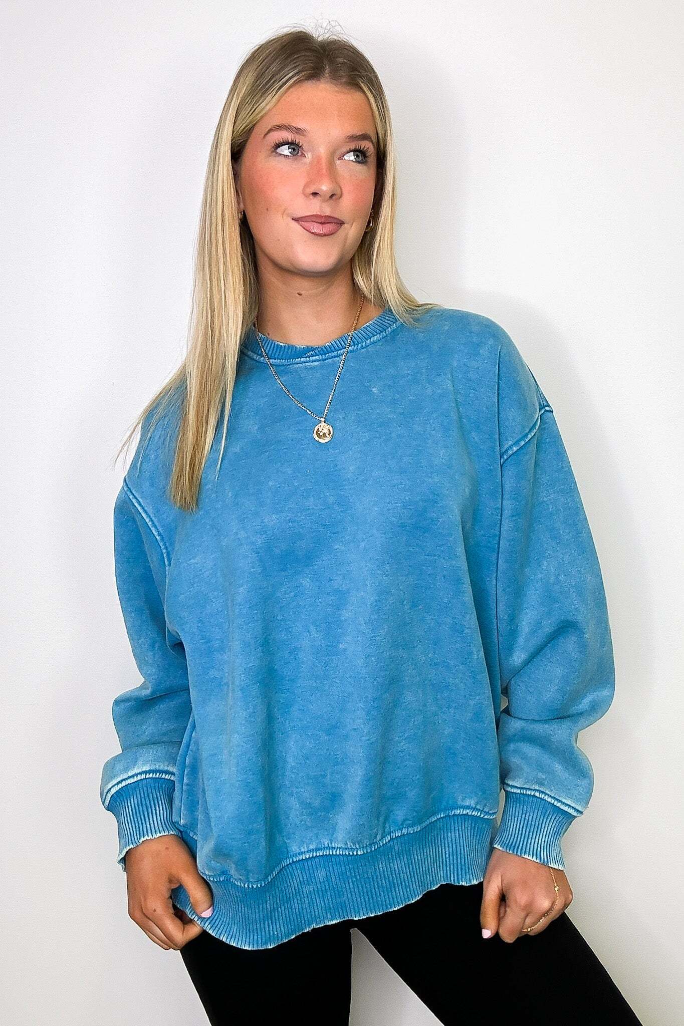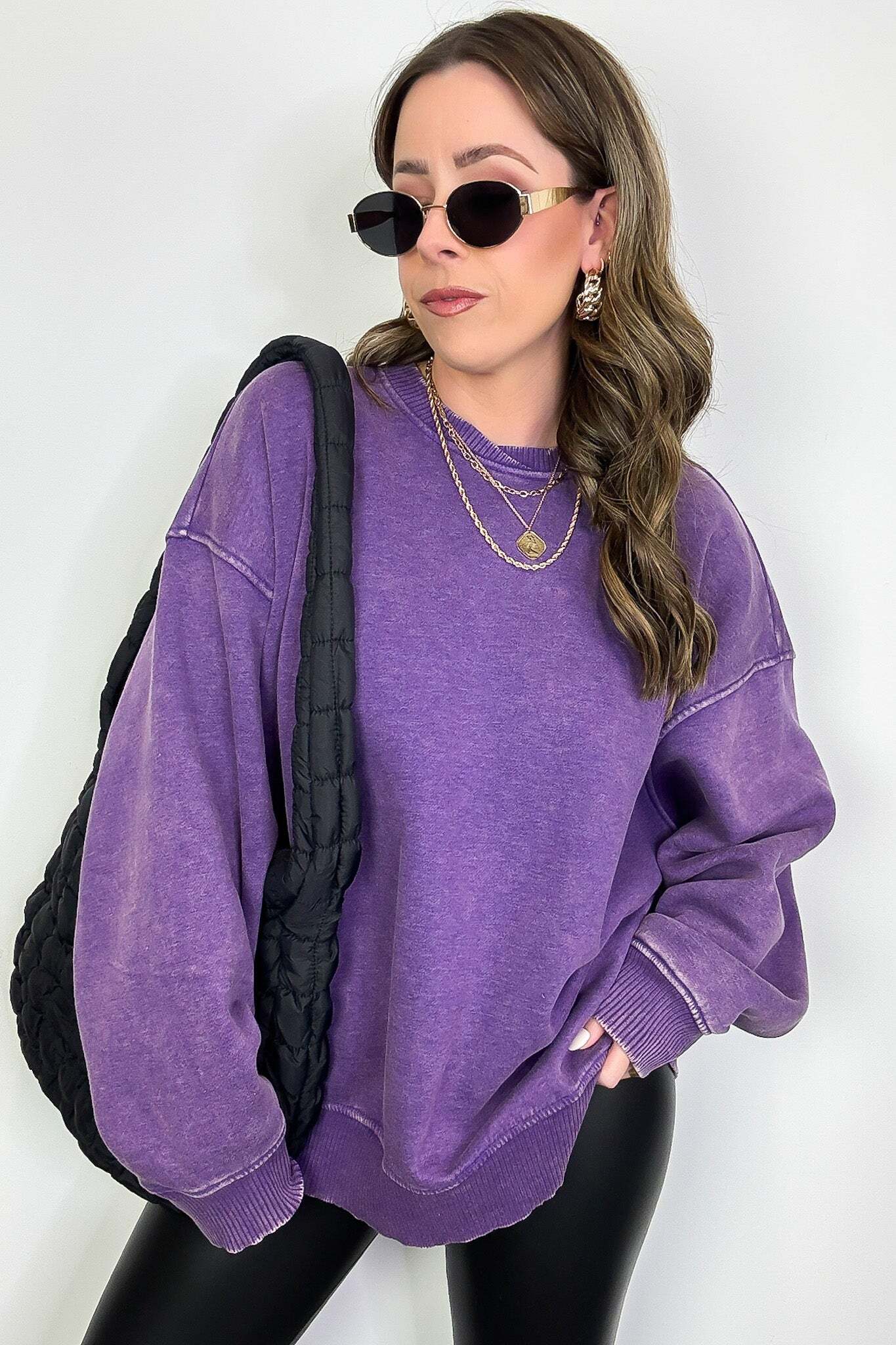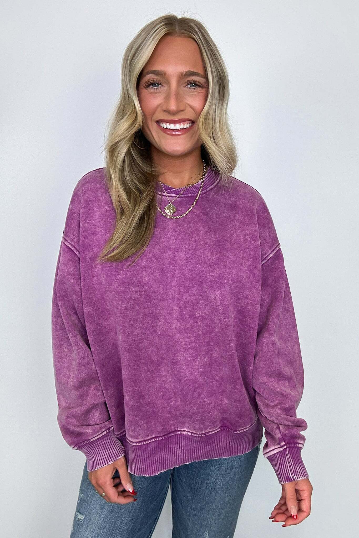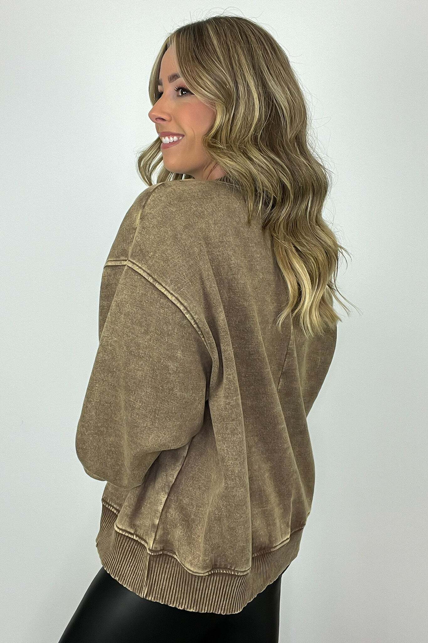 Details: Get cozy in our Acid Wash Oversized Pullover! Made from acid wash fleece, this pullover is perfect for lounging or running errands. The balloon sleeves add a touch of whimsy to this oversized piece. A fun and playful addition to any wardrobe!