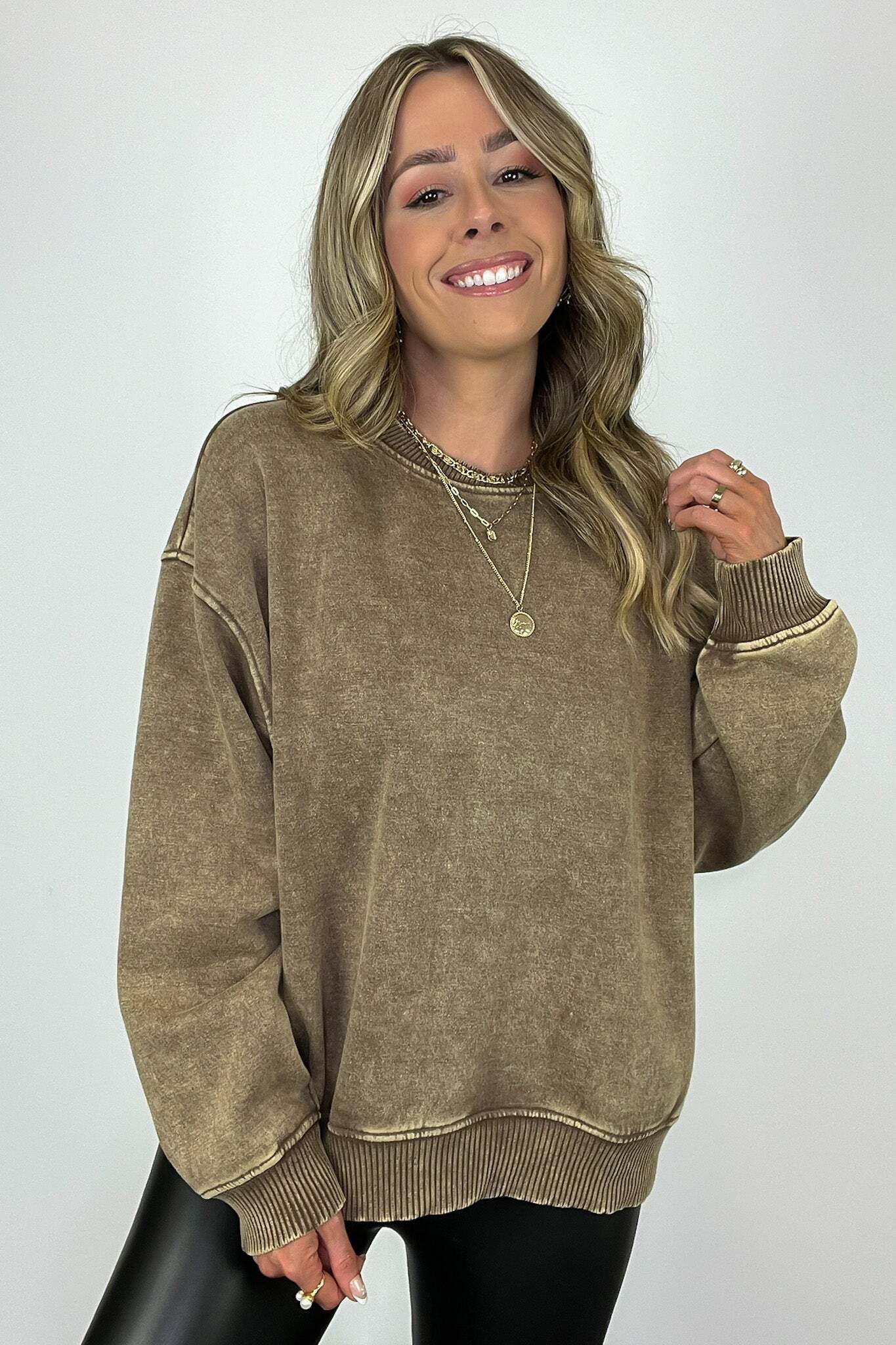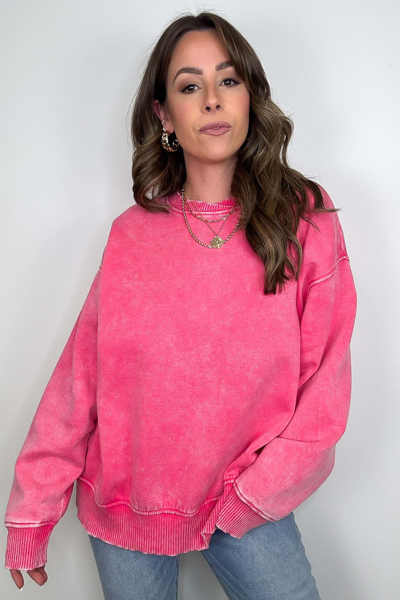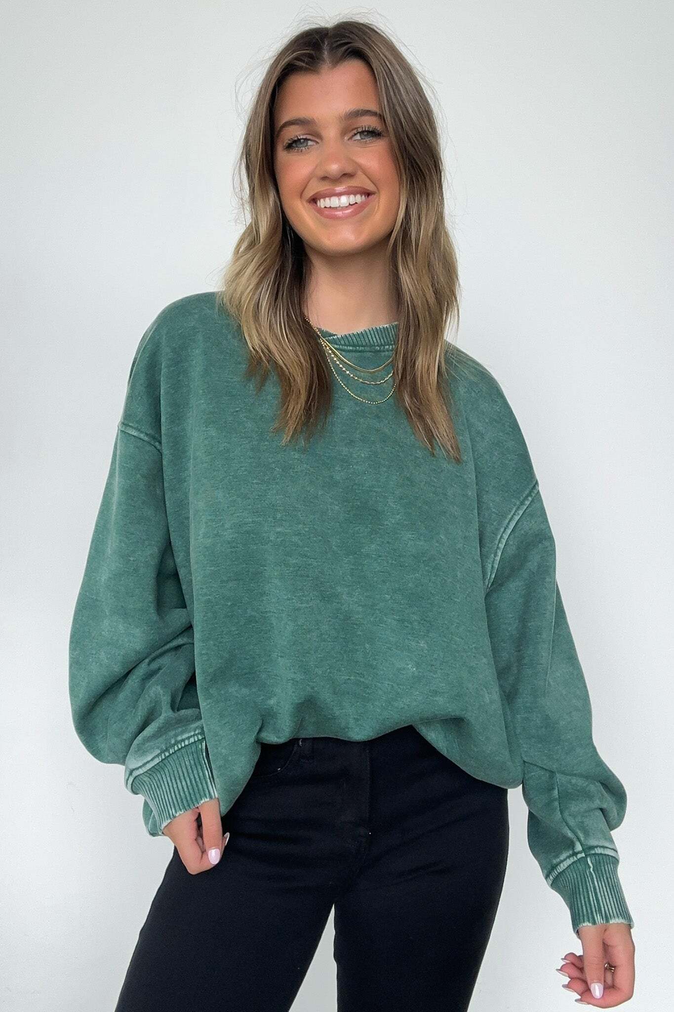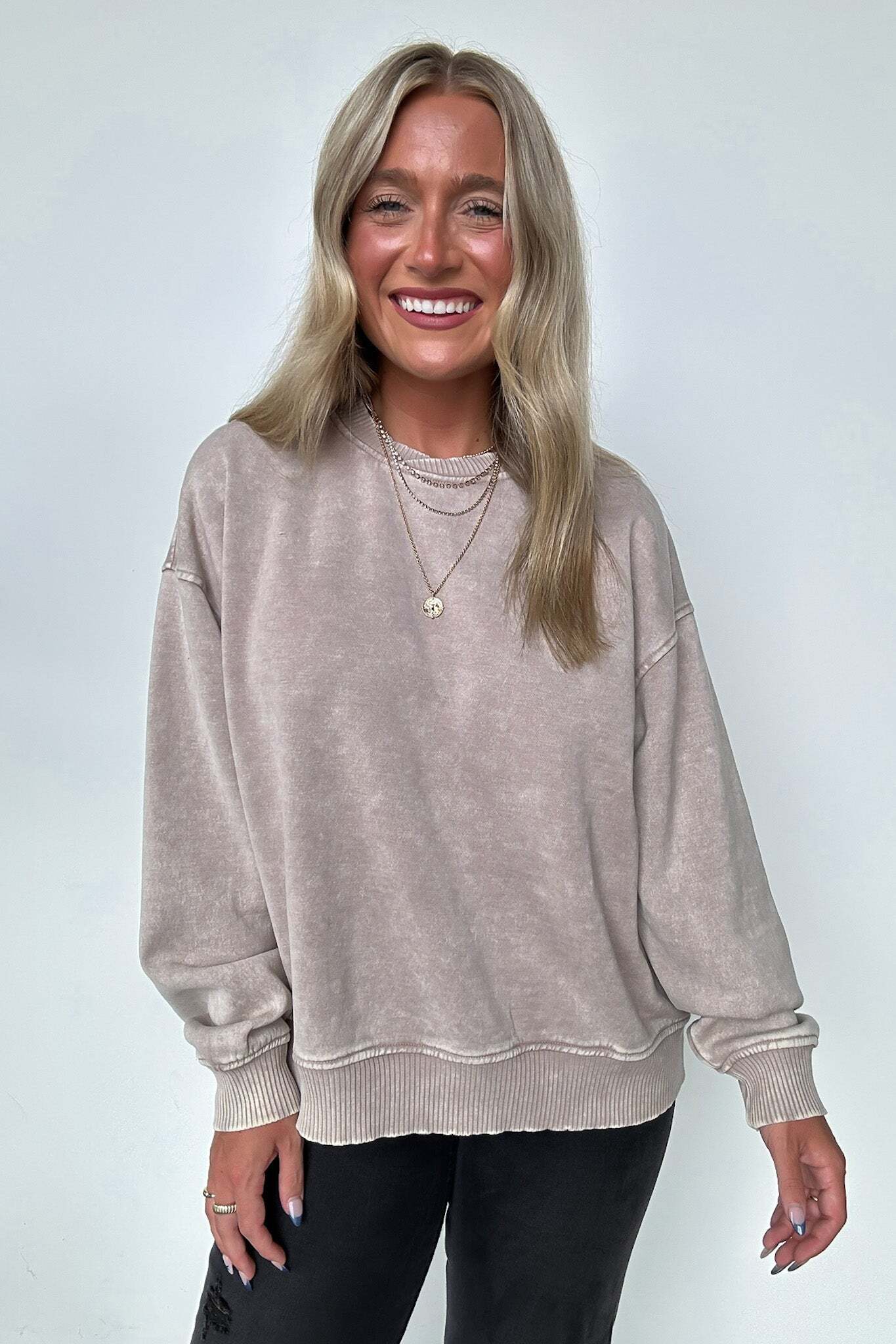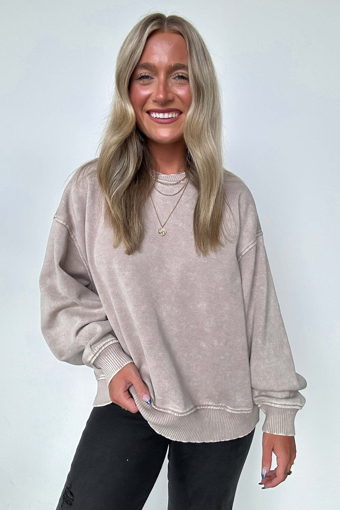 Details: Get cozy in our Acid Wash Oversized Pullover! Made from acid wash fleece, this pullover is perfect for lounging or running errands. The balloon sleeves add a touch of whimsy to this oversized piece. A fun and playful addition to any wardrobe!