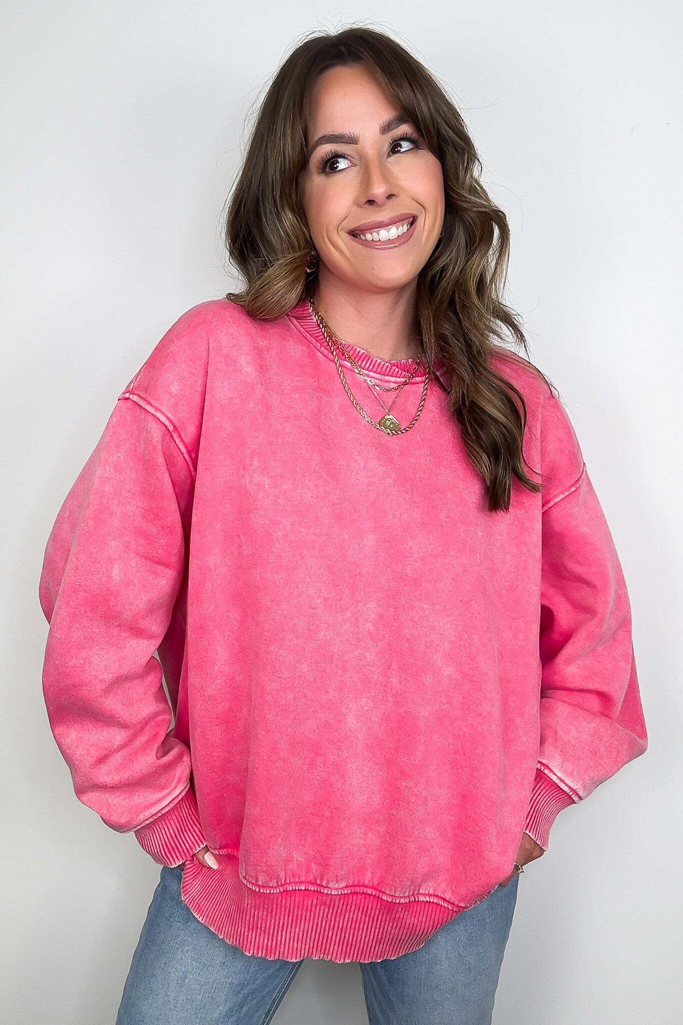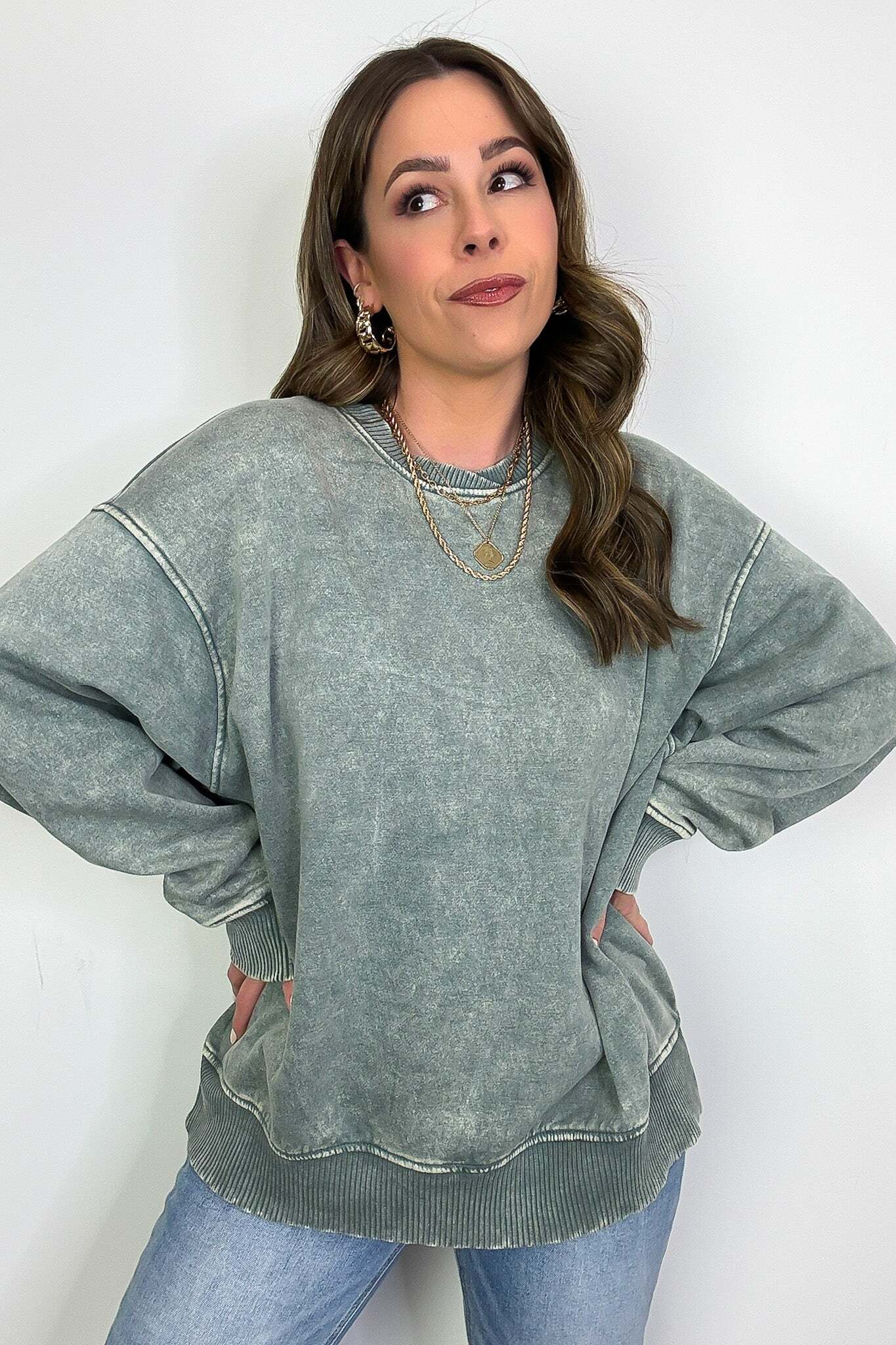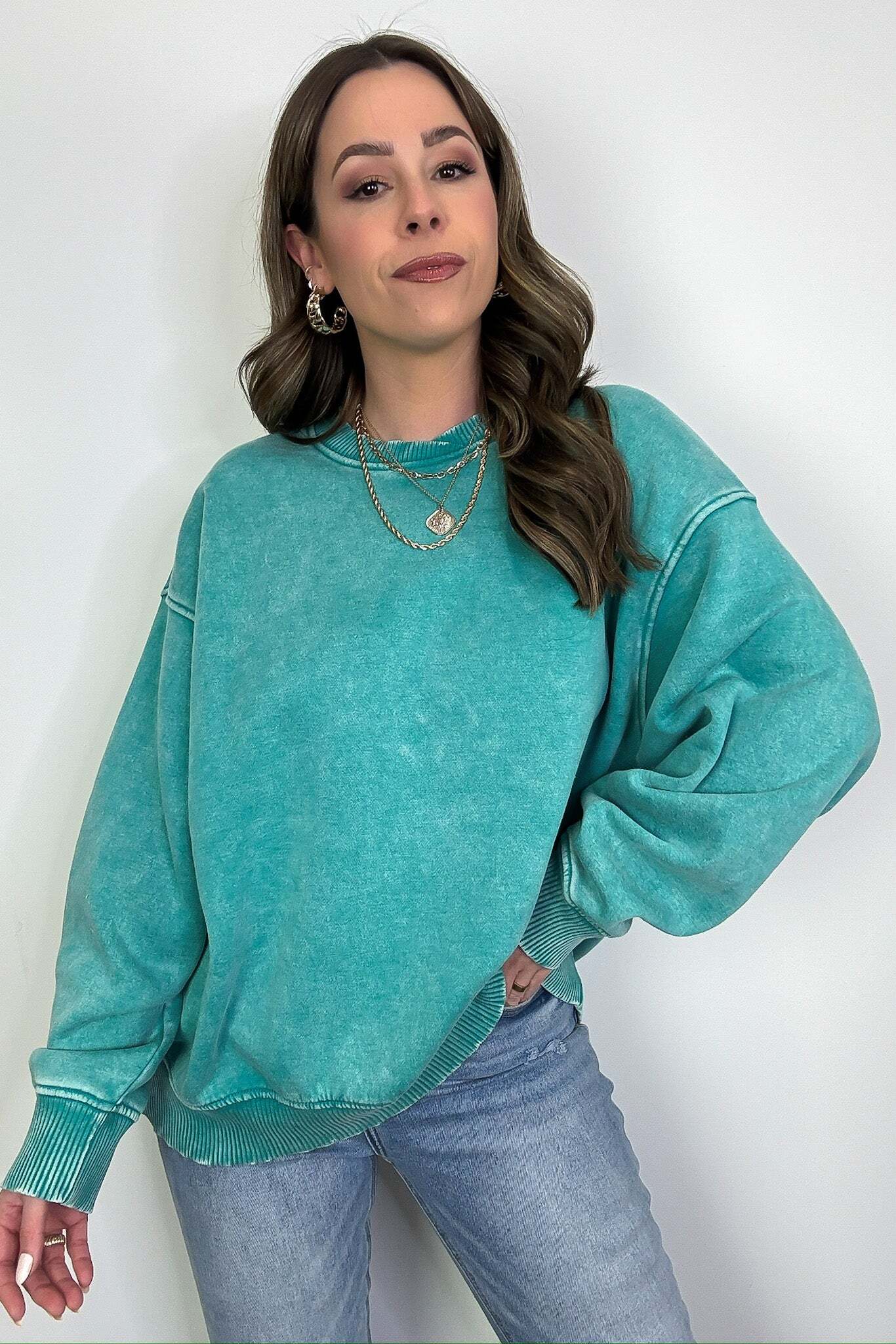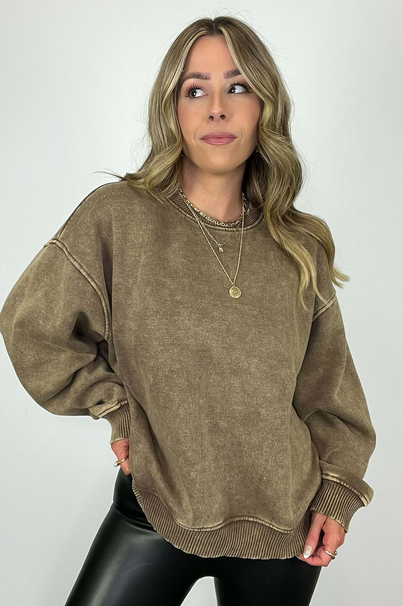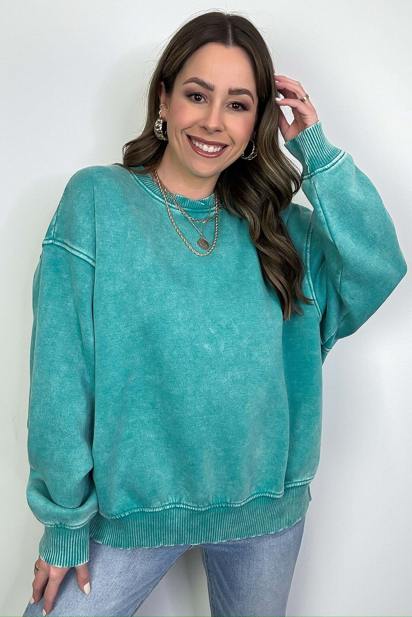 Details: Get cozy in our Acid Wash Oversized Pullover! Made from acid wash fleece, this pullover is perfect for lounging or running errands. The balloon sleeves add a touch of whimsy to this oversized piece. A fun and playful addition to any wardrobe!