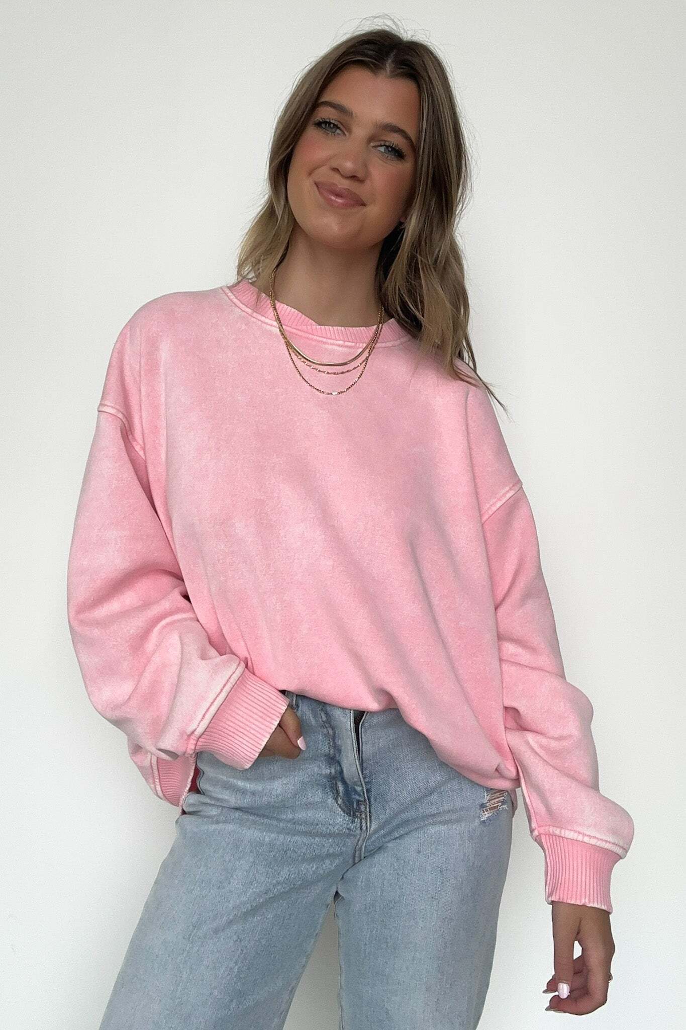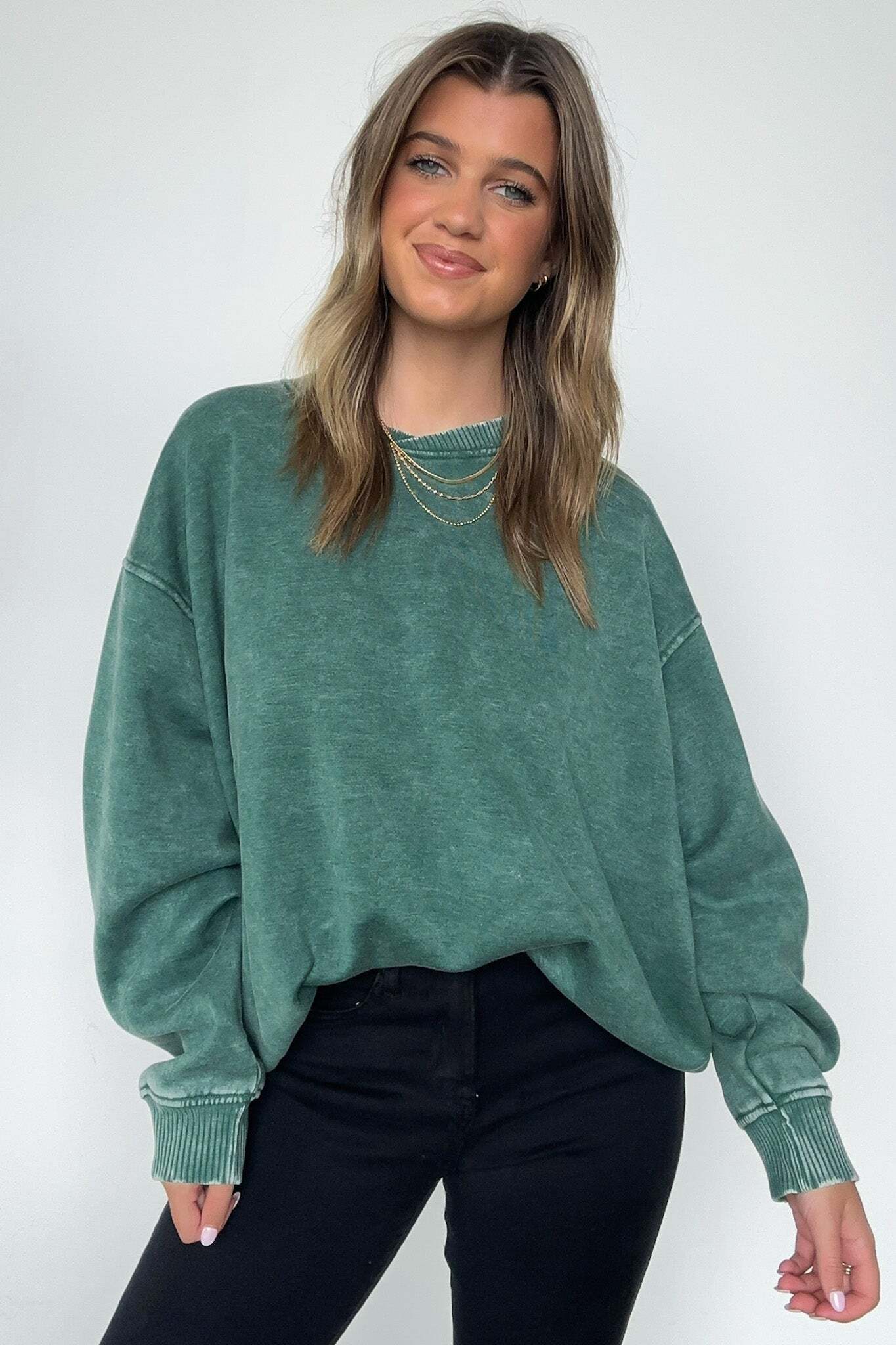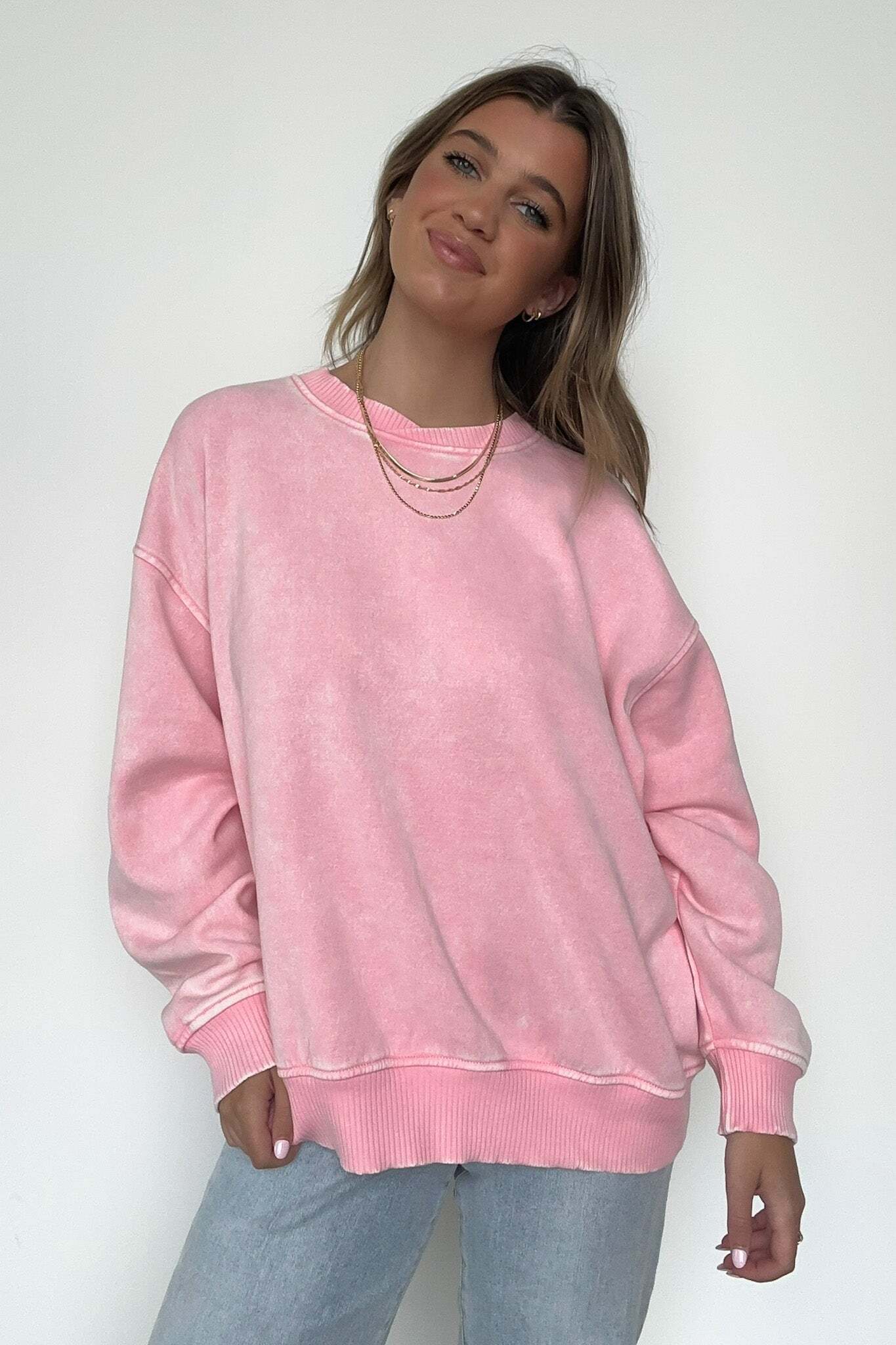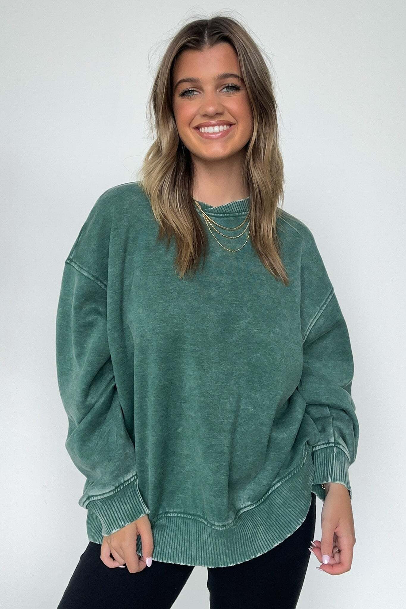 Details: Get cozy in our Acid Wash Oversized Pullover! Made from acid wash fleece, this pullover is perfect for lounging or running errands. The balloon sleeves add a touch of whimsy to this oversized piece. A fun and playful addition to any wardrobe!