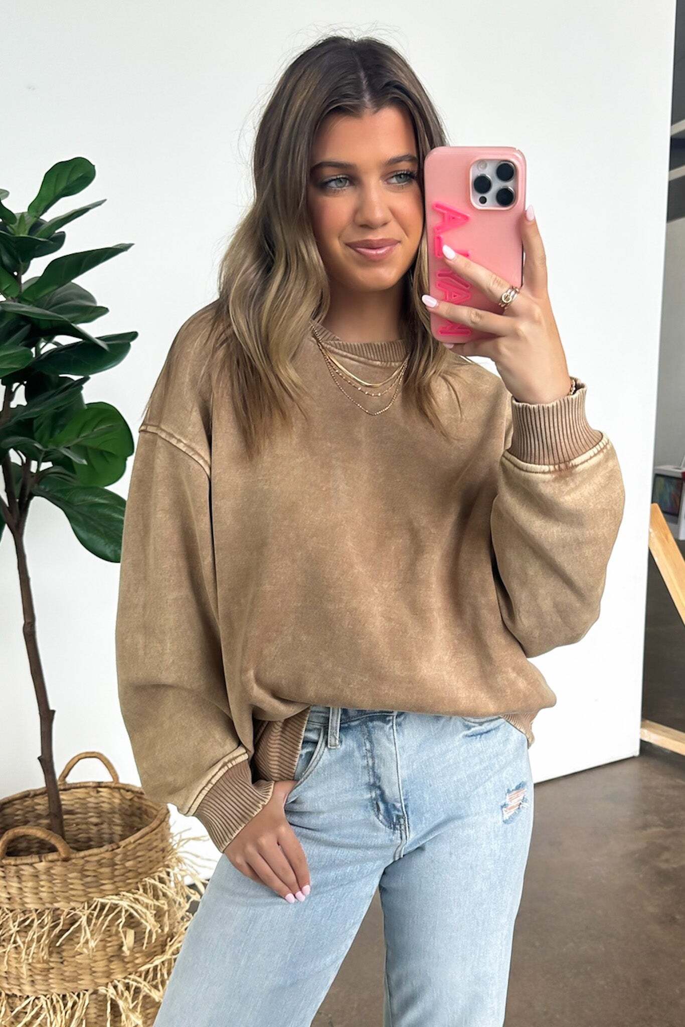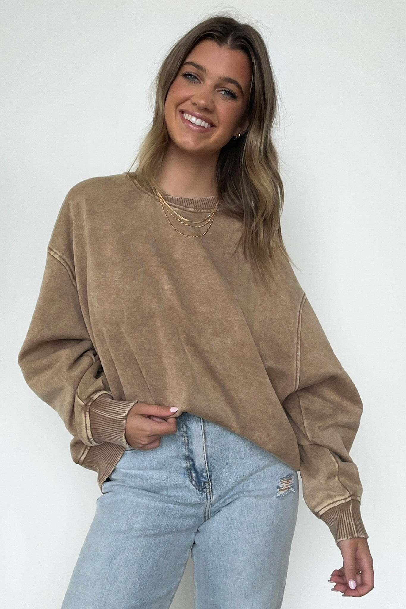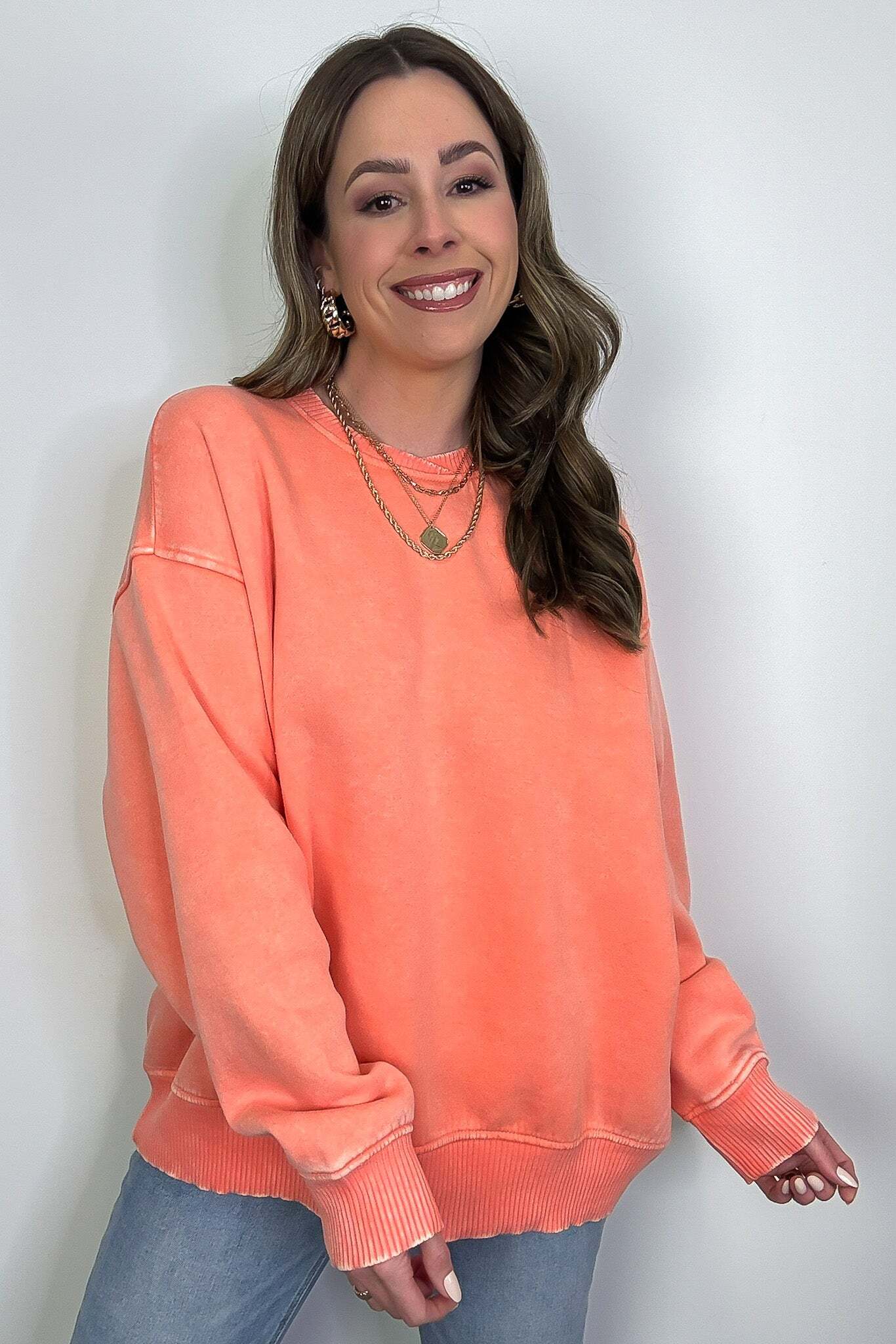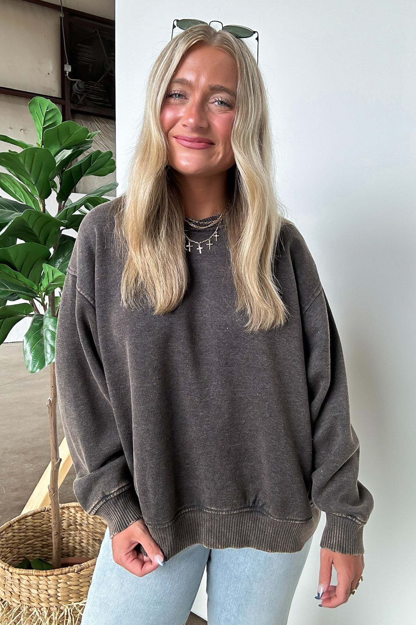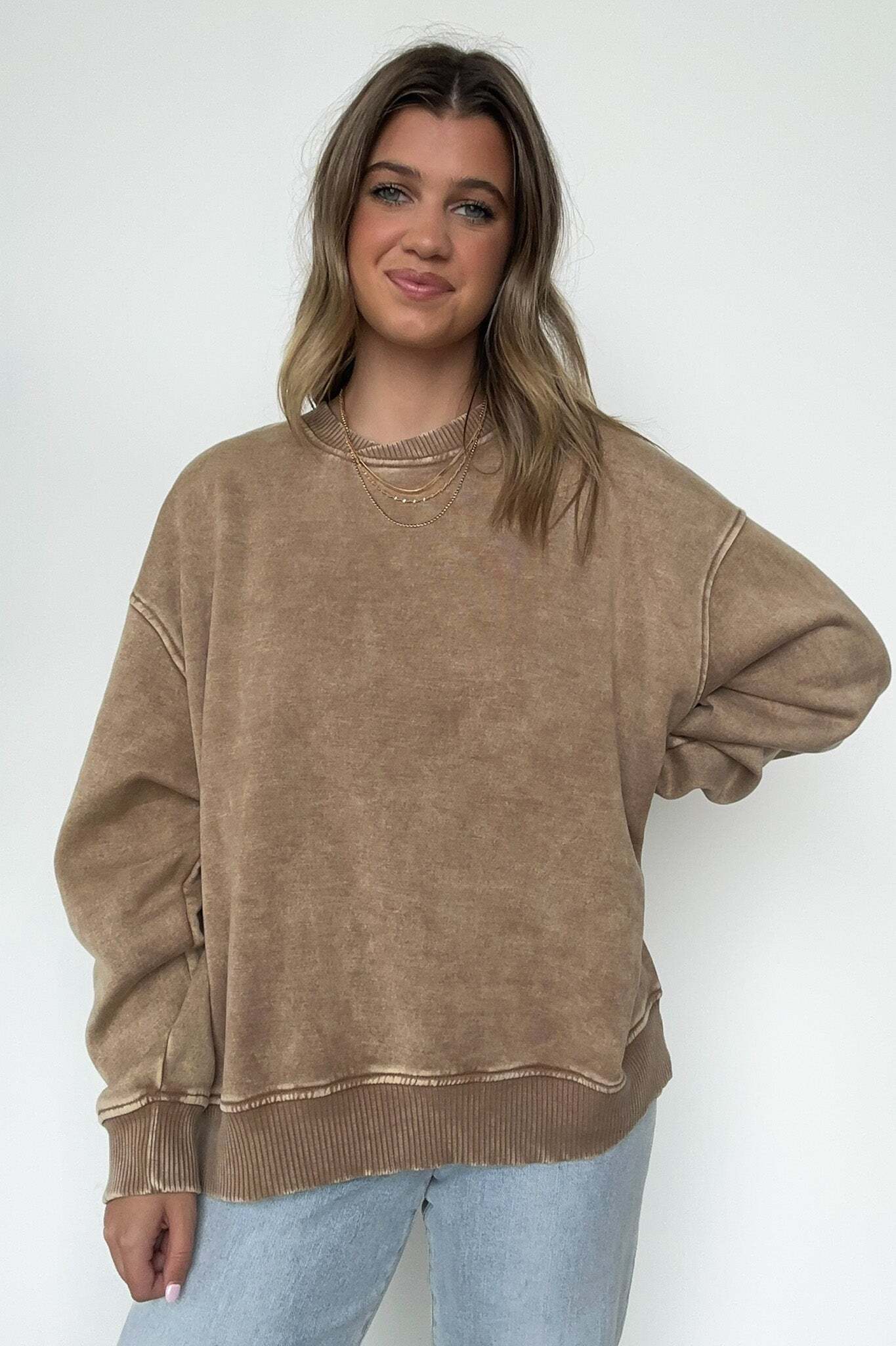 Details: Get cozy in our Acid Wash Oversized Pullover! Made from acid wash fleece, this pullover is perfect for lounging or running errands. The balloon sleeves add a touch of whimsy to this oversized piece. A fun and playful addition to any wardrobe!