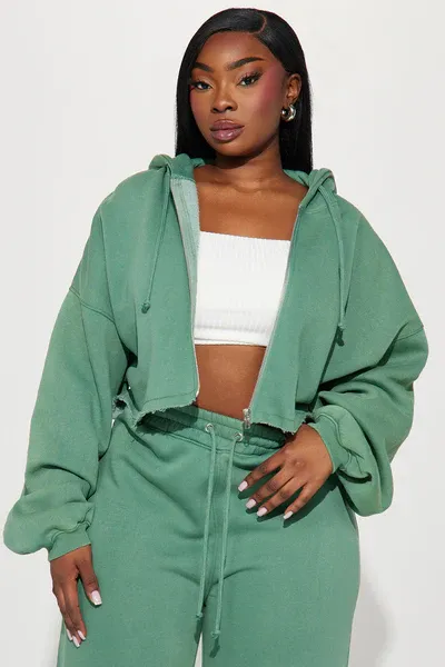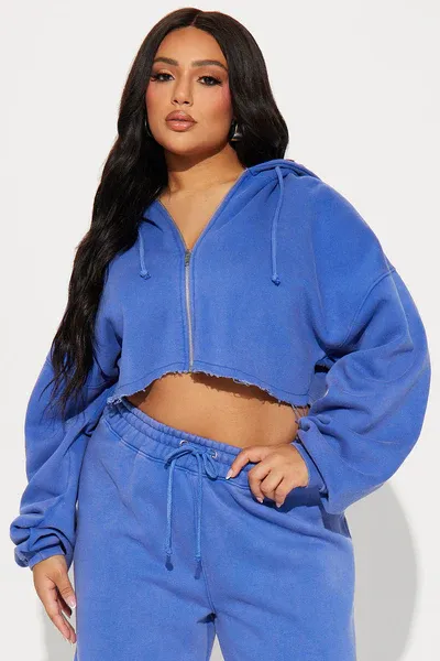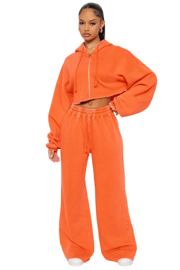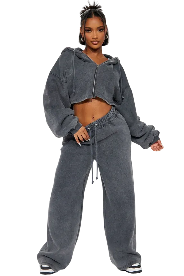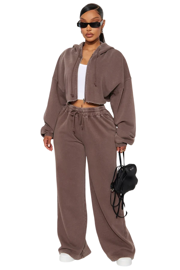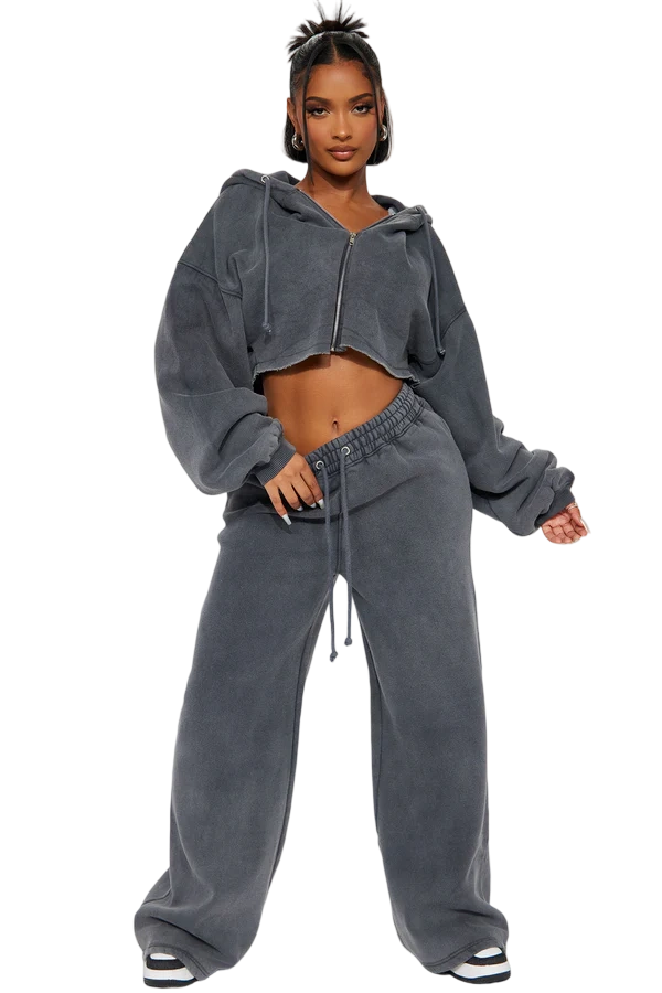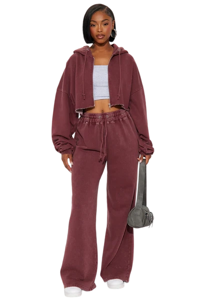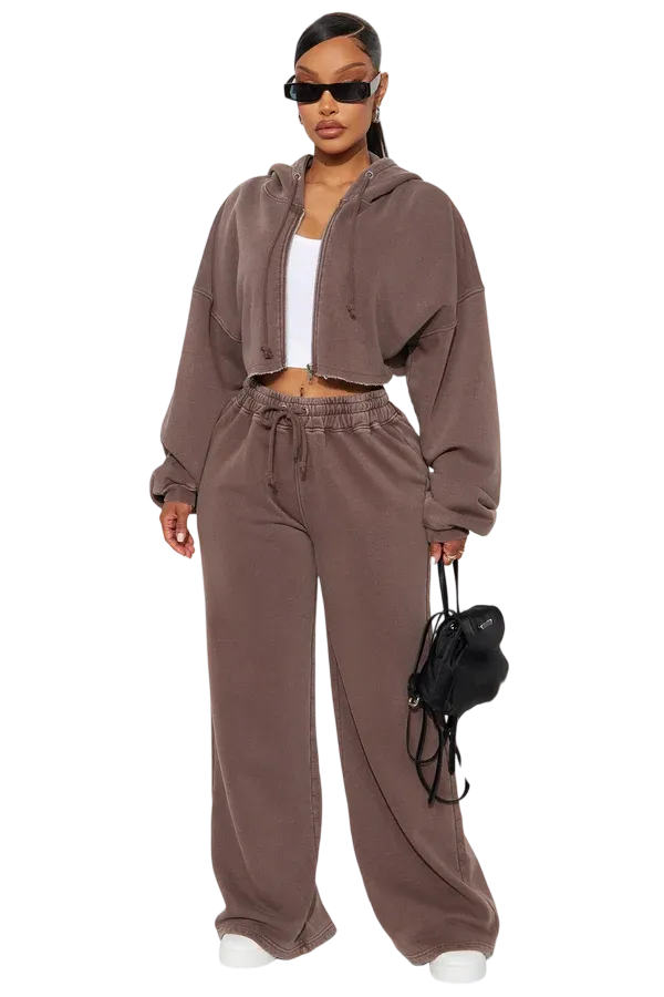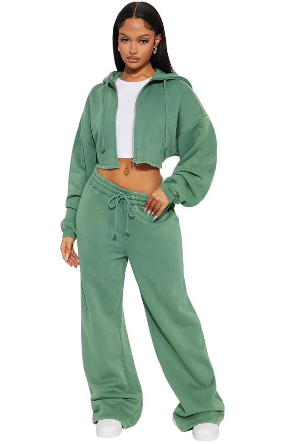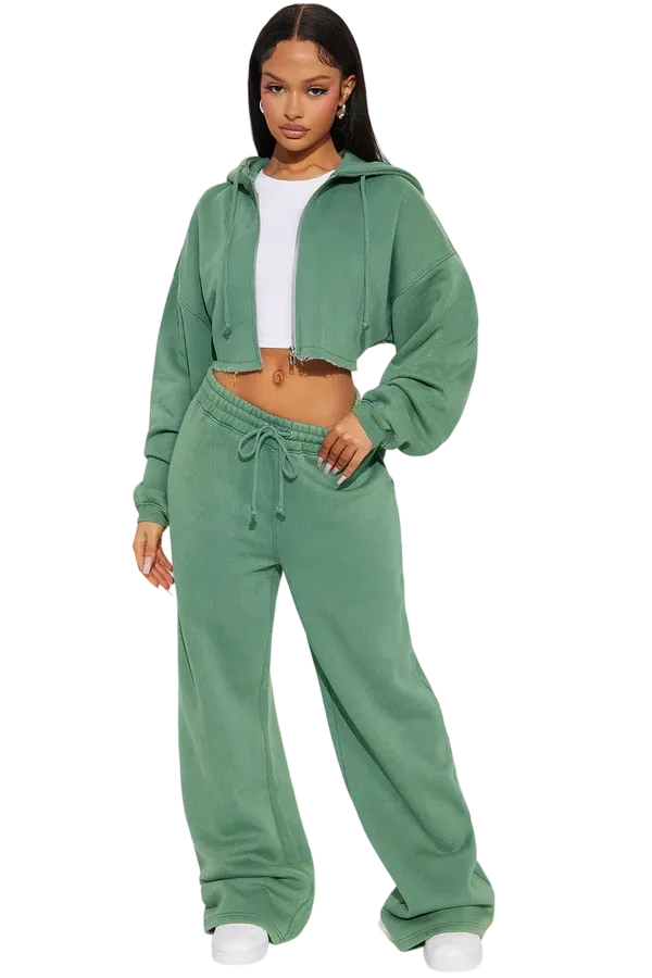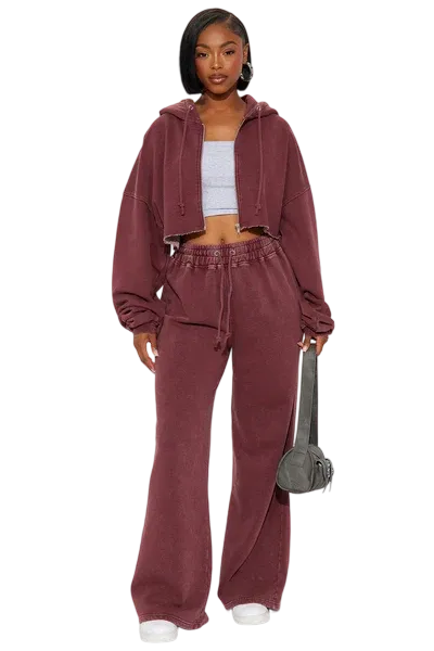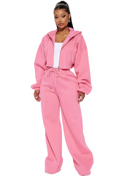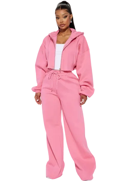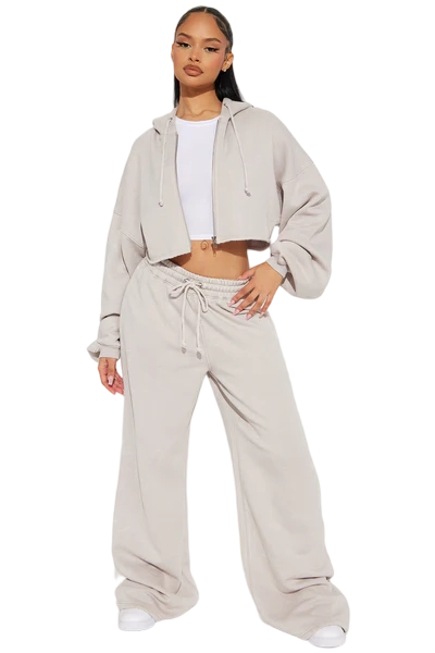 · Features: Elastic waistband, drawstring, cropped wide-leg, zip-up hoodie