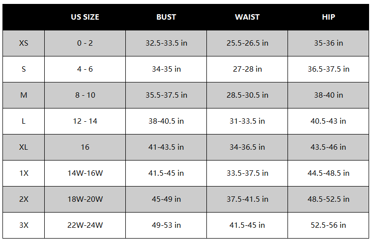 US Sizes: XS=1~2, S=4~6, M=8~10, L=12~14, XL=16~18, 1XL=20~22,2XL=24~26, 3XL=28~30