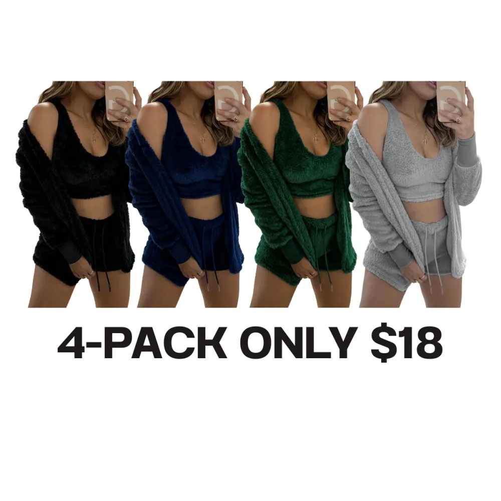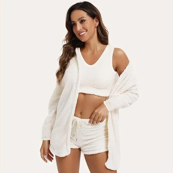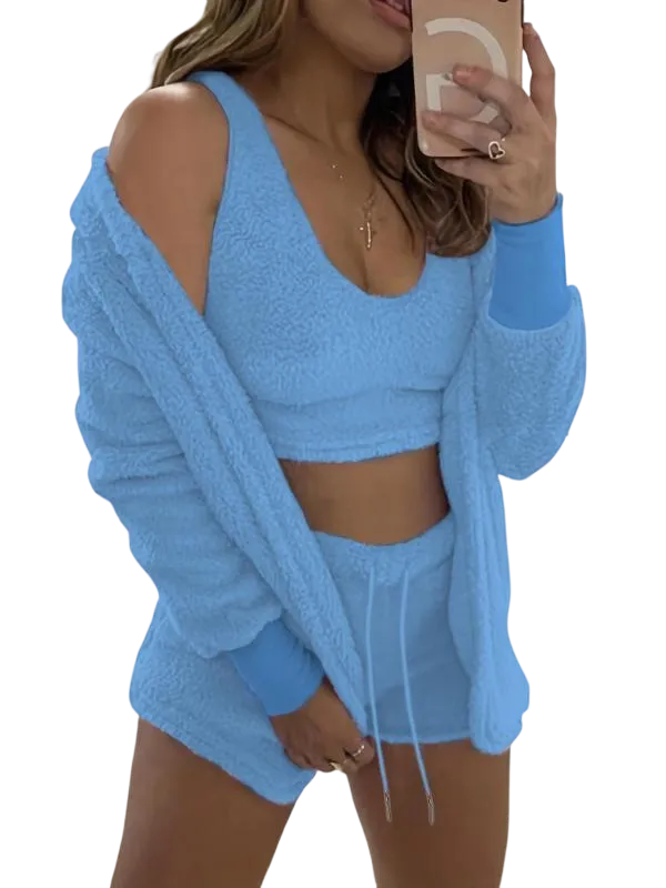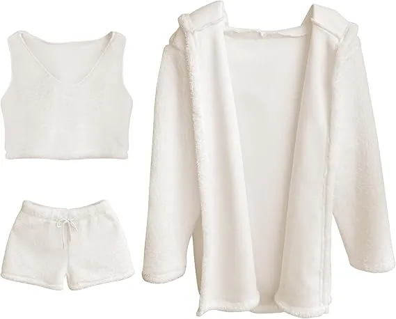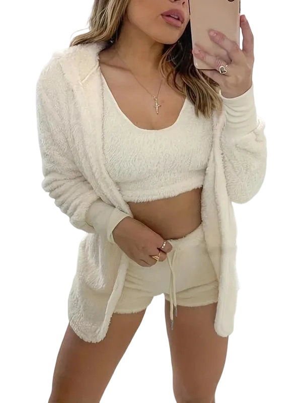 Women's 3-Piece Plush Pajama Set: Drop Shoulder Hoodie, Crop Top & Shorts