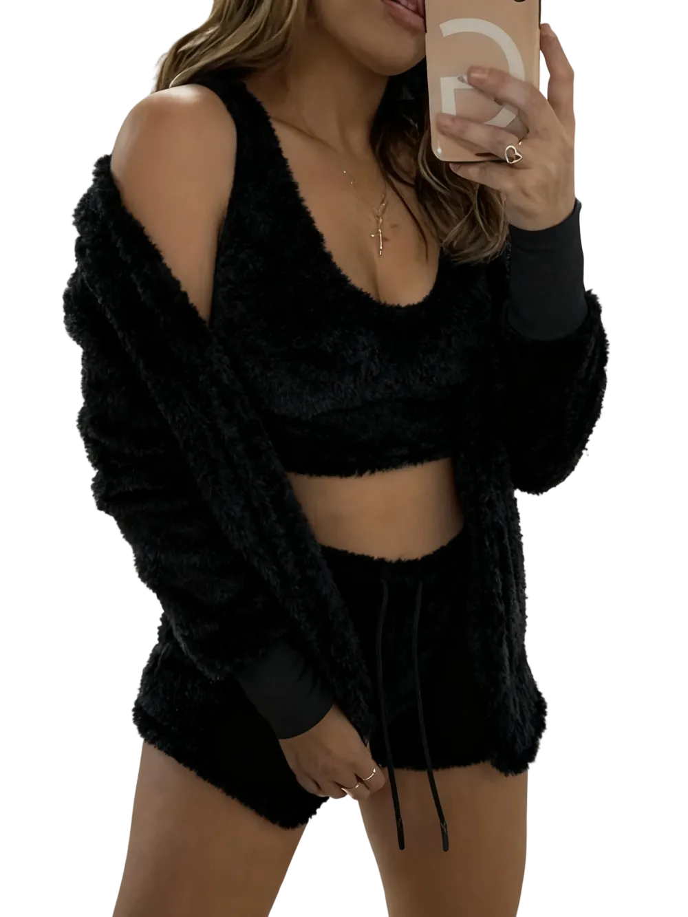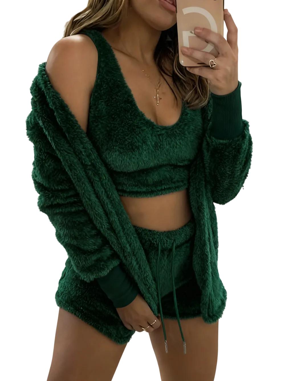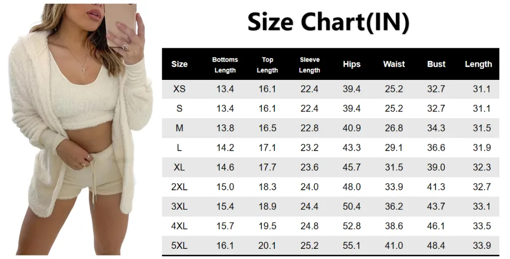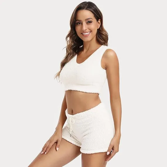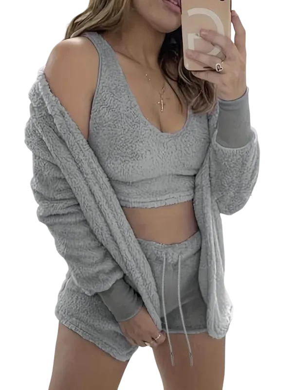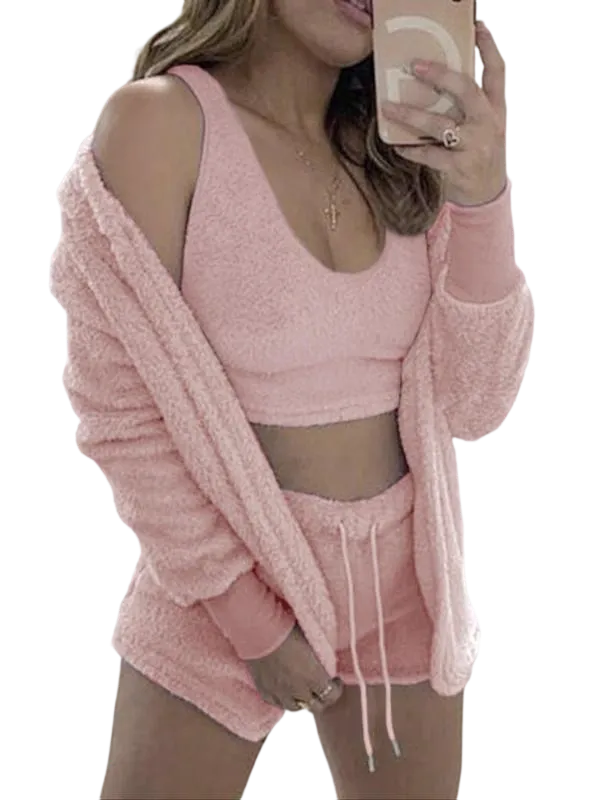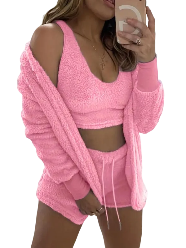 • Women's 3-Piece Plush Pajama Set: Drop Shoulder Hoodie, Crop Top & Shorts