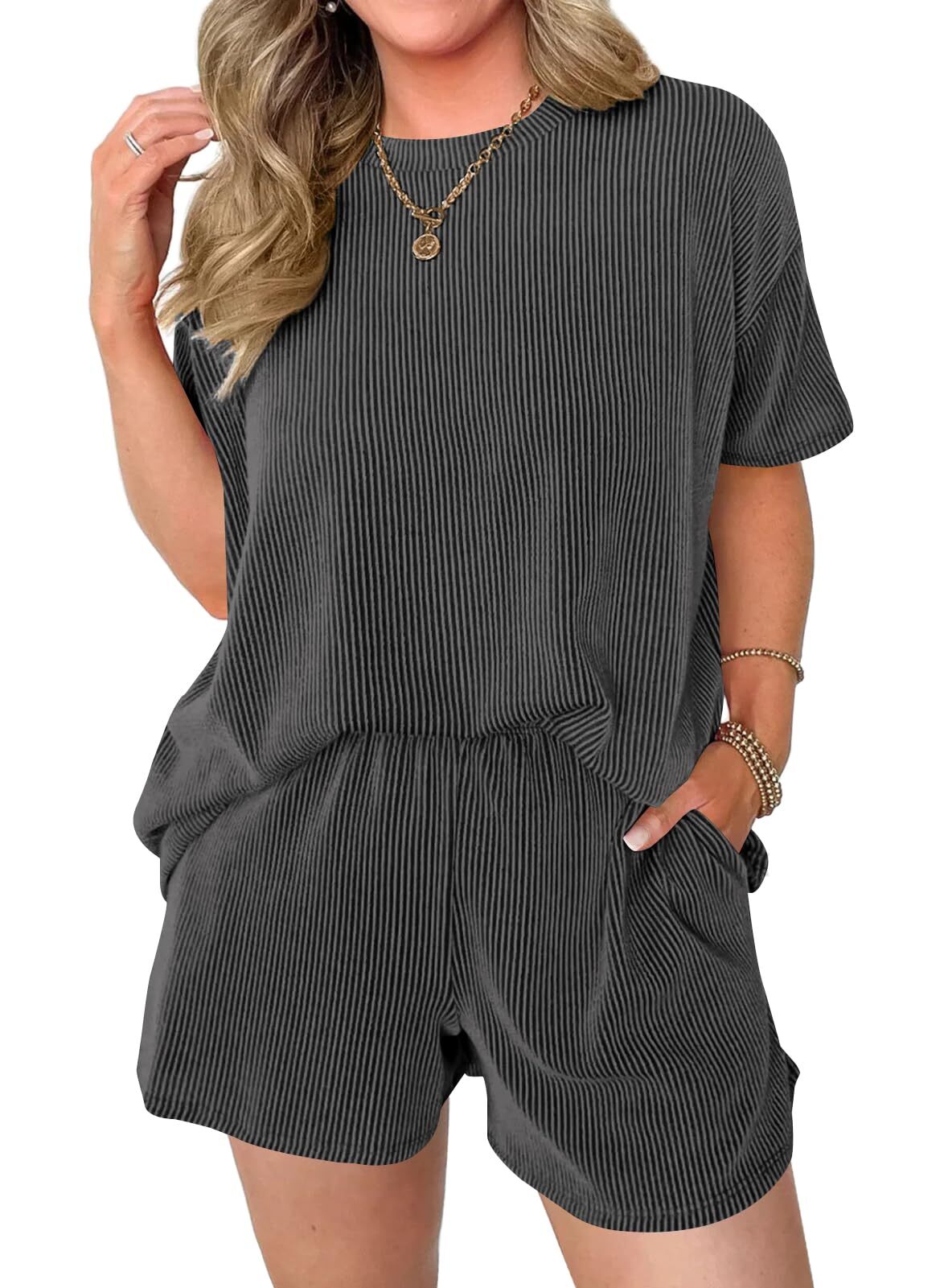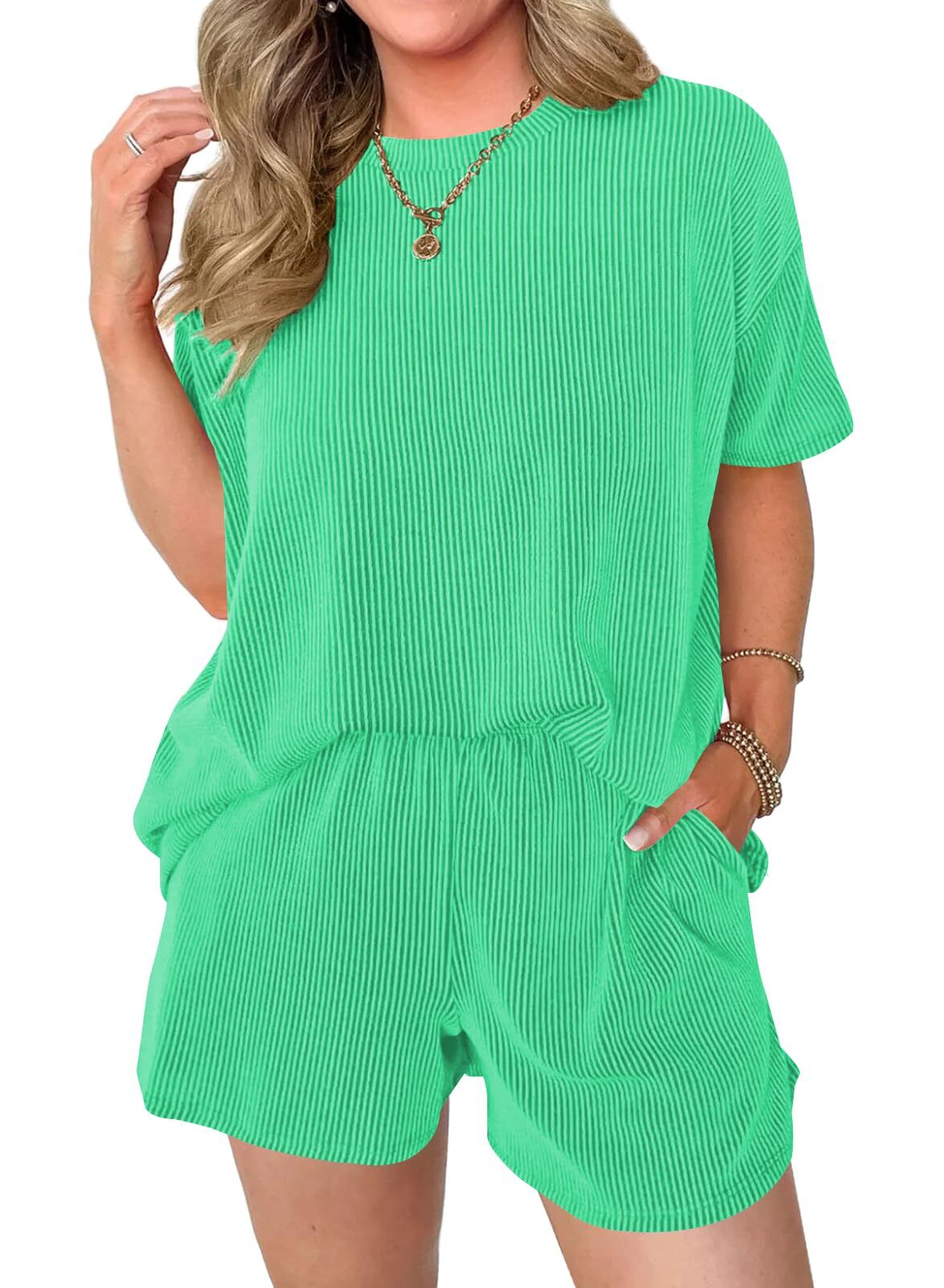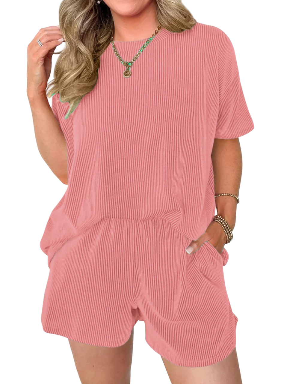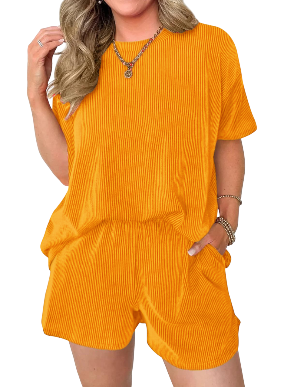 Comfortable Material: Made from a soft and breathable fabric,the round neck tee and the loose-fitting shorts are designed to flatter any body type.The shorts feature an elastic waistband that provides a flexible fit,and Side pockets.
