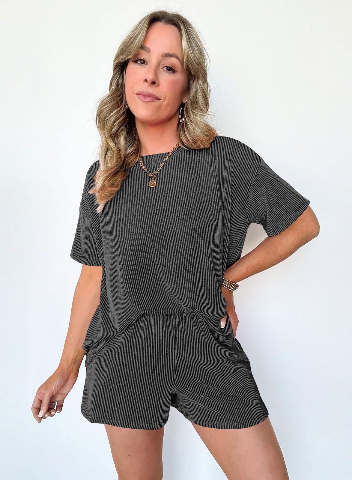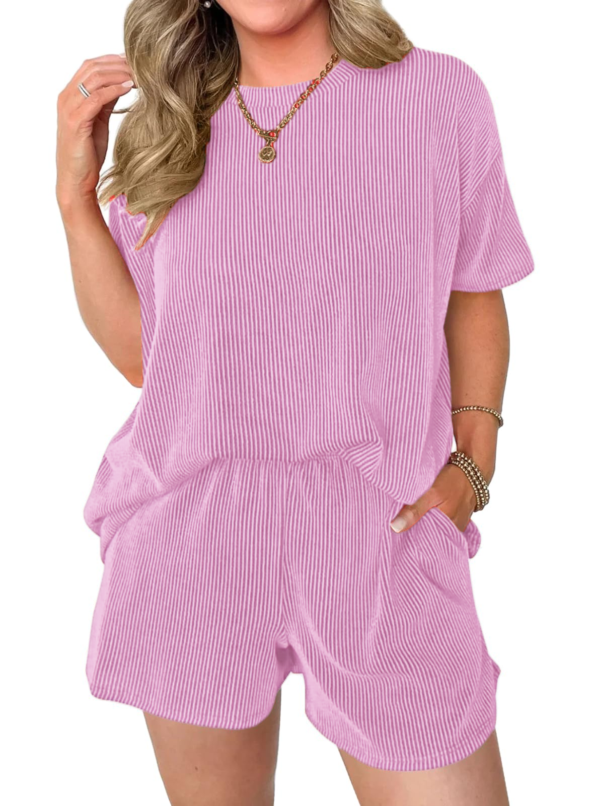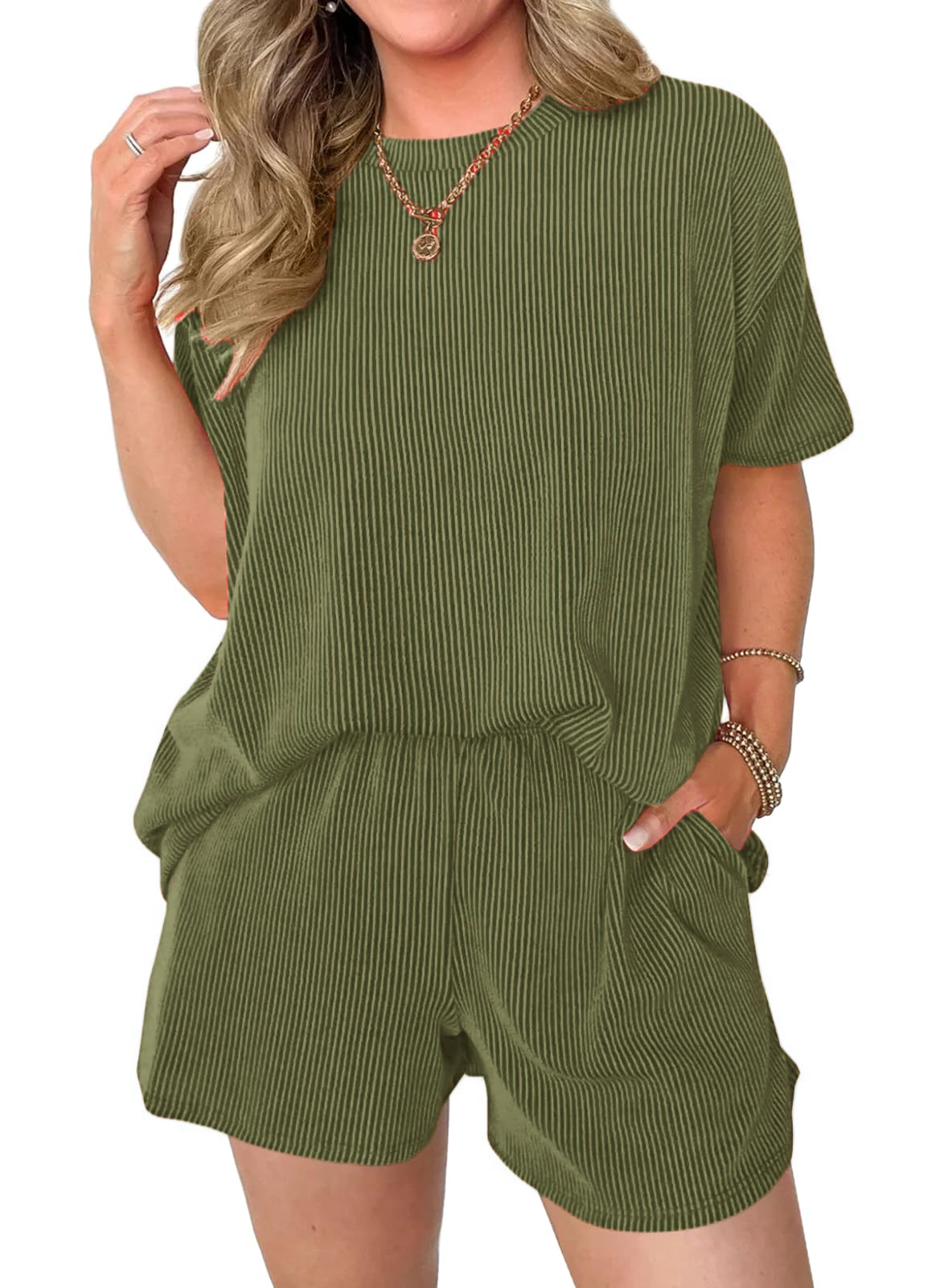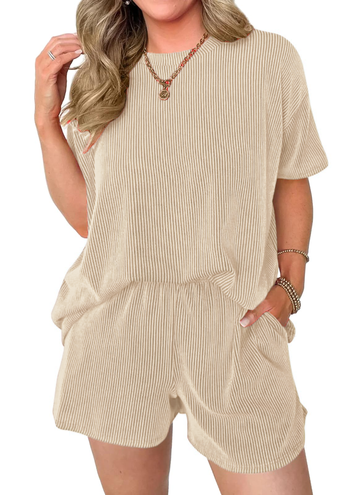Comfortable Material: Made from a soft and breathable fabric,the round neck tee and the loose-fitting shorts are designed to flatter any body type.The shorts feature an elastic waistband that provides a flexible fit,and Side pockets.