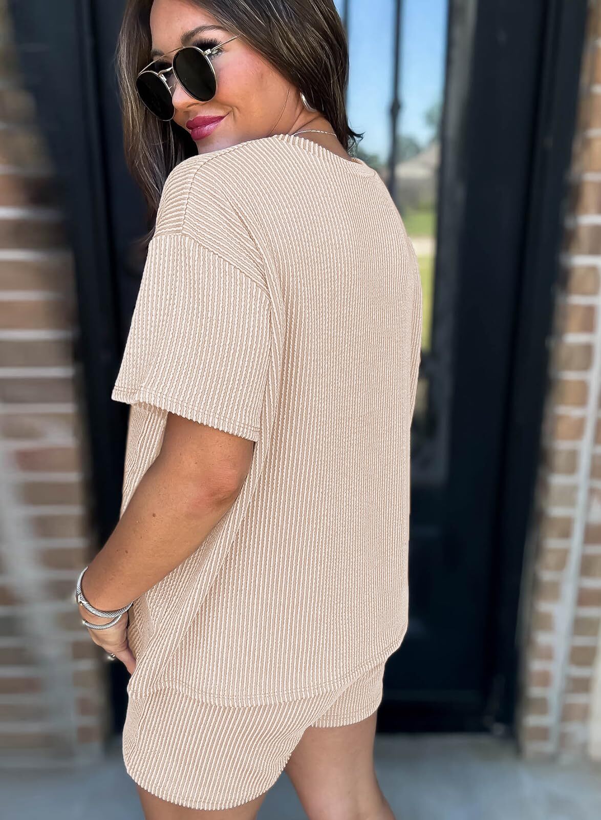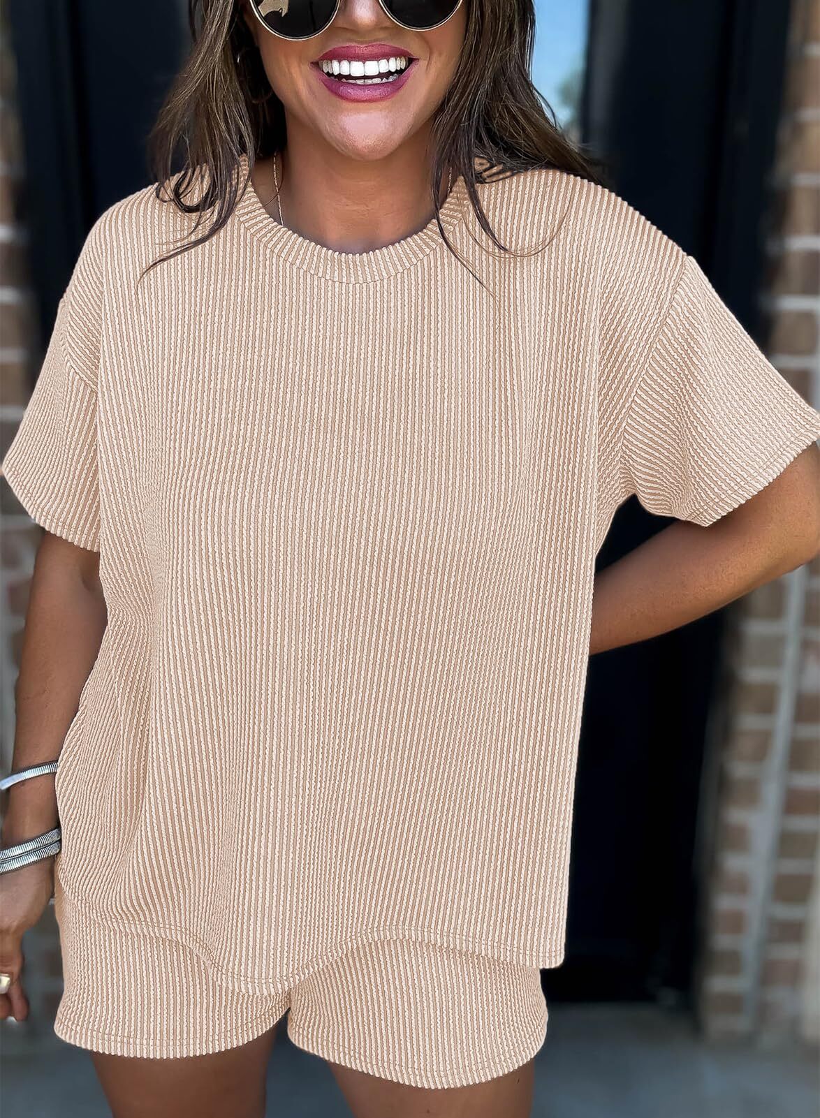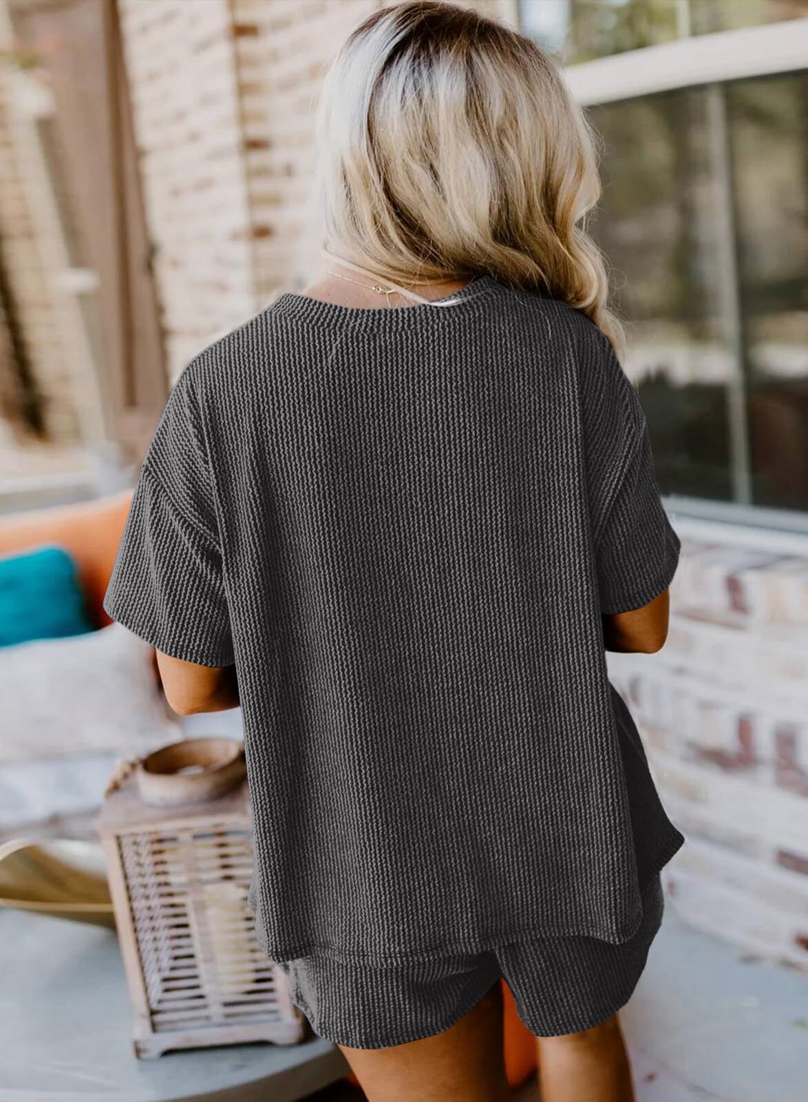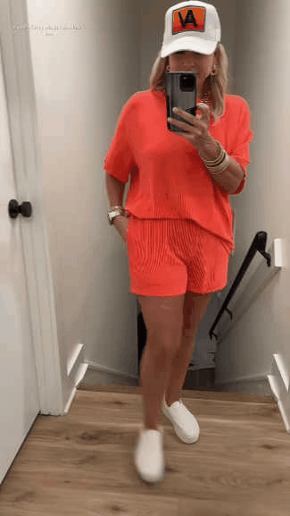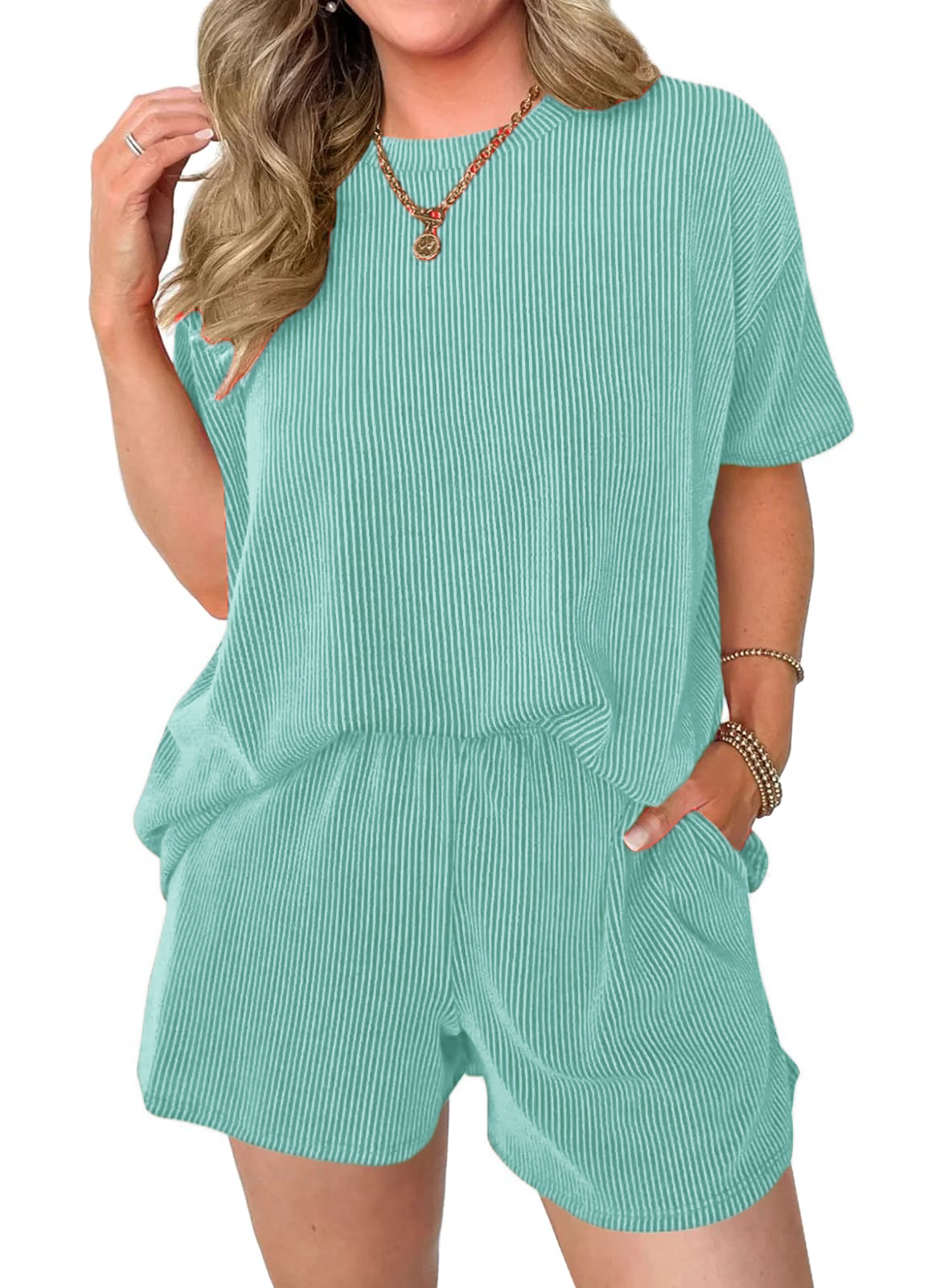 Comfortable Material: Made from a soft and breathable fabric,the round neck tee and the loose-fitting shorts are designed to flatter any body type.The shorts feature an elastic waistband that provides a flexible fit,and Side pockets.