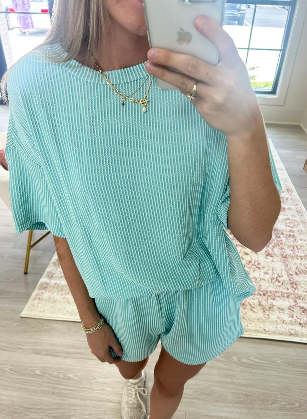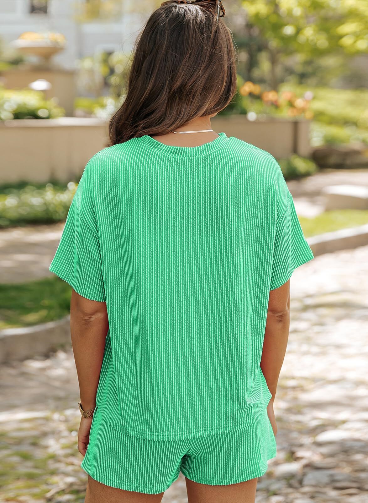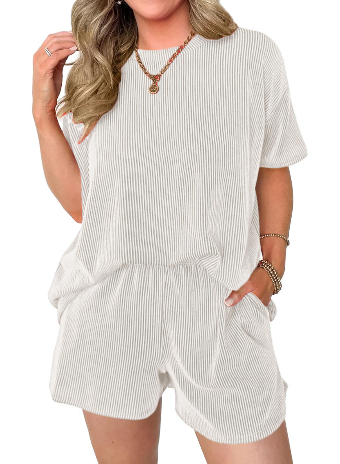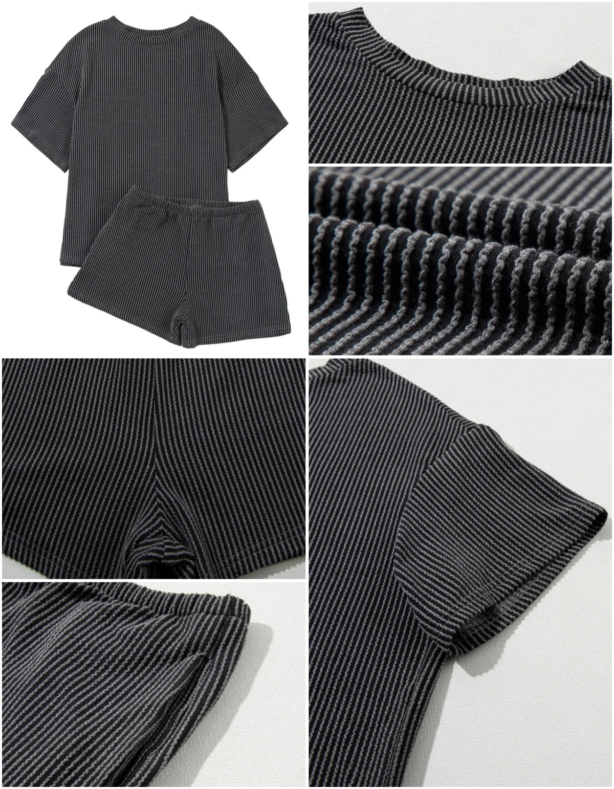 Comfortable Material: Made from a soft and breathable fabric,the round neck tee and the loose-fitting shorts are designed to flatter any body type.The shorts feature an elastic waistband that provides a flexible fit,and Side pockets.