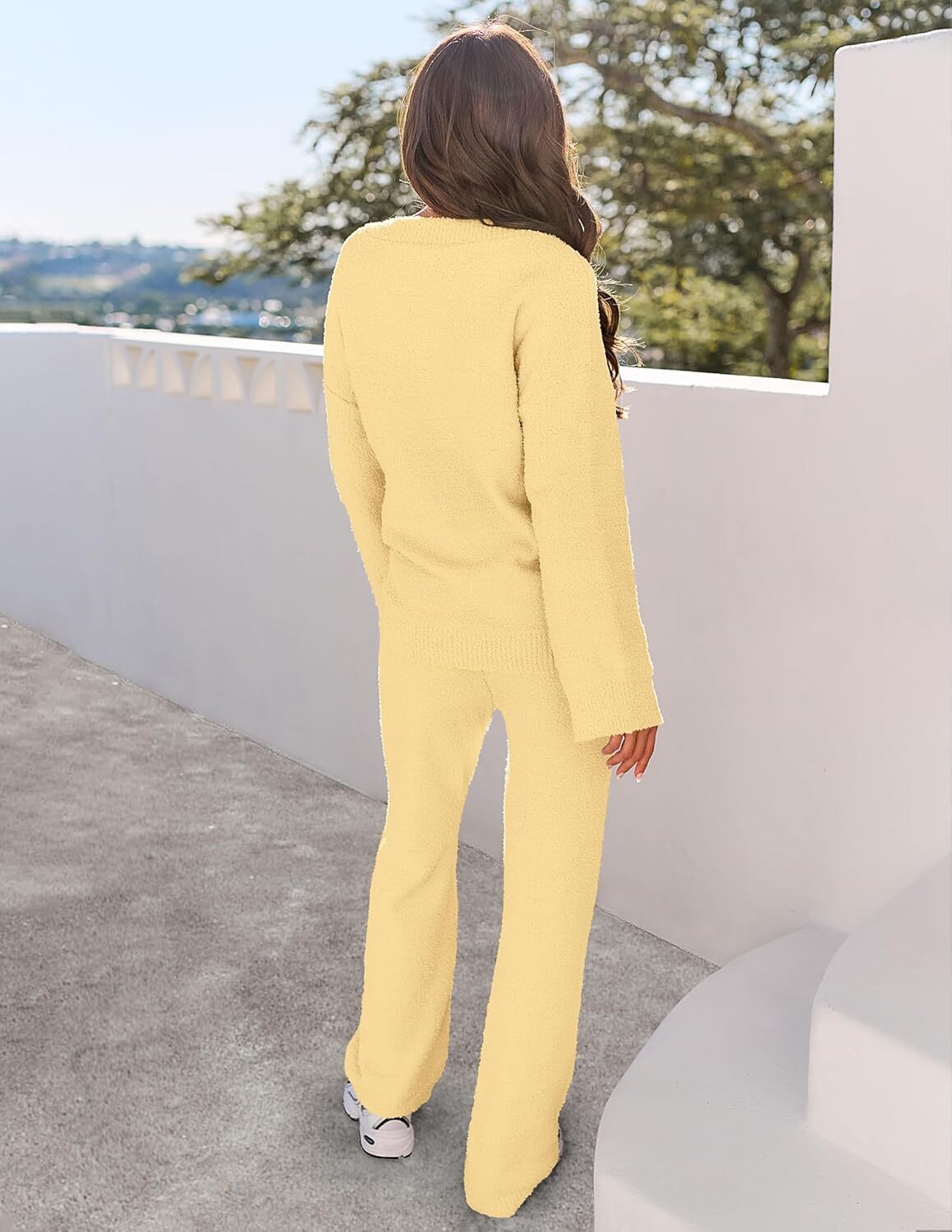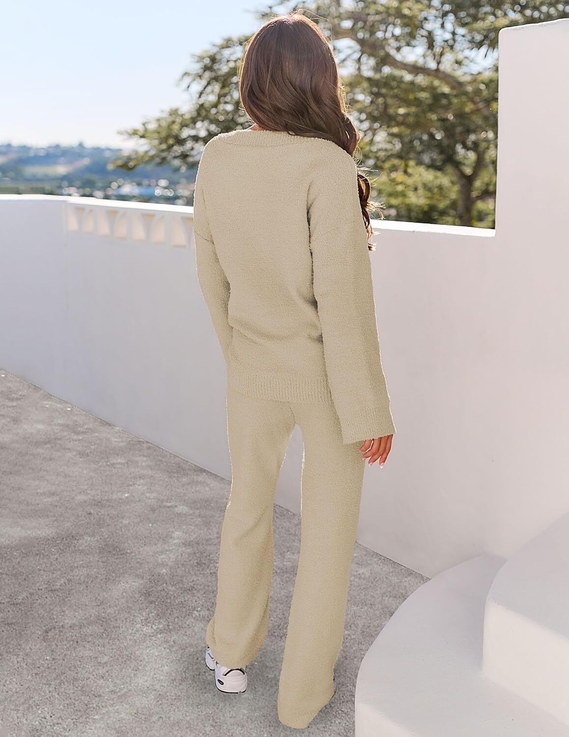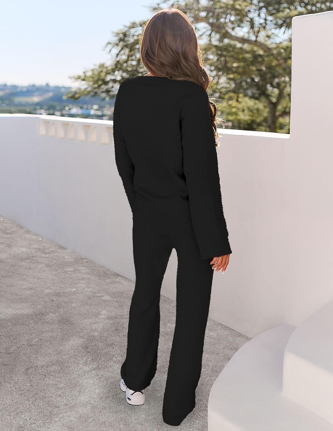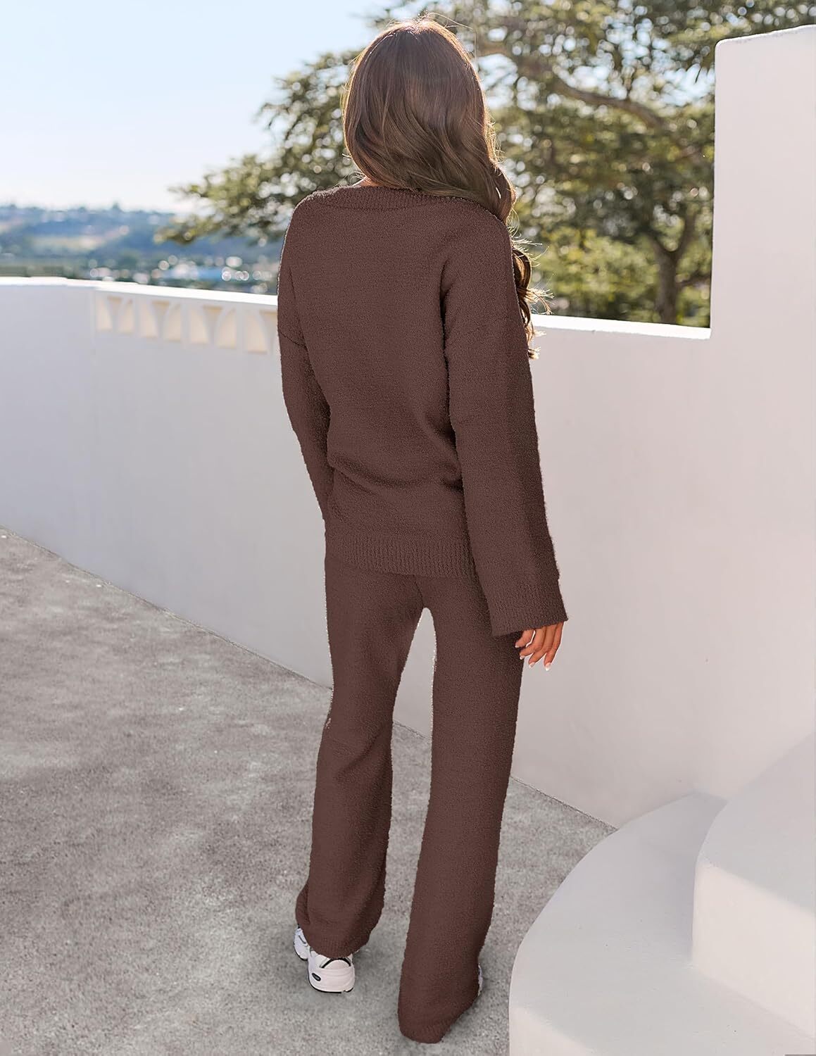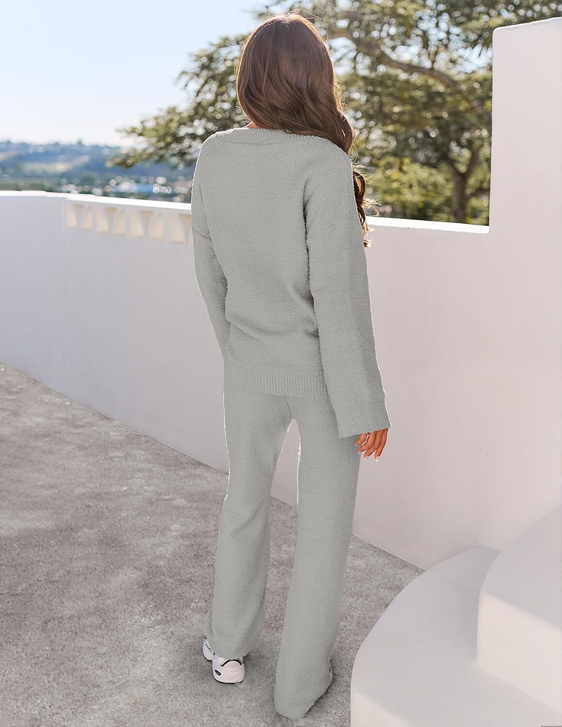 Trendy Fall Long Sleeve V Neck Knit Pullover Sweater Top and Wide Leg Pants