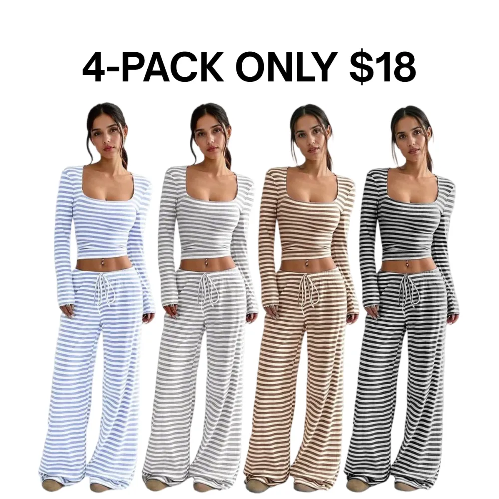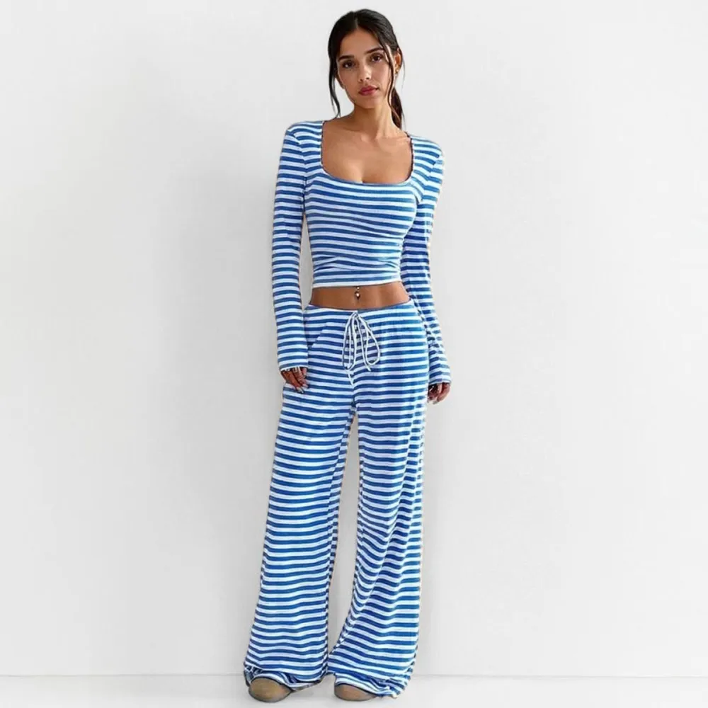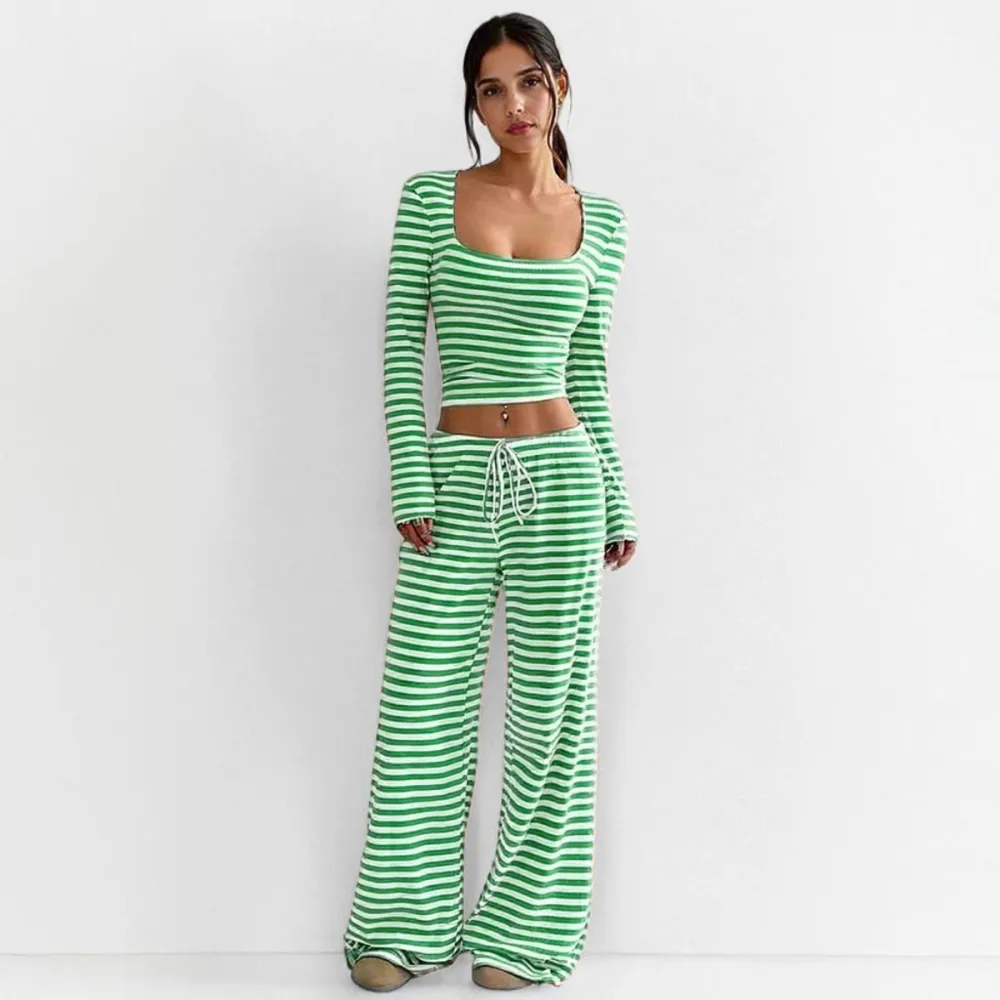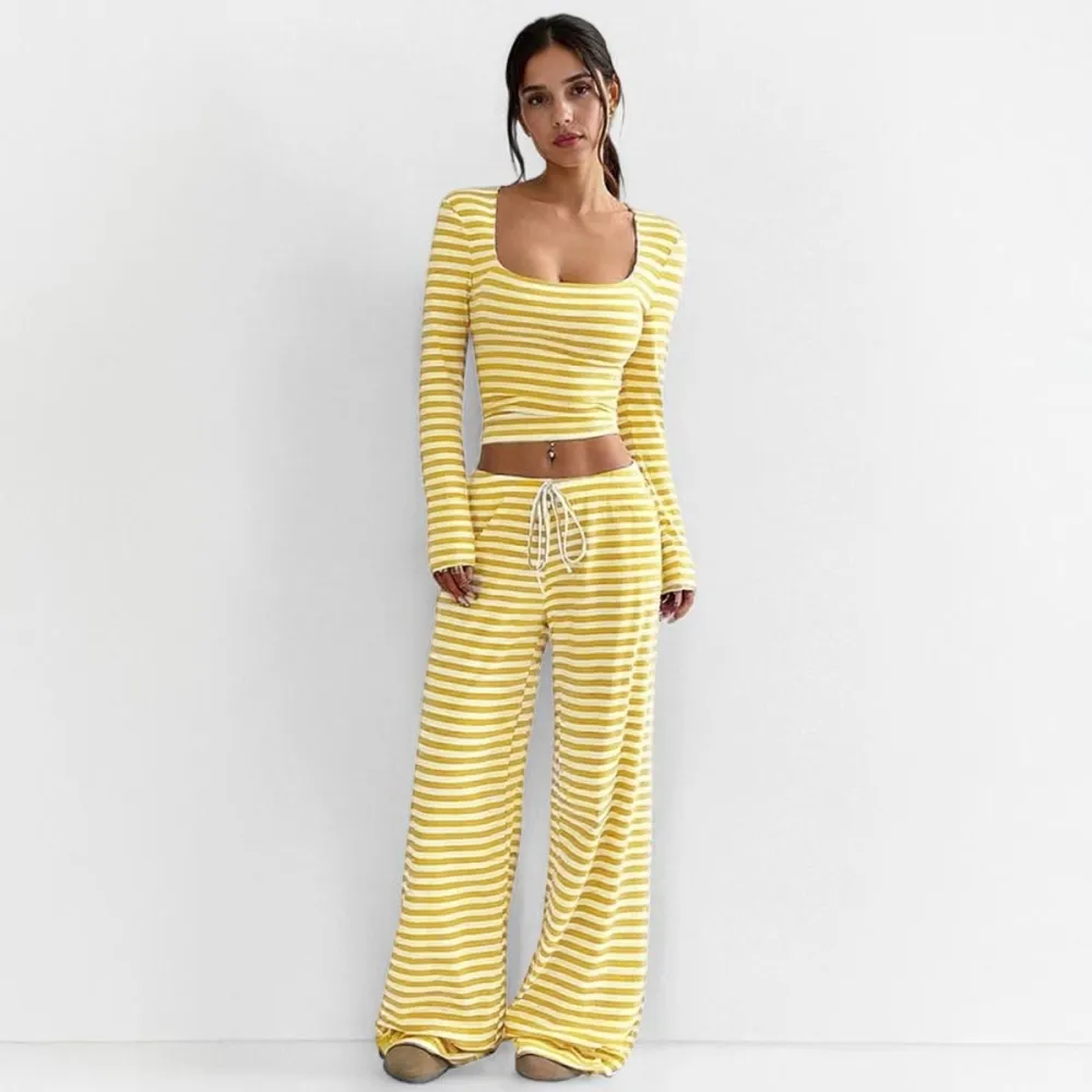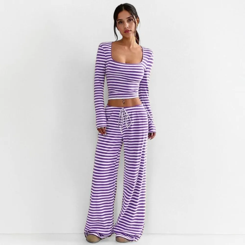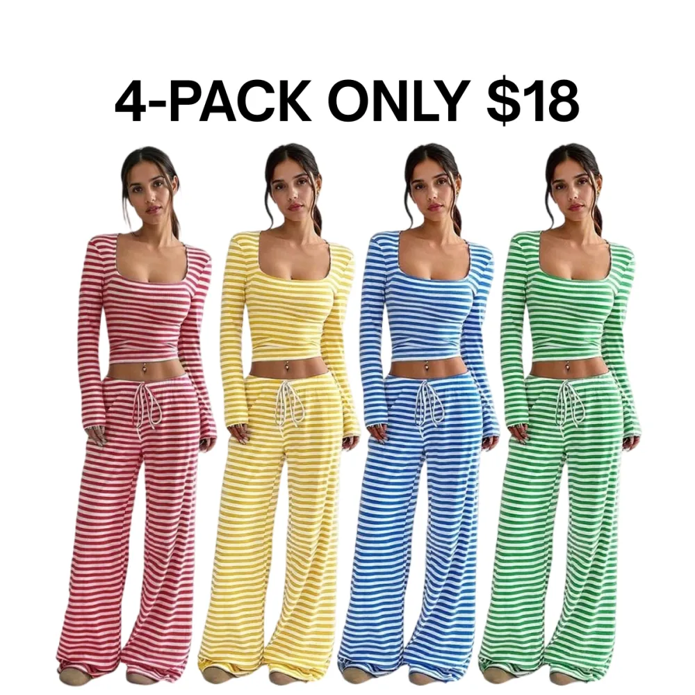 • Women's 2 Piece Outfit Striped Square Neck Long Sleeve Crop Tops and Pants Set
