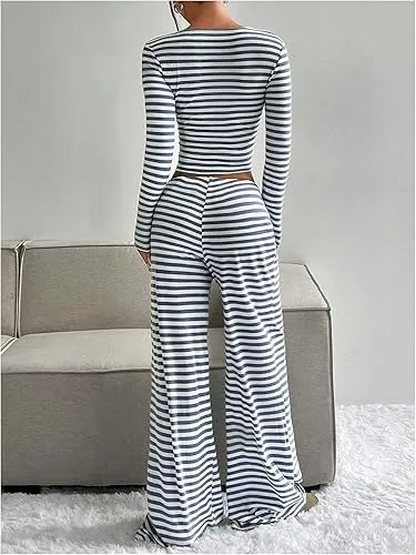 Women's 2 Piece Outfit Striped Square Neck Long Sleeve Crop Tops and Pants Set