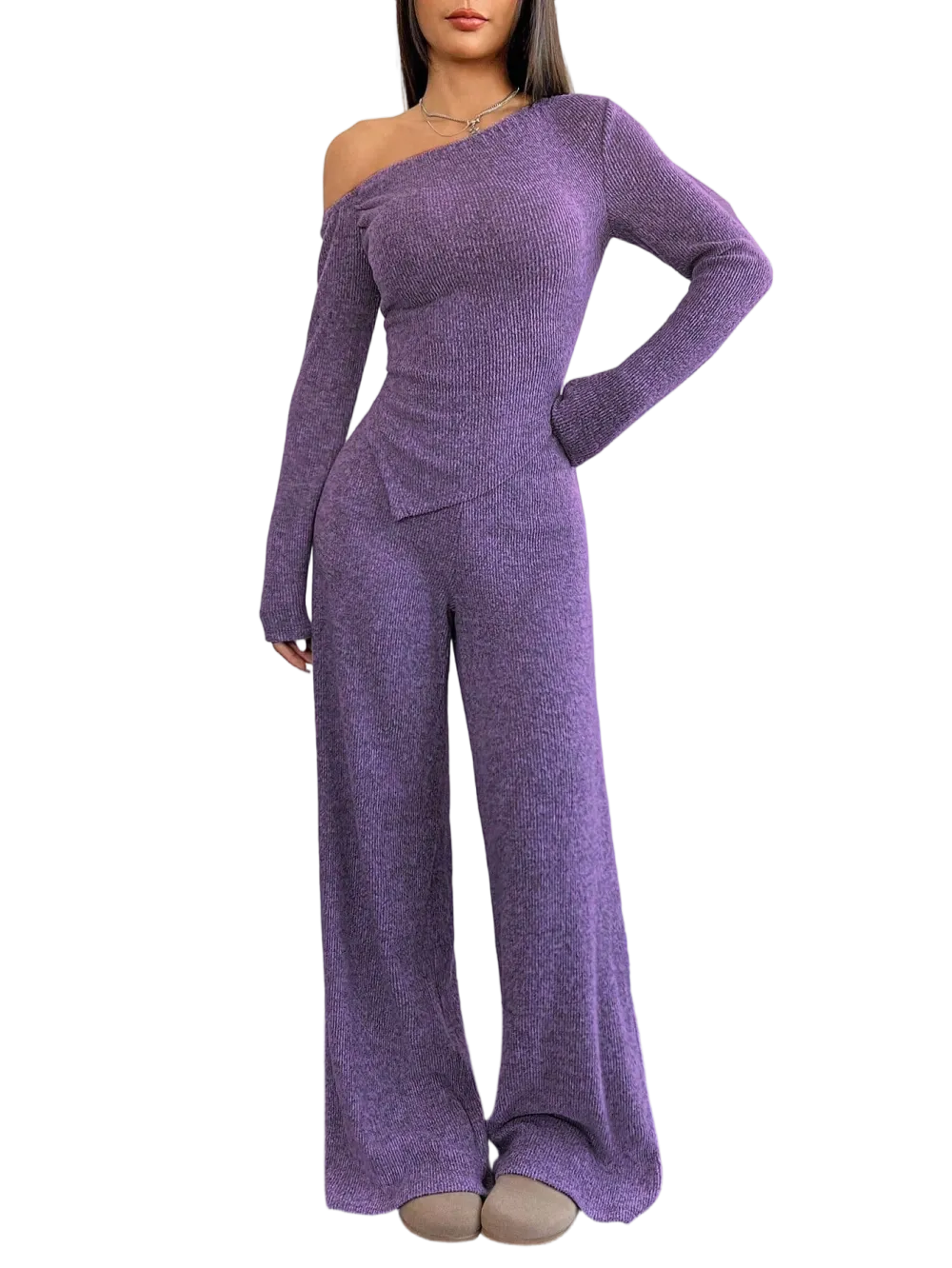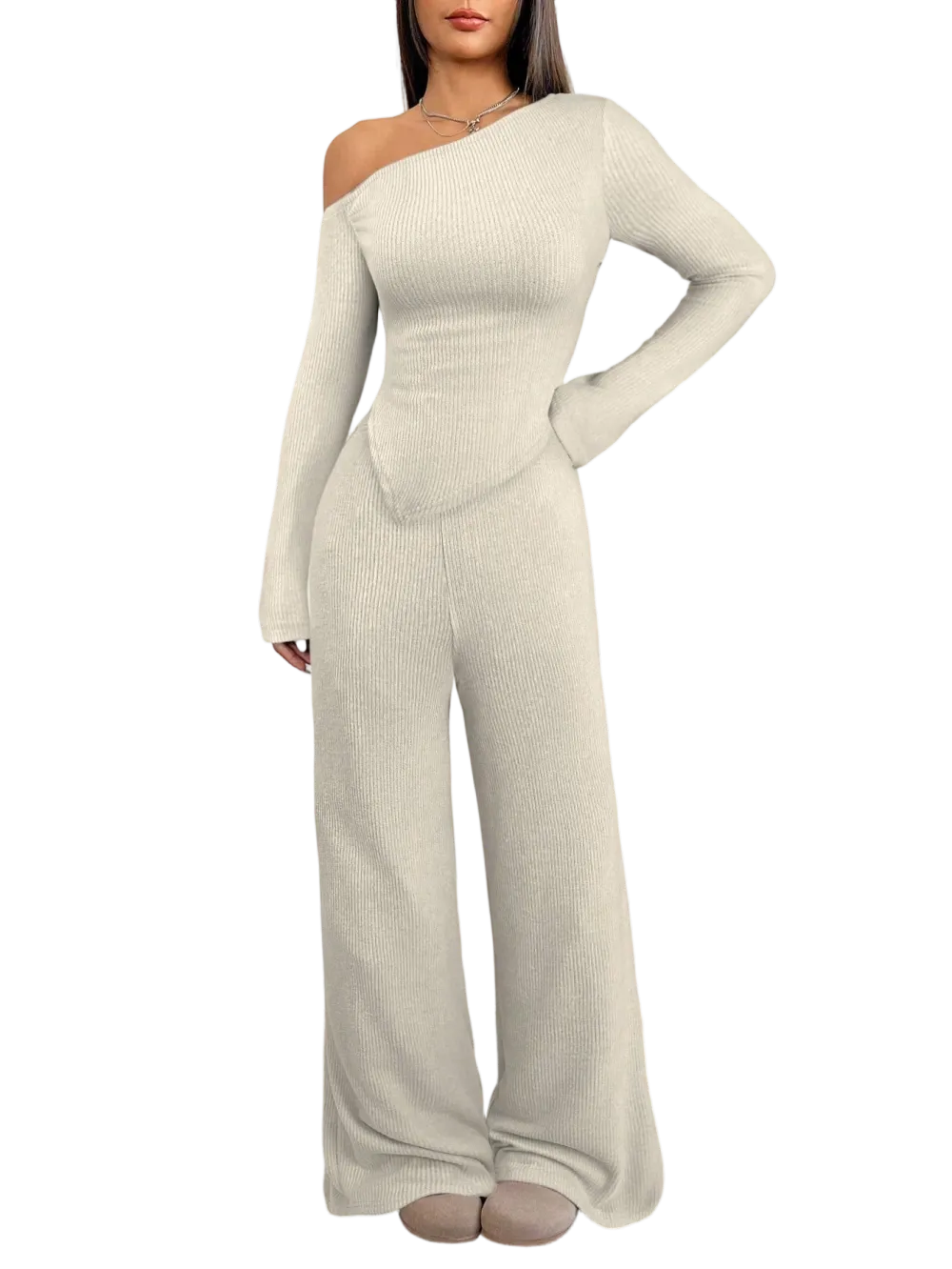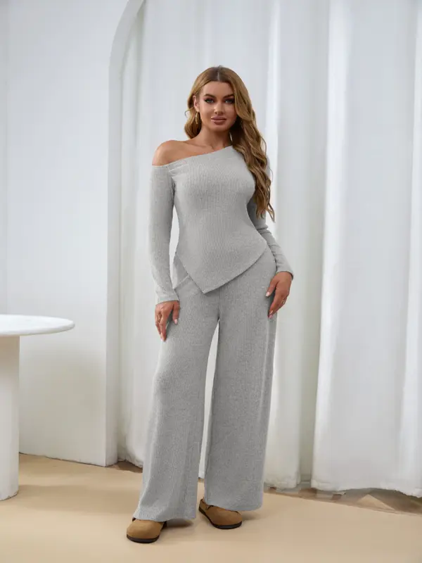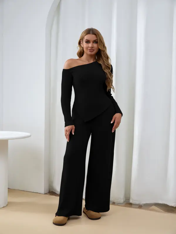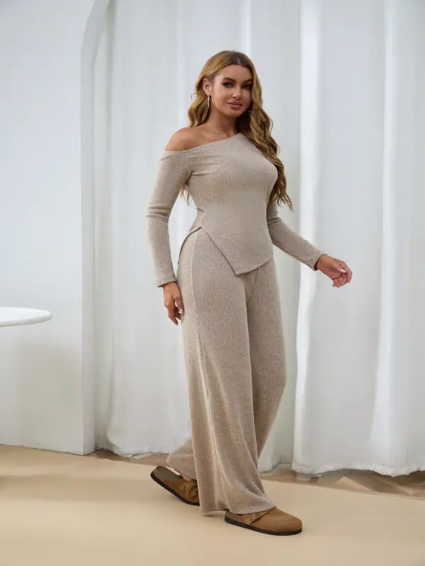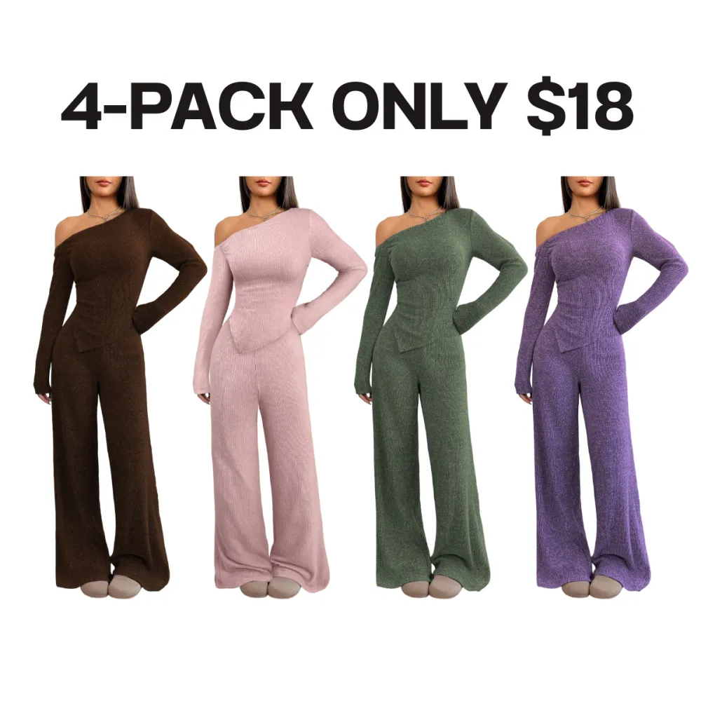 【8 Complete Winter Sets】Includes eight full sets of asymmetric shoulder tops and wide-leg pants, providing a complete winter wardrobe solution for versatile styling