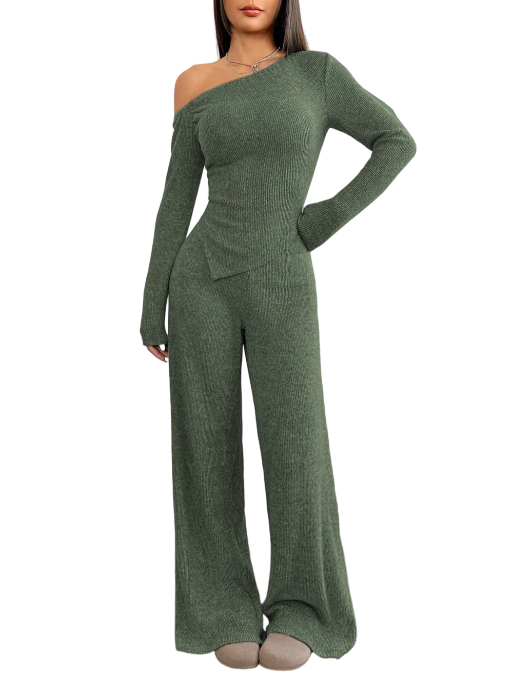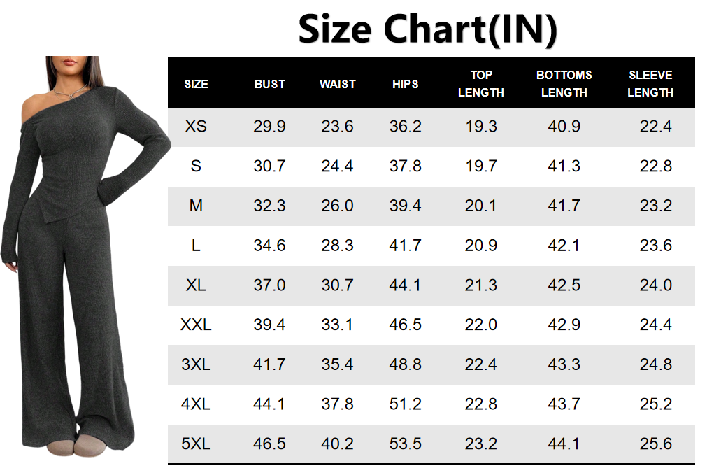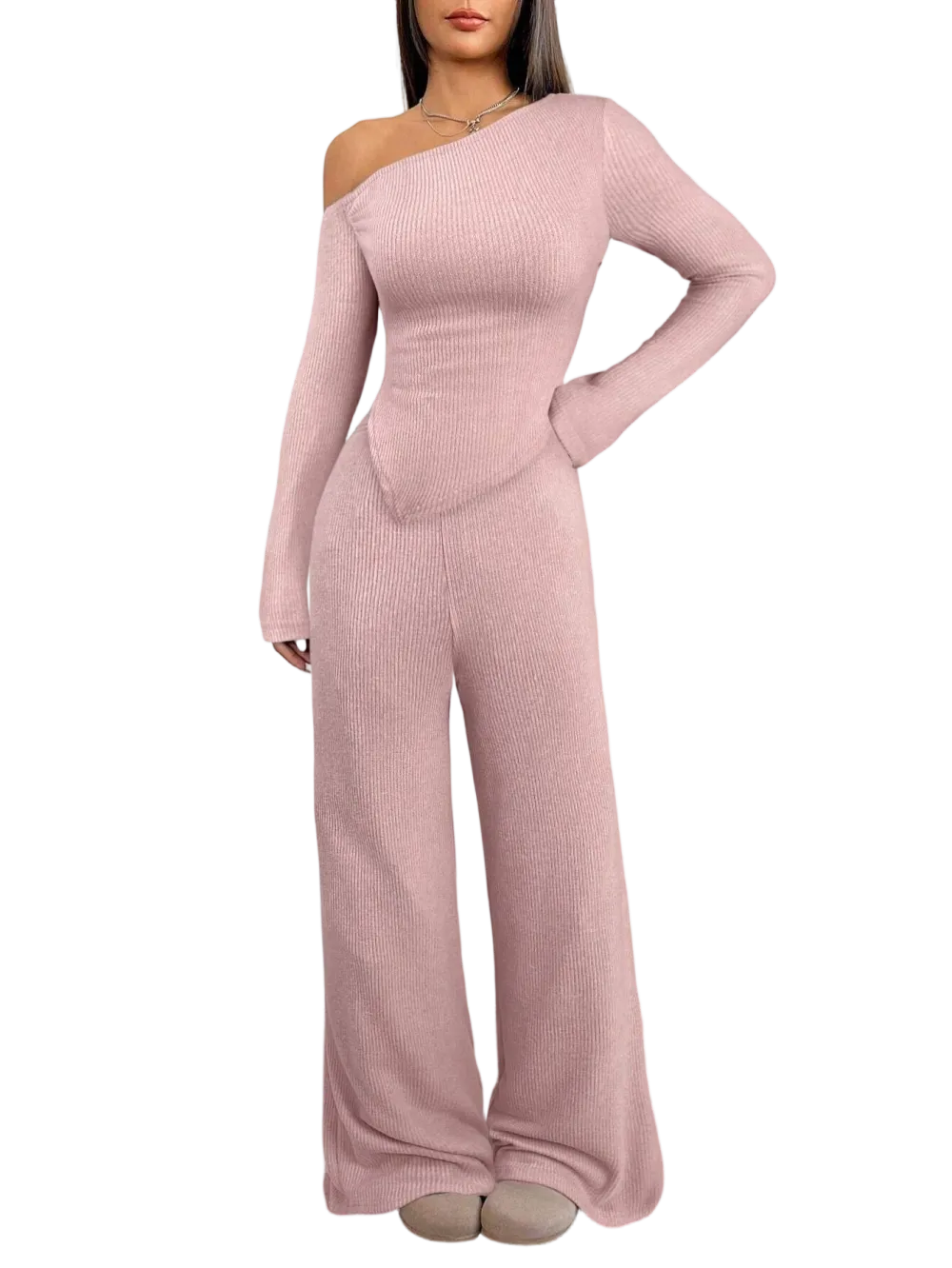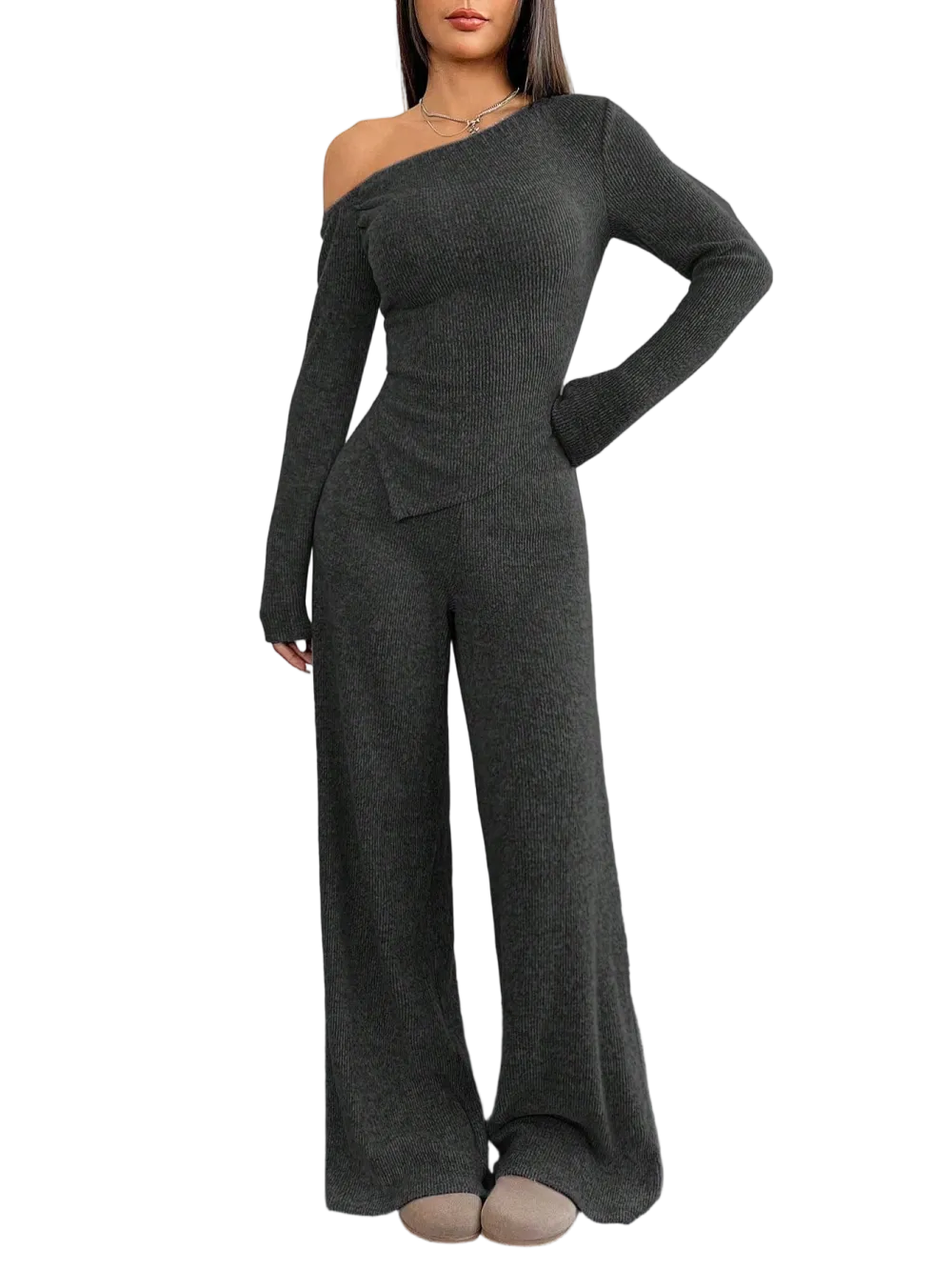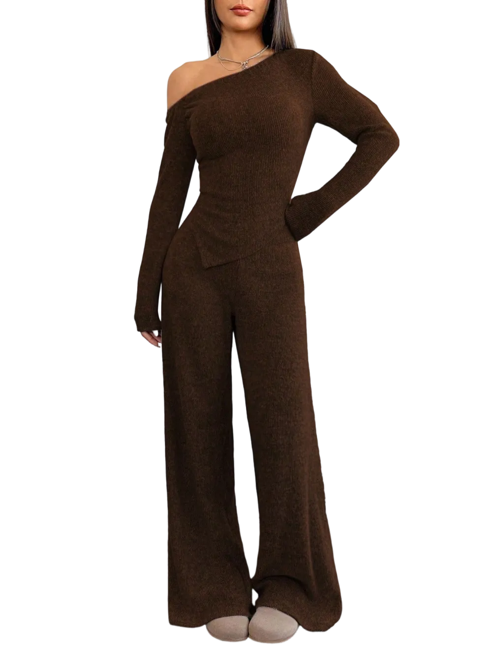 【8 Complete Winter Sets】Includes eight full sets of asymmetric shoulder tops and wide-leg pants, providing a complete winter wardrobe solution for versatile styling