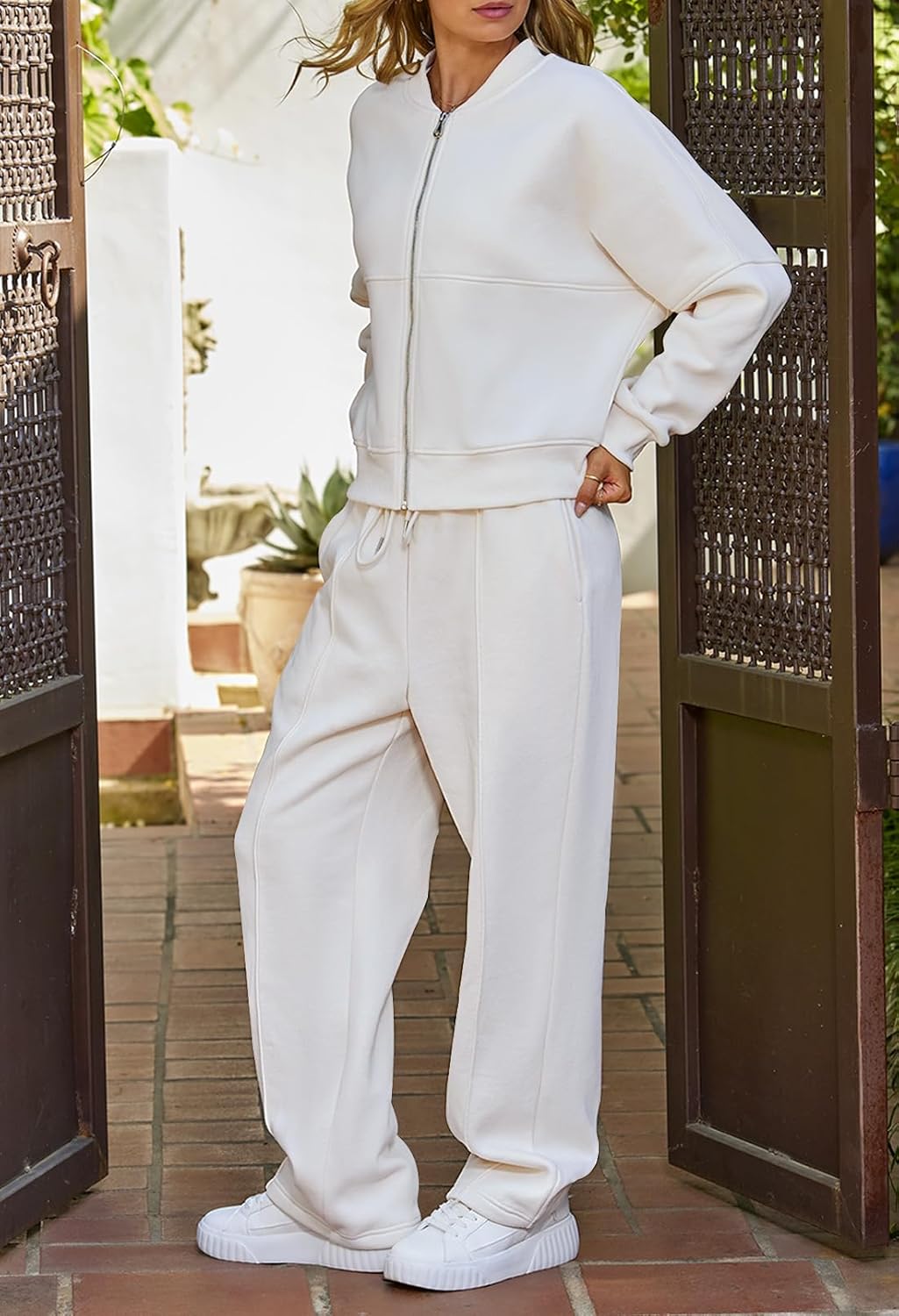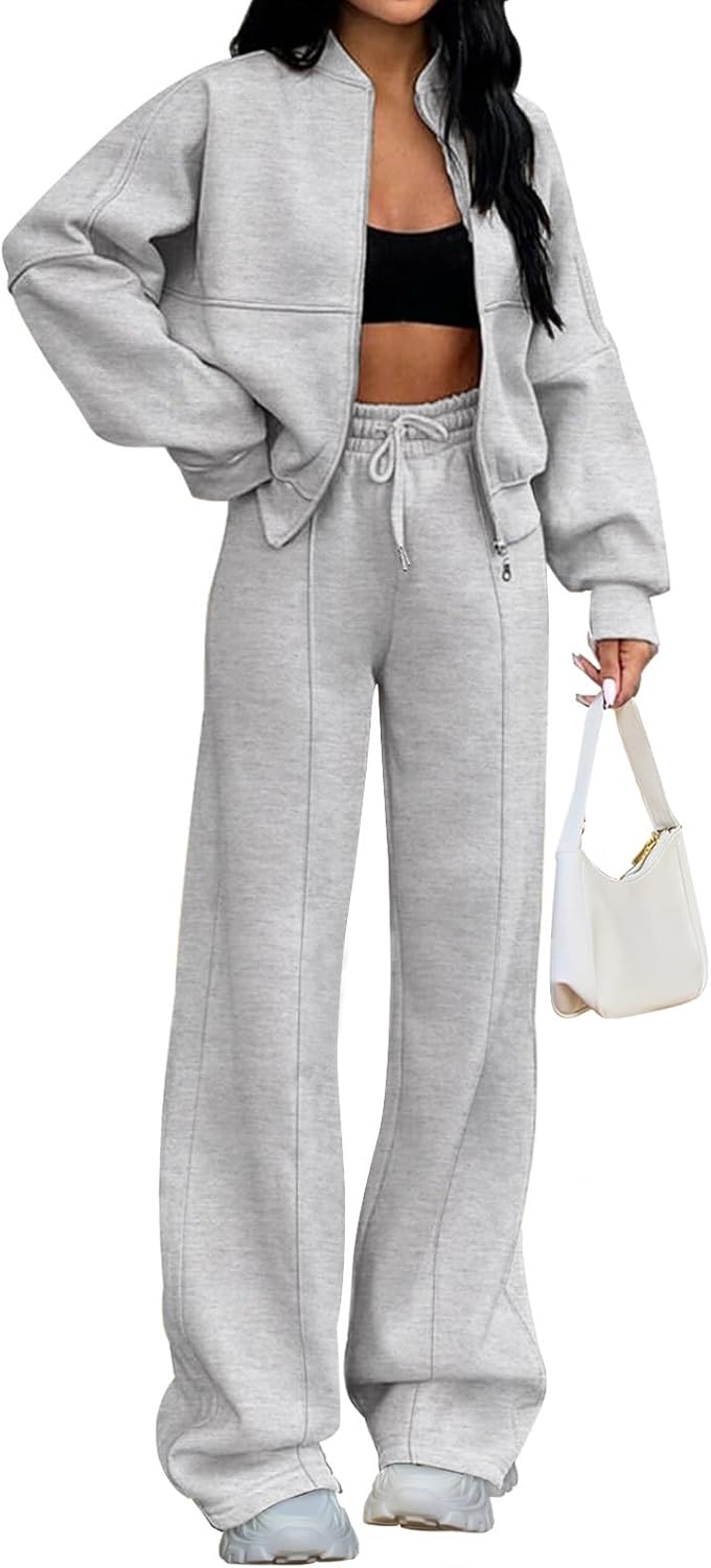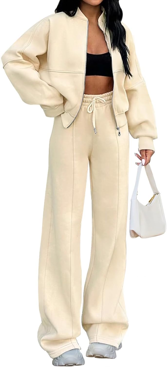 Zip-up jacket and wide-leg sweatpants can be worn together or separately for different looks.