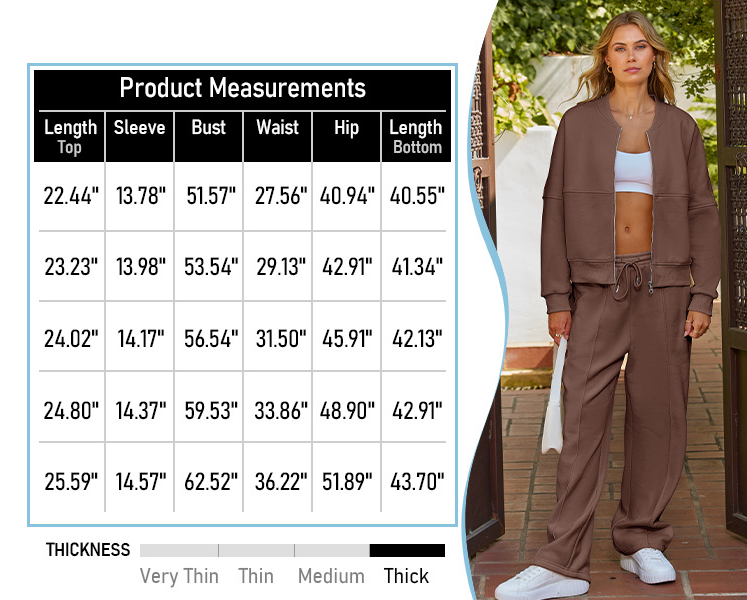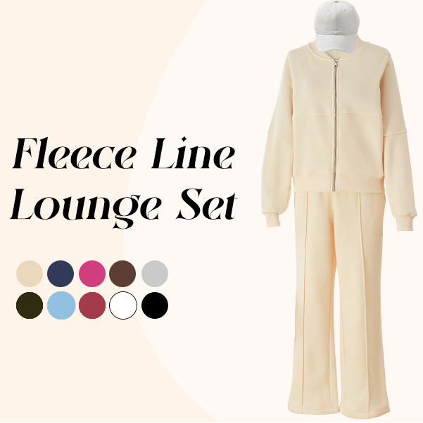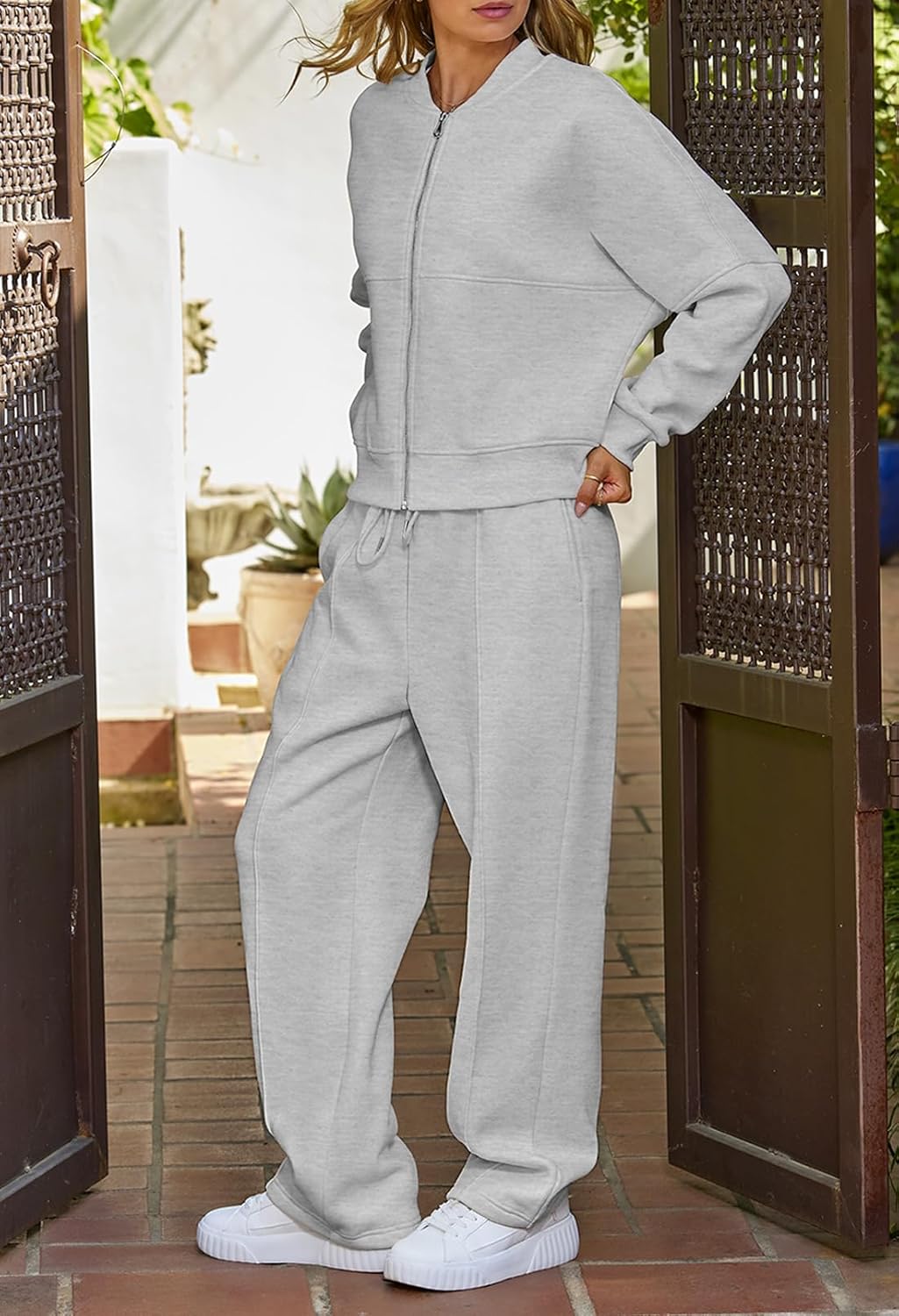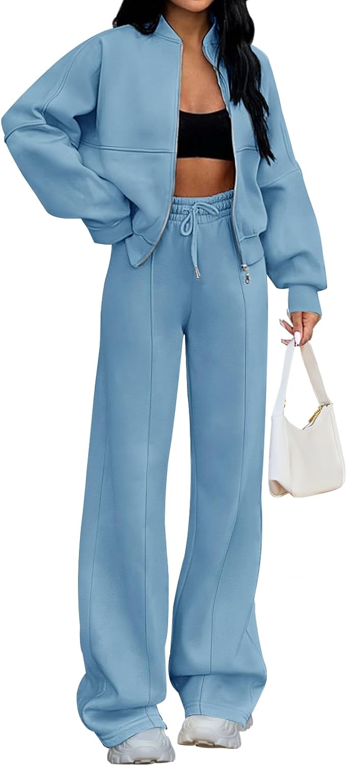 Zip-up jacket and wide-leg sweatpants can be worn together or separately for different looks.