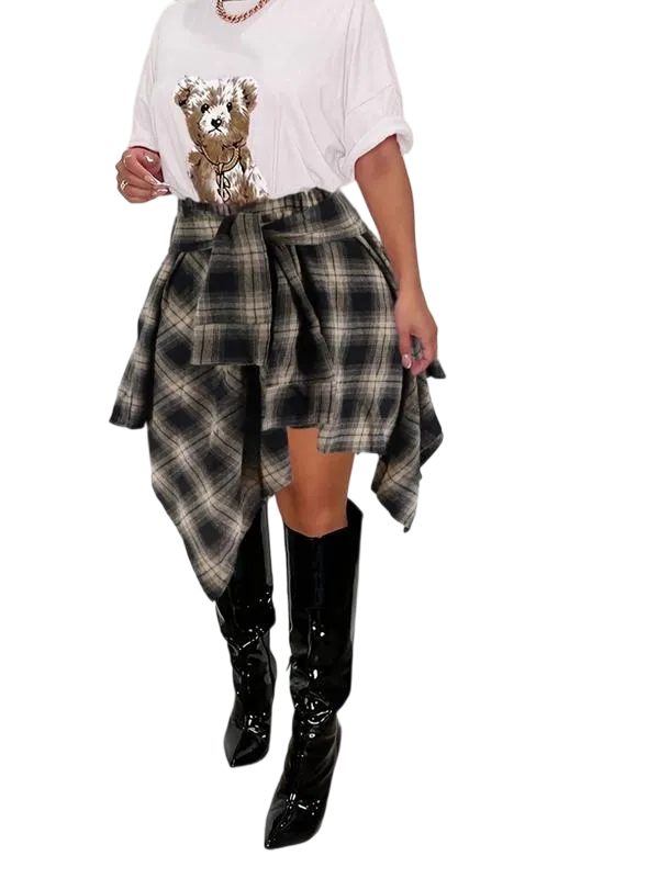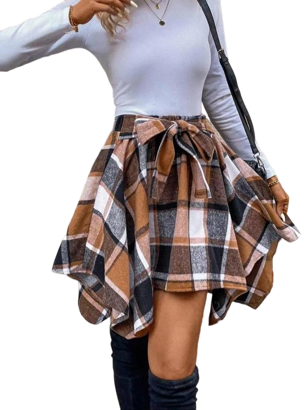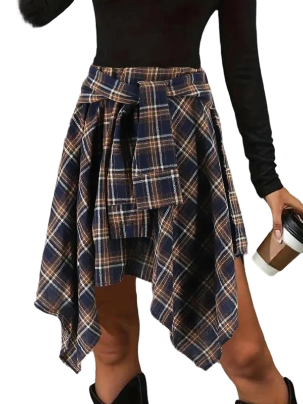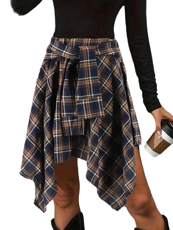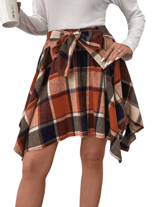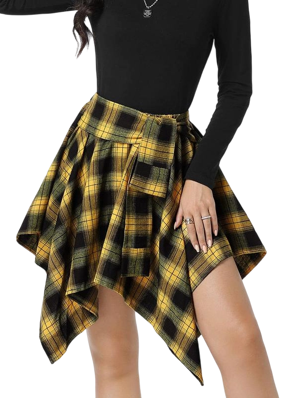| Design | Plaid Print, Asymmetrical Hem, High Waisted |