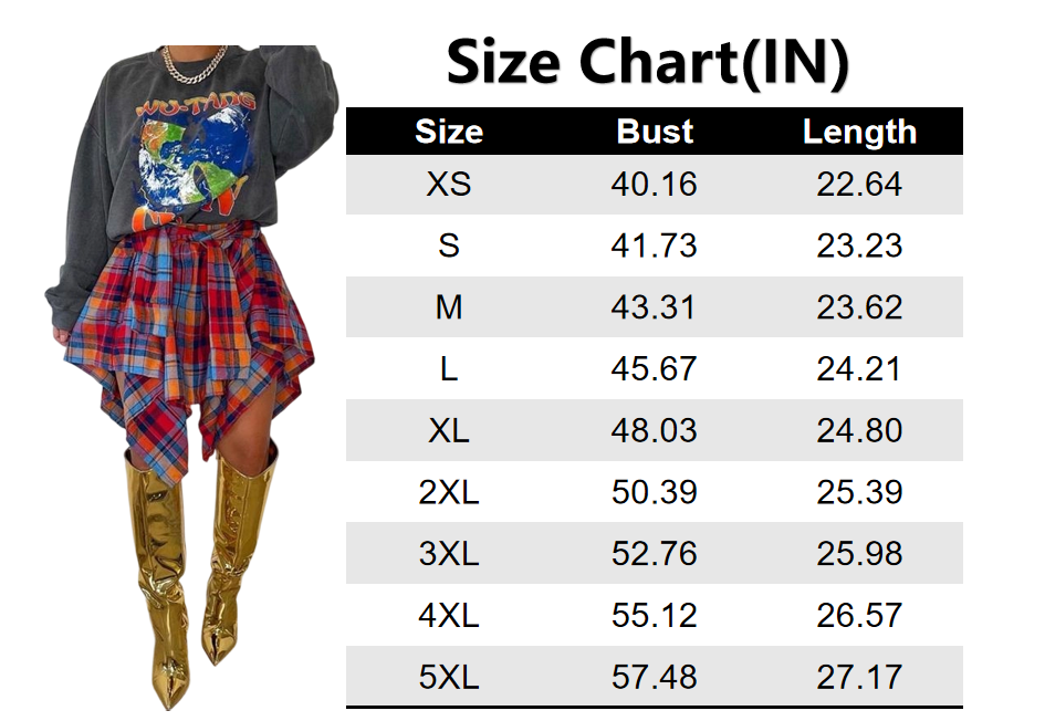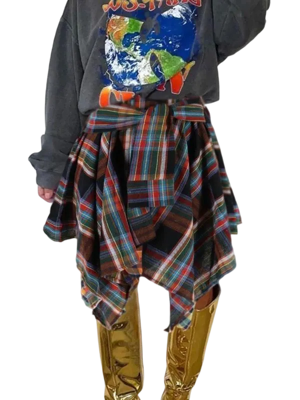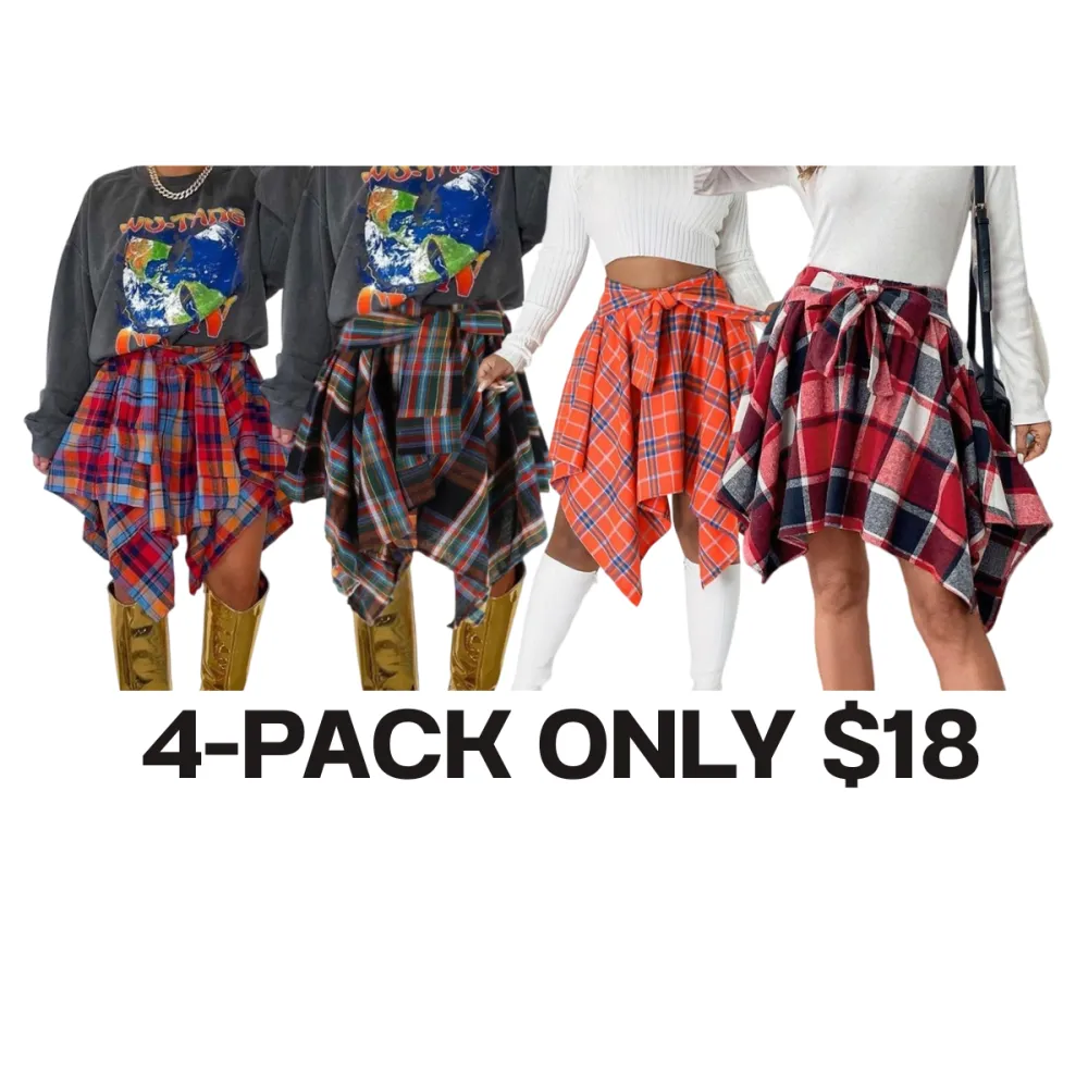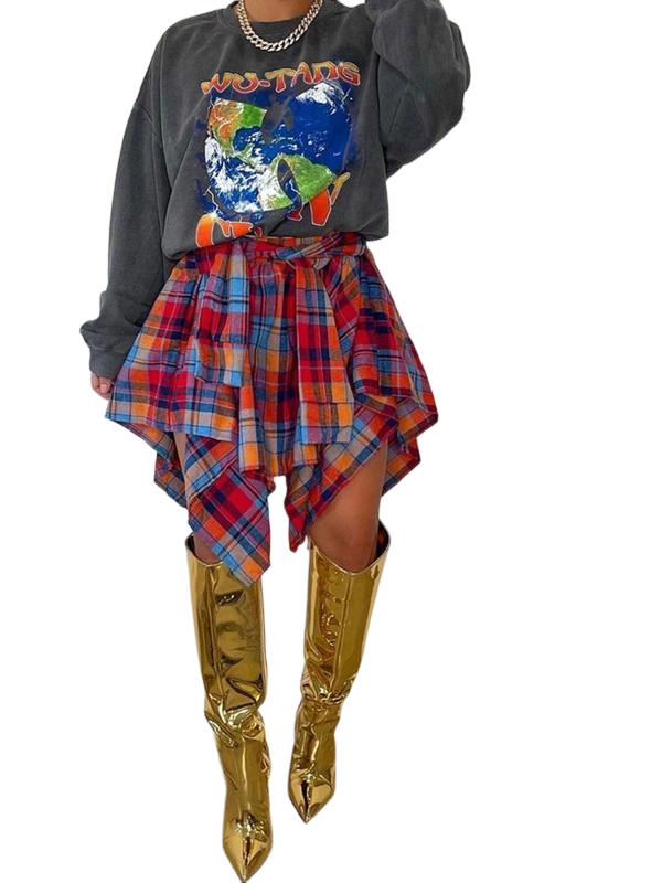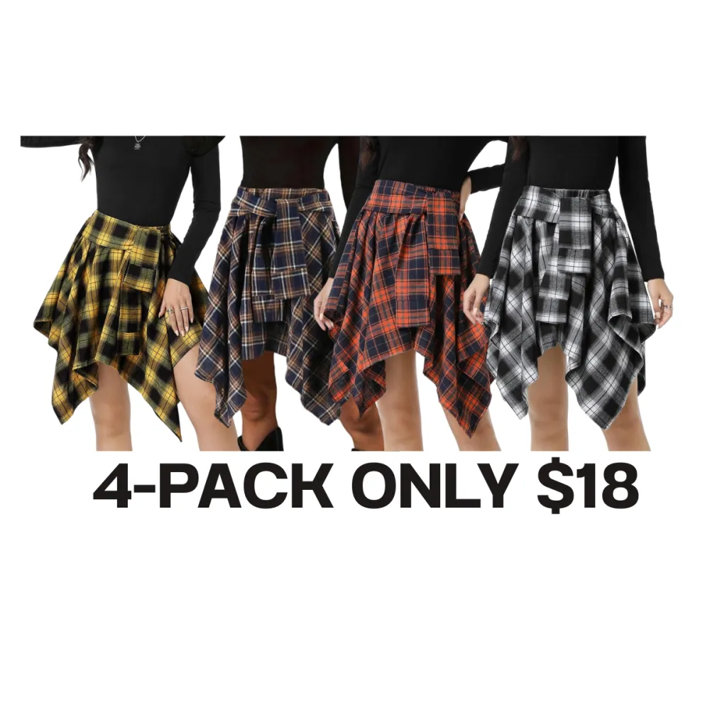 | Design | Plaid Print, Asymmetrical Hem, High Waisted |
