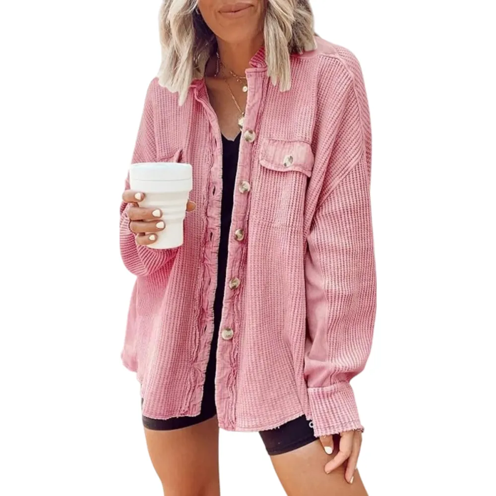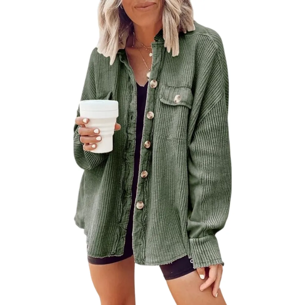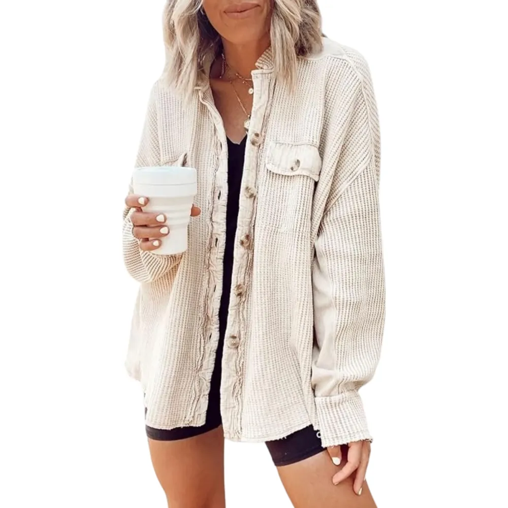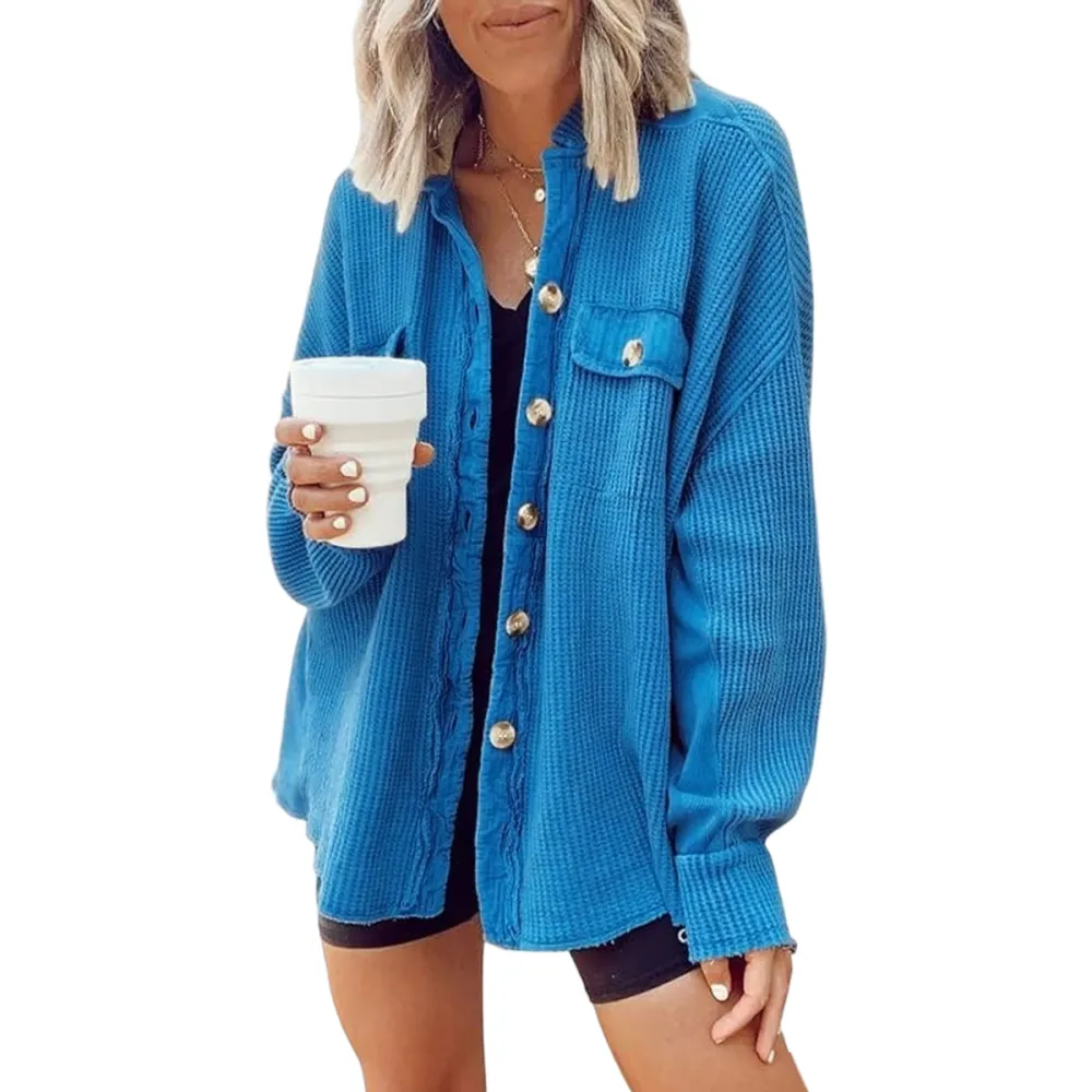 • Women's Loose Fit Batwing Sleeve Waffle Knit Button Down Shirt Shacket Tops