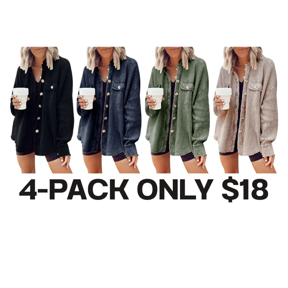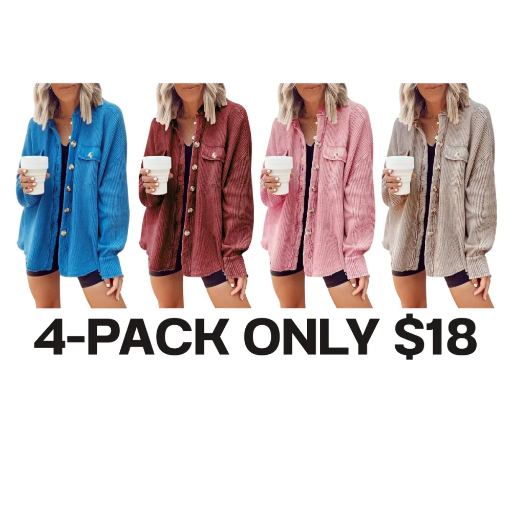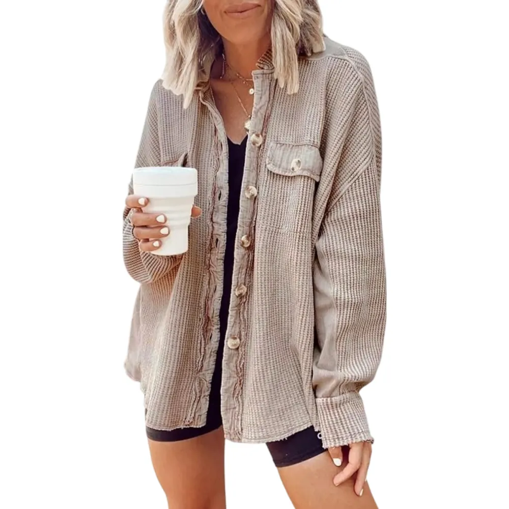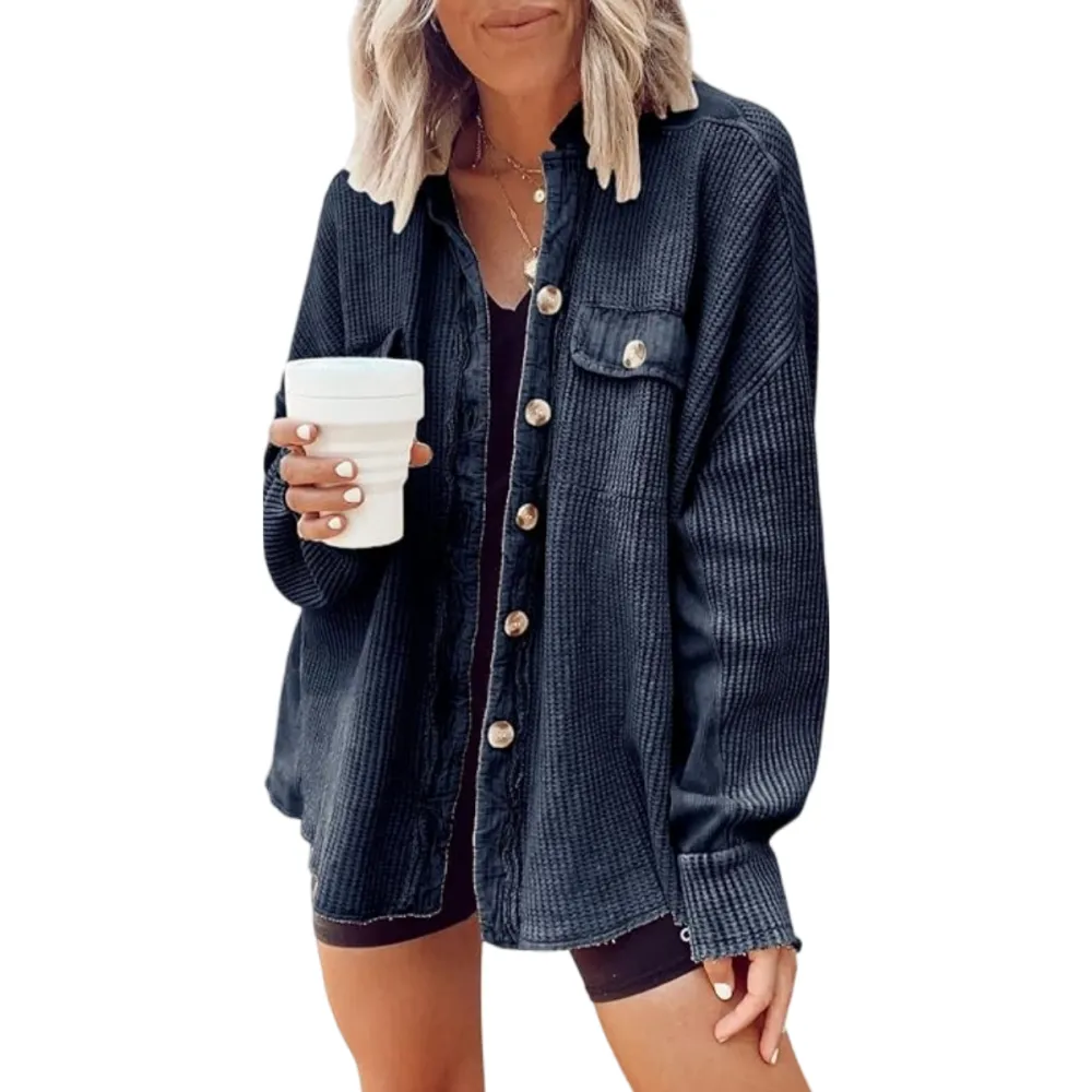 • Women's Loose Fit Batwing Sleeve Waffle Knit Button Down Shirt Shacket Tops