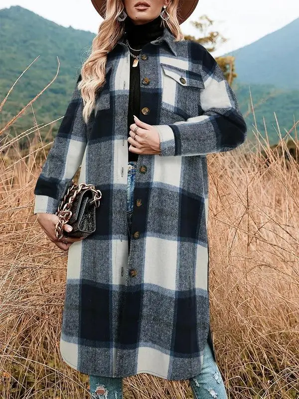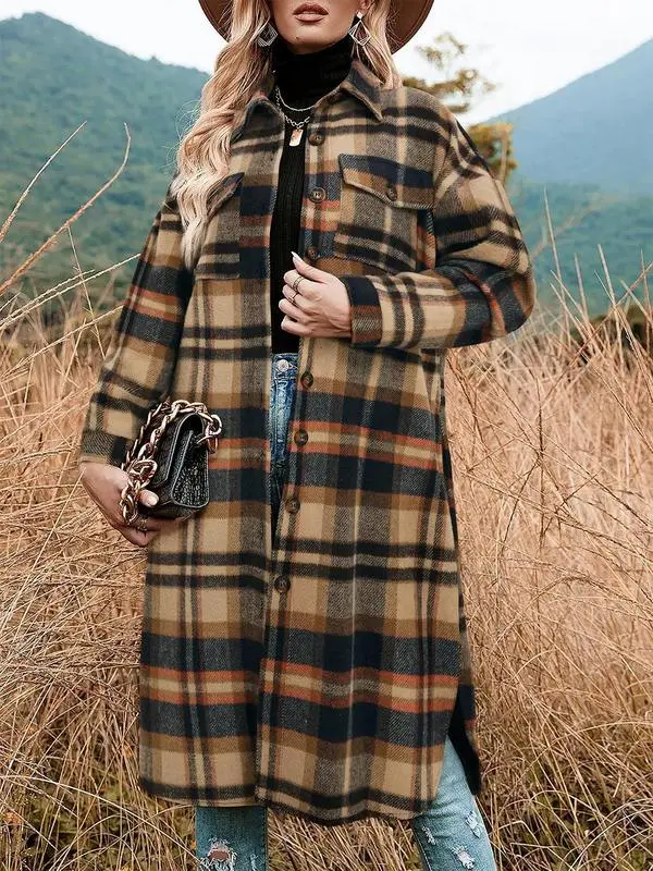 Women's Plaid Print Button Front Split Side Warm Coat, Casual Loose Drop Shoulder Long Sleeve Collared Outerwear for Daily Wear, Women's Clothes