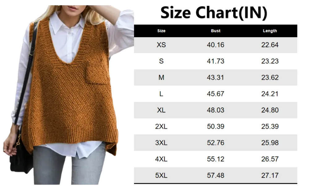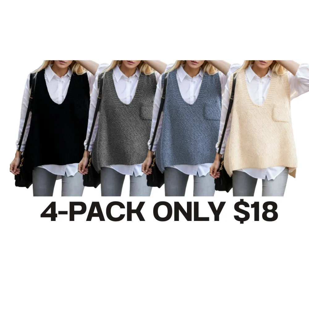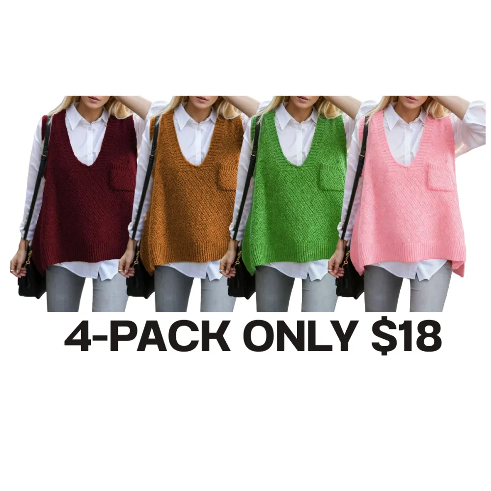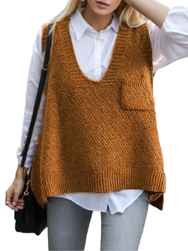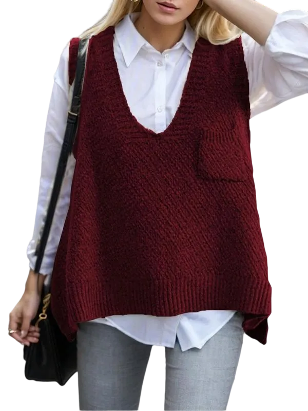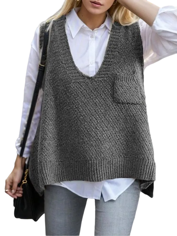 Women's Solid Pocket High Low Hem V Neck Sweater Vest