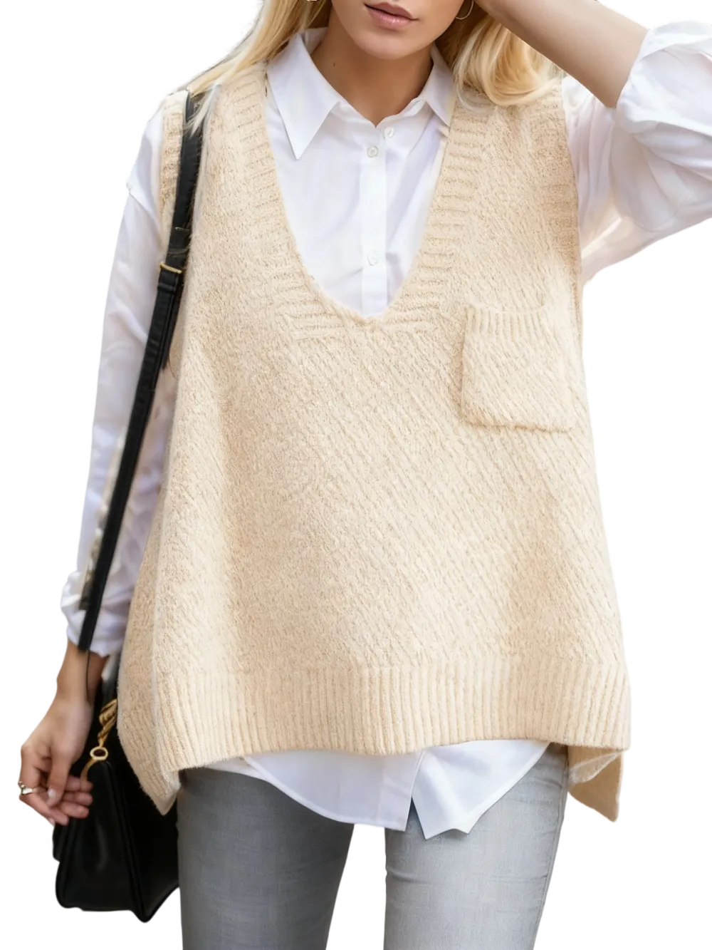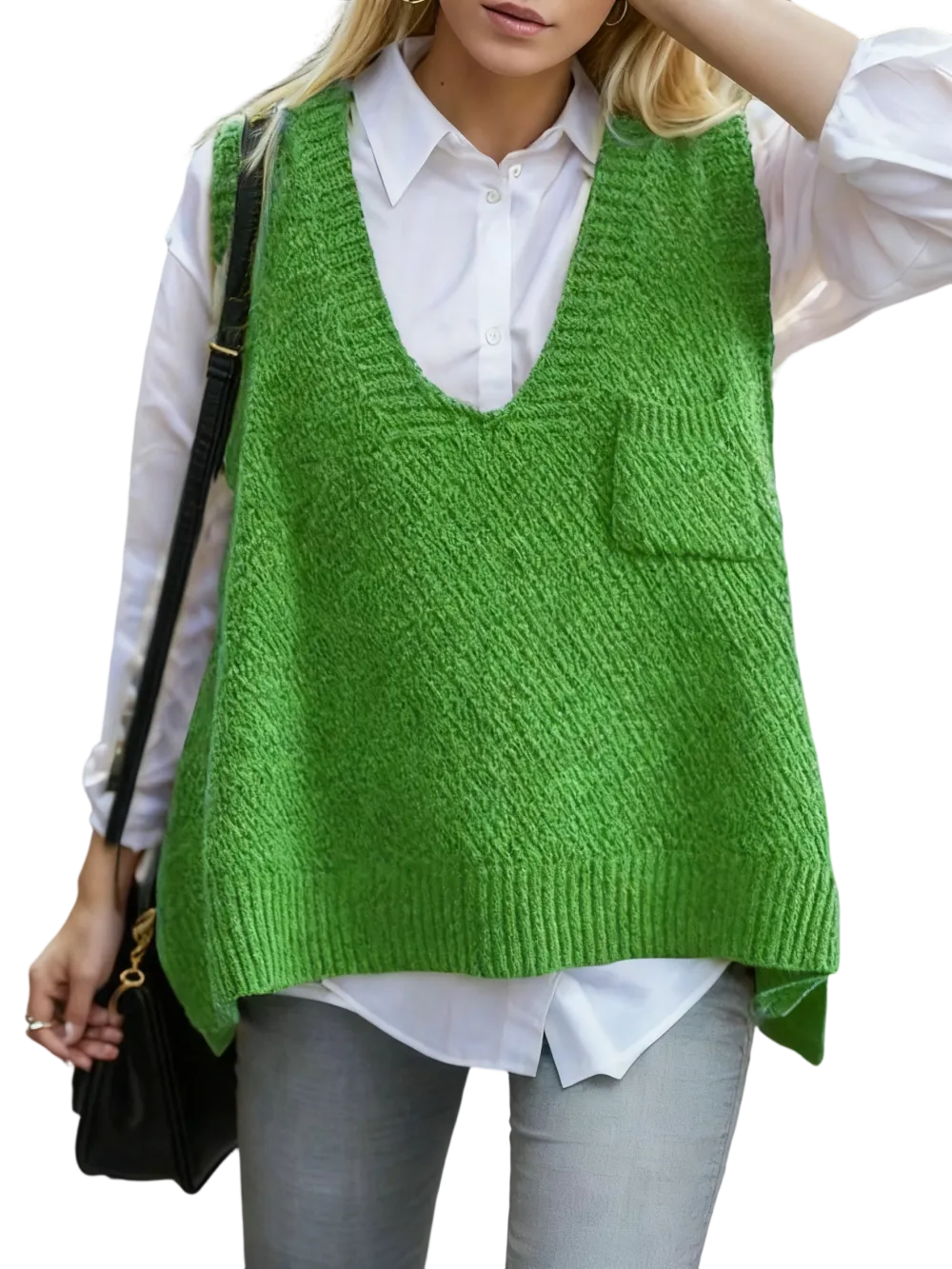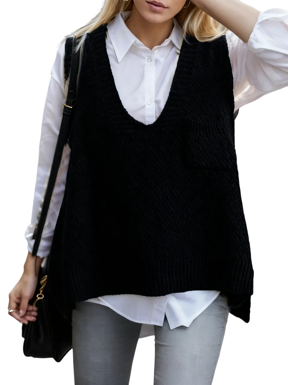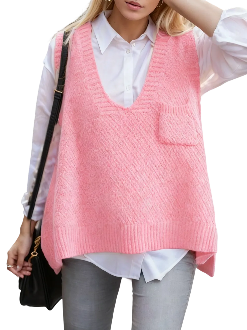 Women's Solid Pocket High Low Hem V Neck Sweater Vest