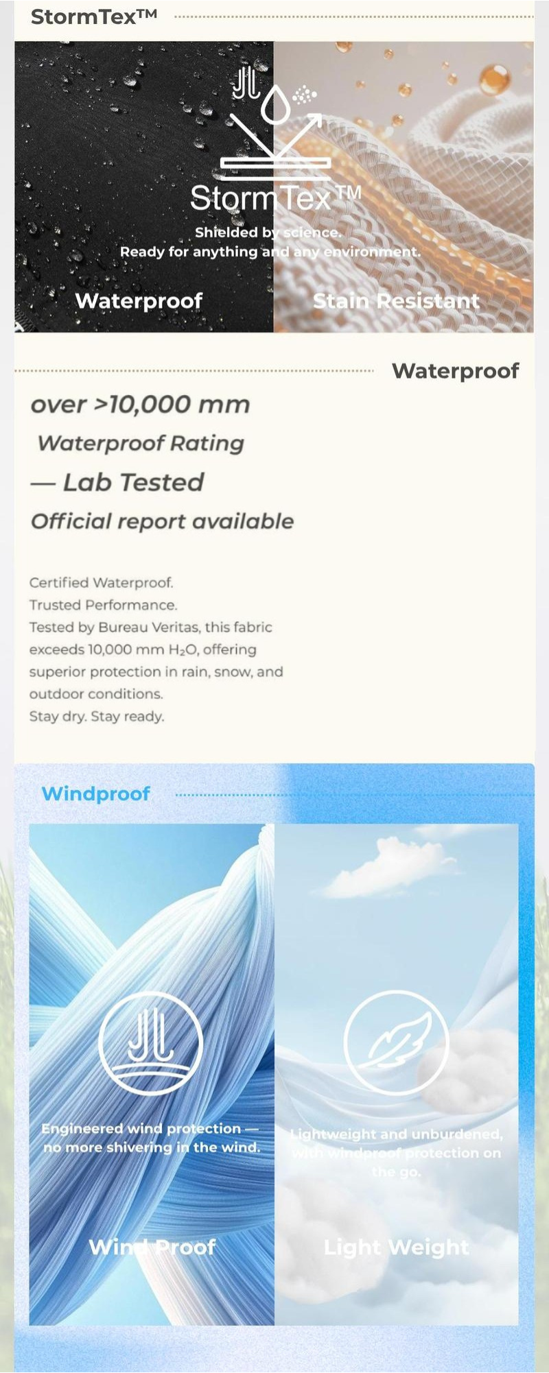 Fabric StormTex (Polyester base + waterproof & breathable coating)