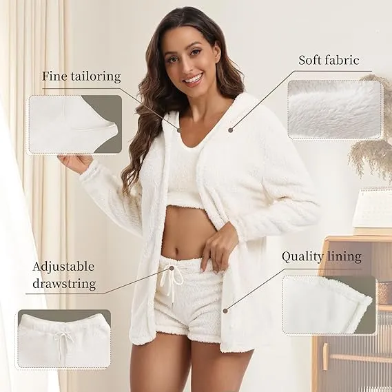 Women's 3-Piece Plush Pajama Set: Drop Shoulder Hoodie, Crop Top & Shorts