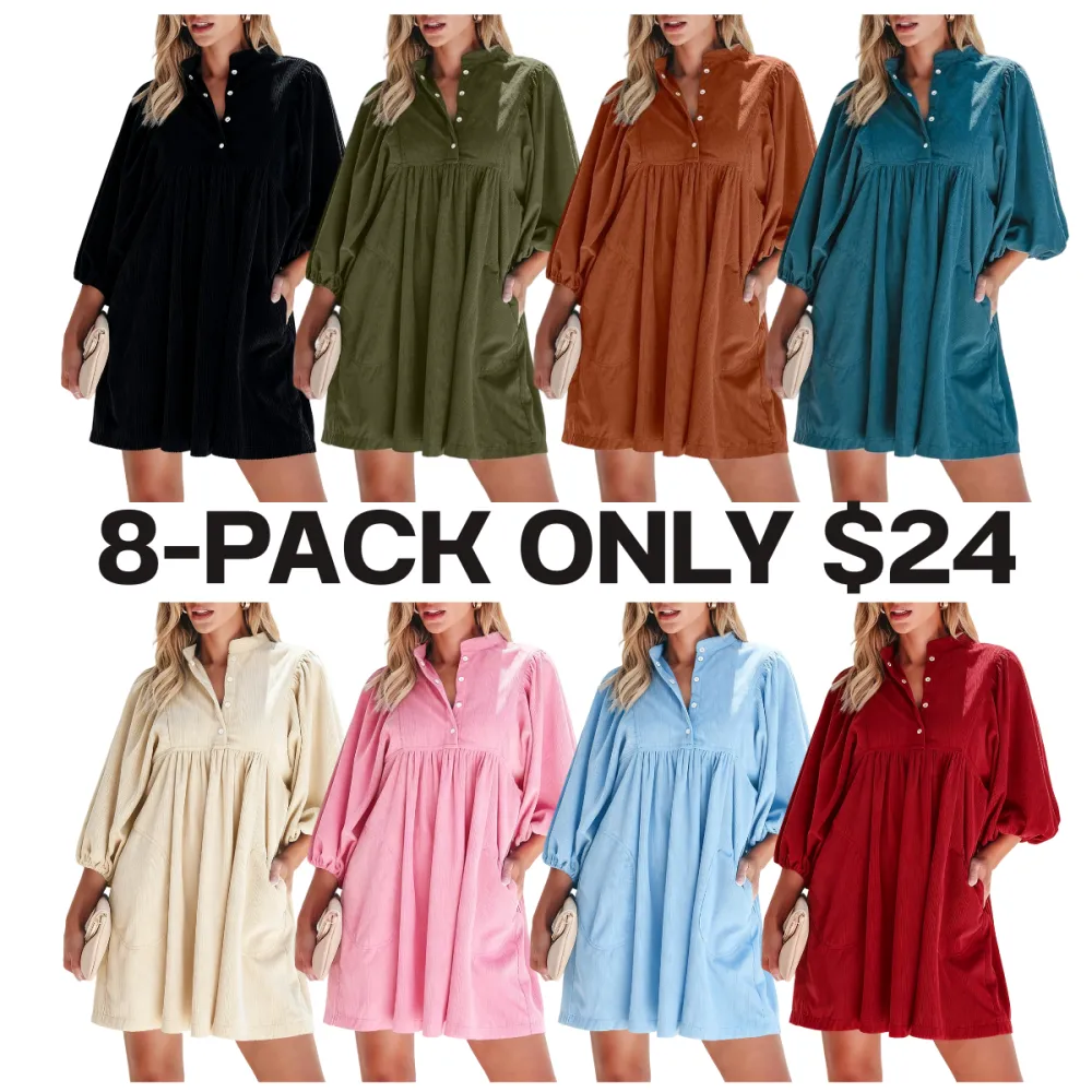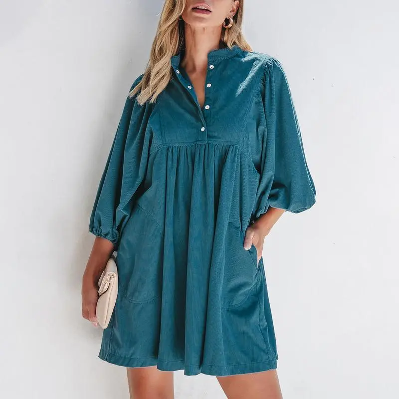 Women’s Corduroy Snap Buttons Empire Waist Bracelet Sleeve Plain Dress with Puff Sleeves