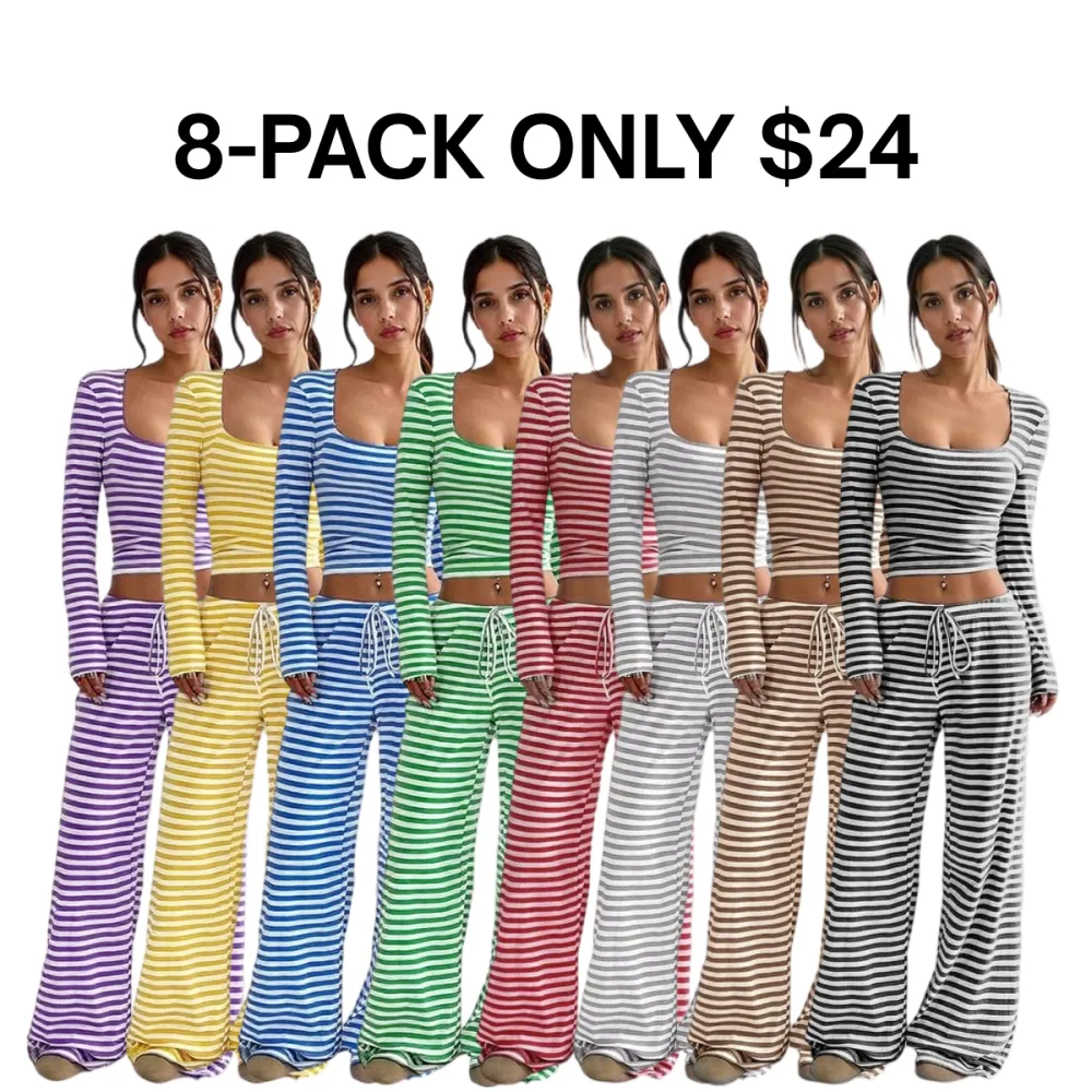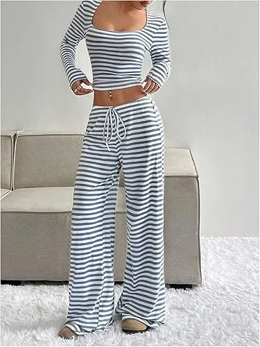 Women's 2 Piece Outfit Striped Square Neck Long Sleeve Crop Tops and Pants Set