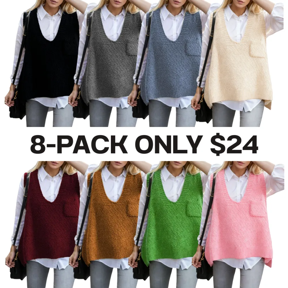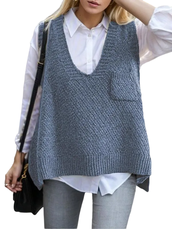 Women's Solid Pocket High Low Hem V Neck Sweater Vest
